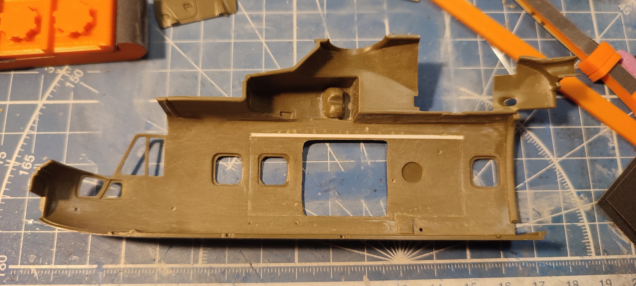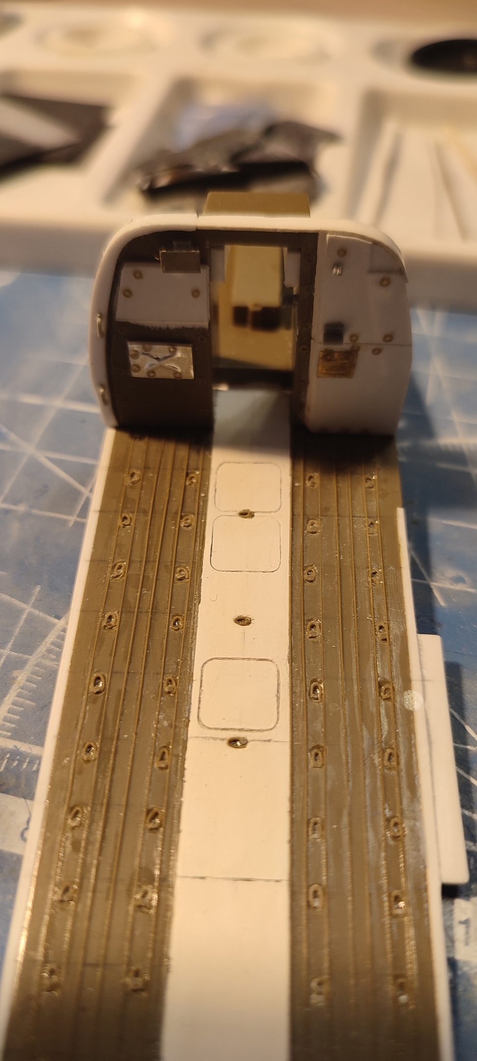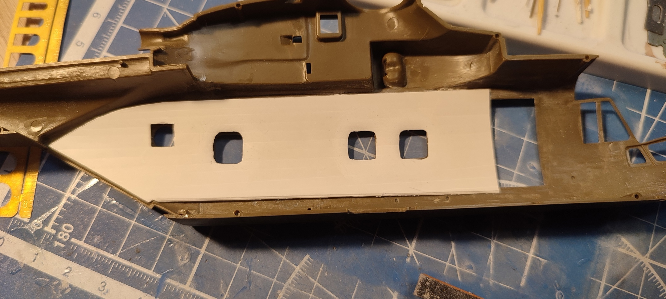 . Среднюю приподнятую часть с лючками сделал из шпаклевки (у большого люка в середине игла соскочила, когда нарезал. Уже в процессе исправления). Продольные ребра по полу - тянутый литник.