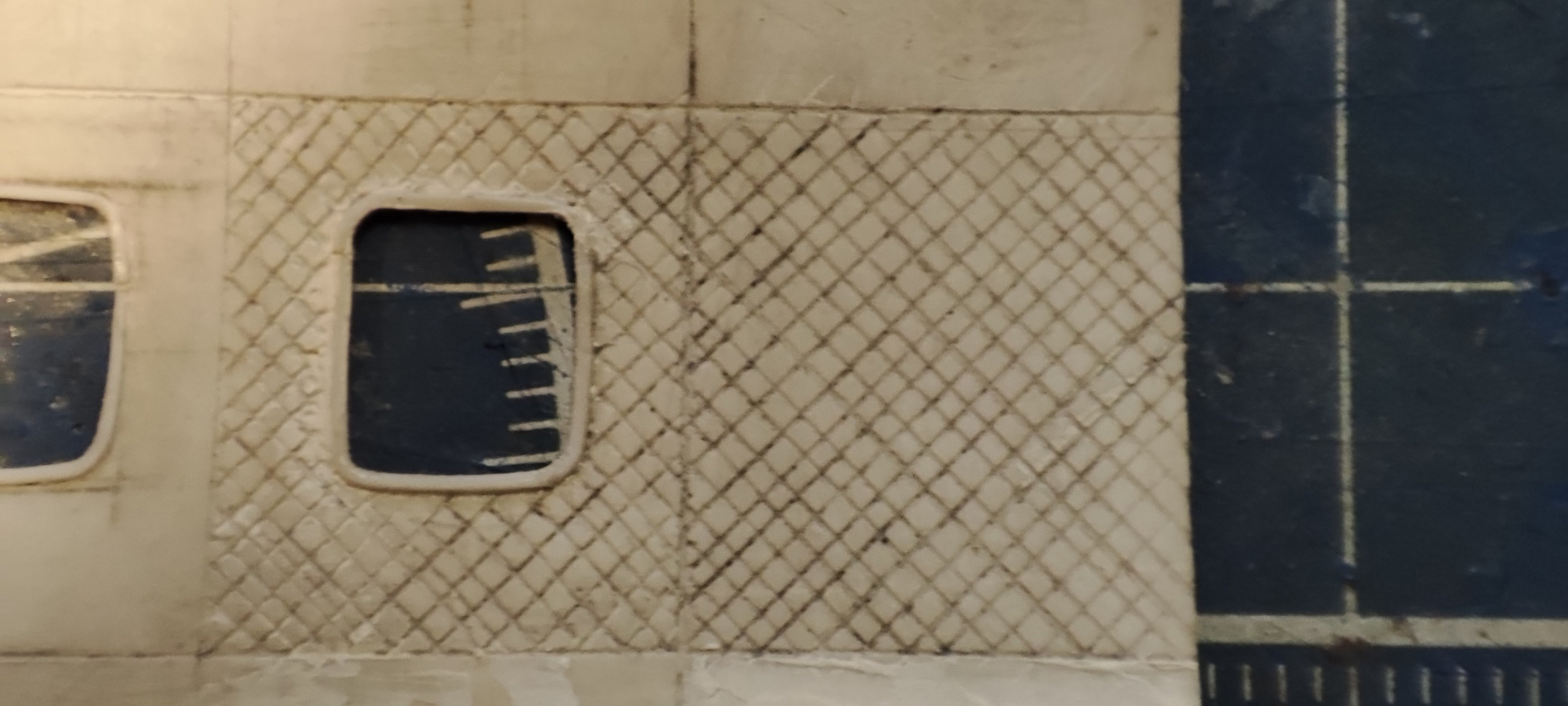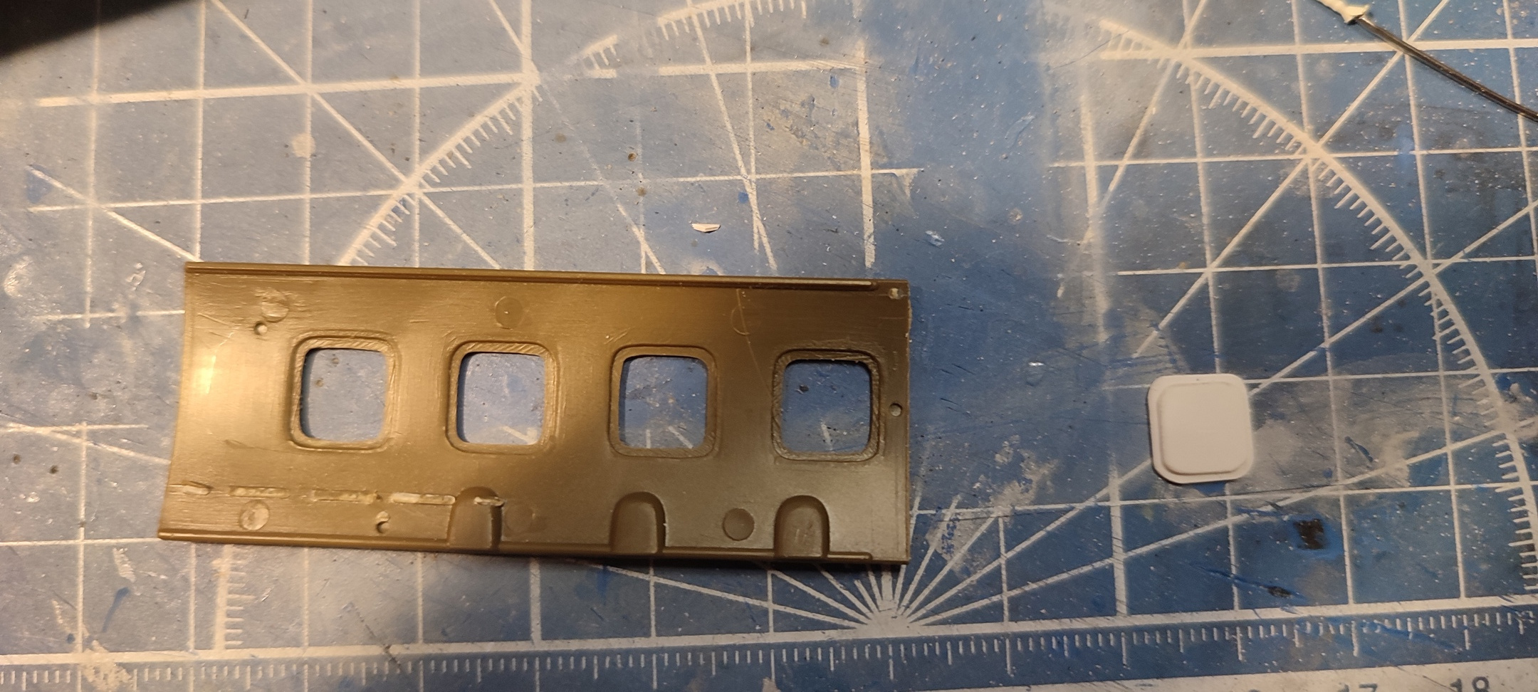 Так. У имеющегося дома шампанского фольга гладкая оказалась, поэтому начал пробовать скрайбером нарезать. Ячейки на прототипе мелкие, в масштабе чуть больше 1 мм. По итогу получилось весьма такое себе + руки кривые не смогли ровно сделать. Но даже если бы было ровно и с учетом последующей проливки для сглаживания углов нет ощущения, что это ткань, которая к тому же крепится внахлест. Поэтому буду искать пленки/фольгу и смотреть, как будет выглядеть с ними. А пока что делаю потолочную панель. Если есть еще советы/рекомендации, готов выслушать)