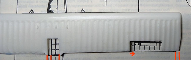 у меня был из серого пластика и вроде не такой ребристый, хотя наверно конечно ошибаюсь за давностью лет... и тут надо пройтись наждачкой - сгладить. а элерон, судя по фото - на месте и это крыло сдвинуто, и его нужно укоротить в идеале, если конечно размах на чертеже в пересчете правильный.
