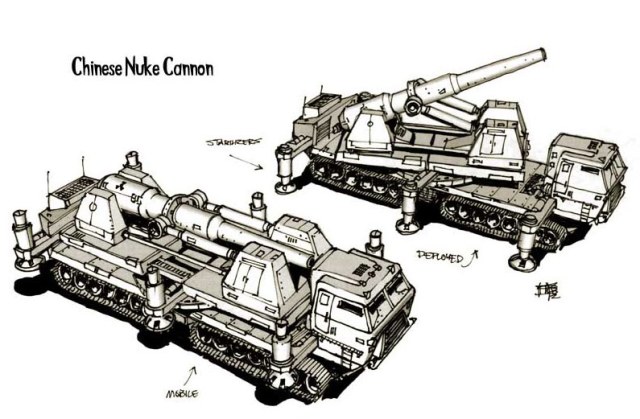и подкинули идею сделать другую модель по генералам. в частности ту адскую пушку или ядерную пушку. Это такая что-то вроде тяжелой САУ фракции Китай с кабиной грузовика на четырех гусеничной платформе, с пушкой, стреляющей ядерными снарядами.Вот так выглядит модель в игре в транспортном положении(платформа раздвинута)