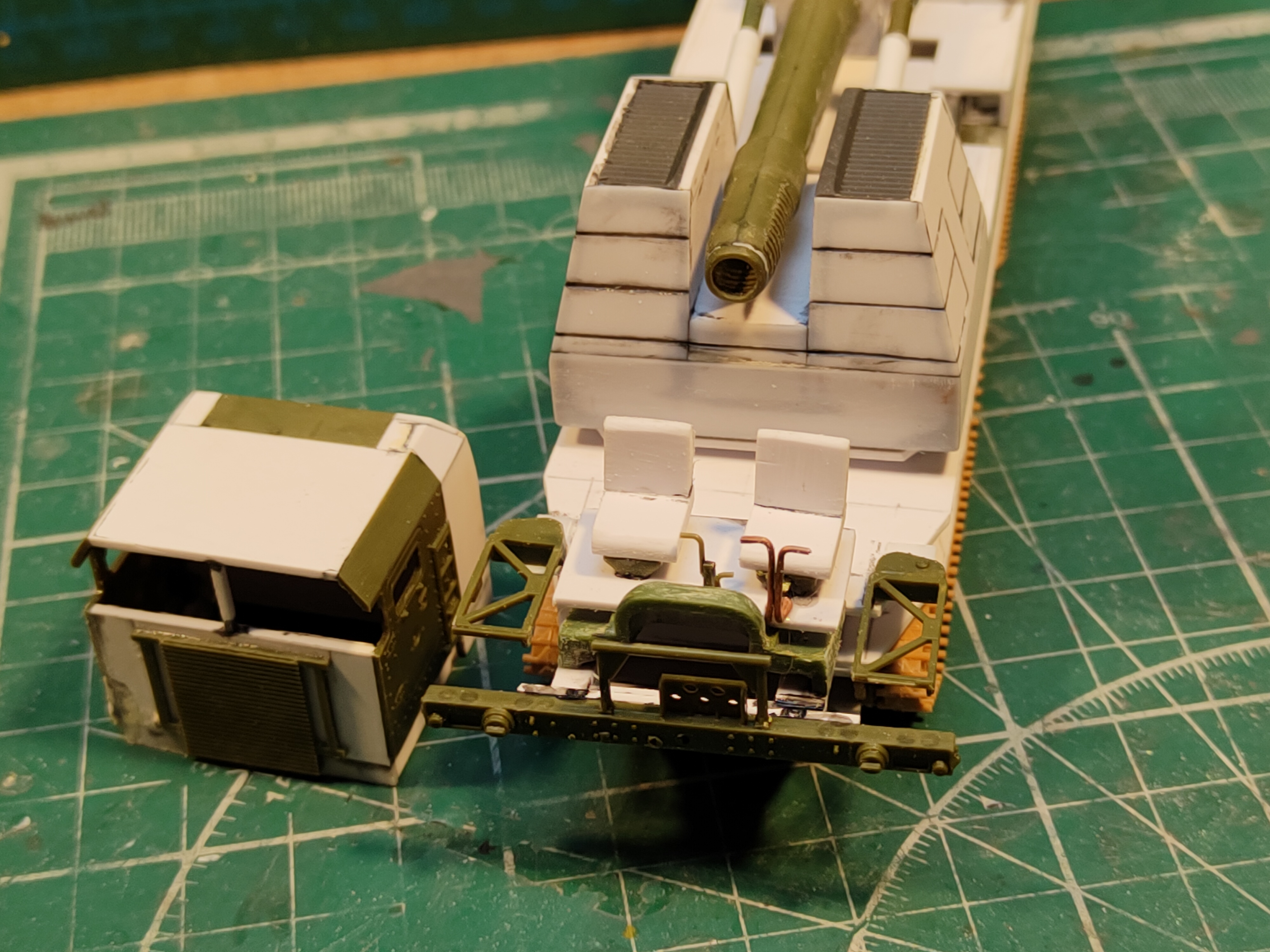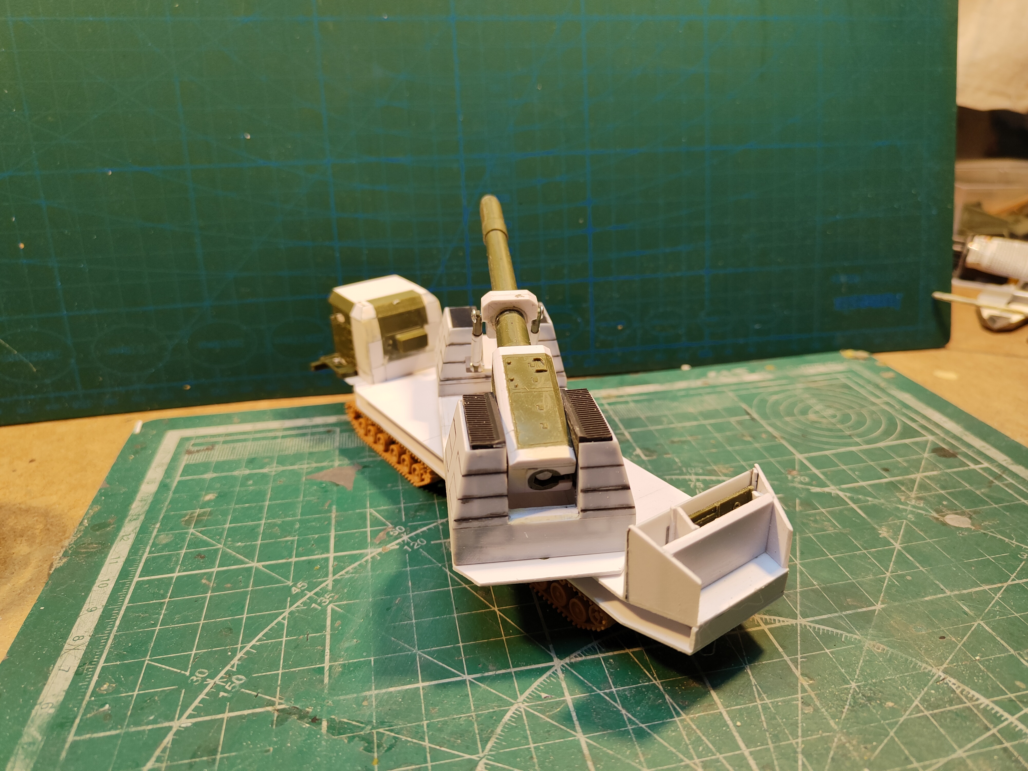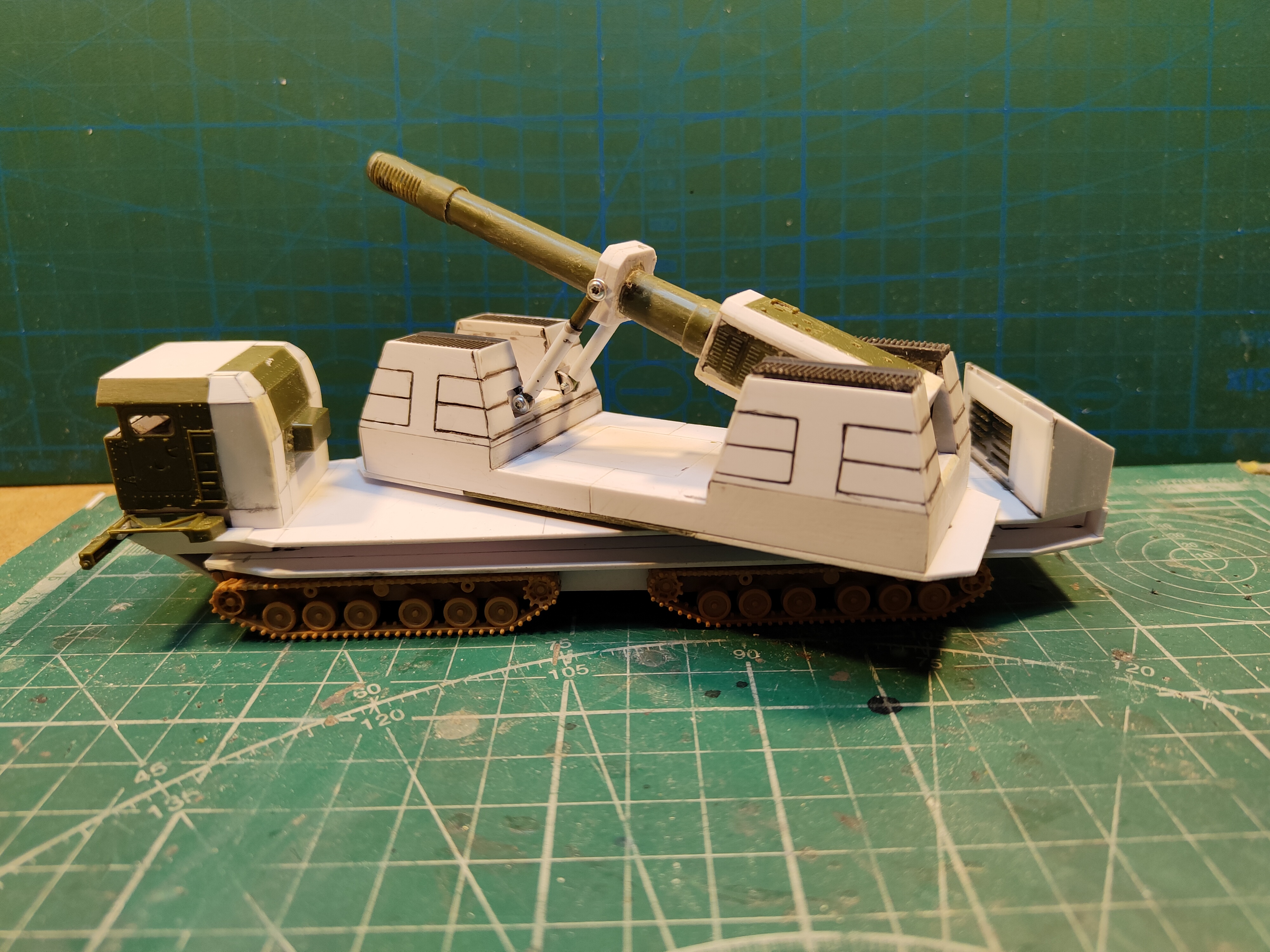 Продолжаю пилить Nuke Cannon. Закончил поворотную платформу(там где шарнир пушки пока вытащена решетка - нужно покрасить, а потом уже собрать), сделал платформу под ней, там планируются подвижные опоры. Так же поставил на родное гусеничное шасси. Запилил кабину и простенький салон. начал прорабатывать задний свес. боковины кабины взял от "Тополя". Так же подножки возле дверей. Потом когда закончу боковую часть надгусеничной платформы, туда можно будет повесить лестницы.