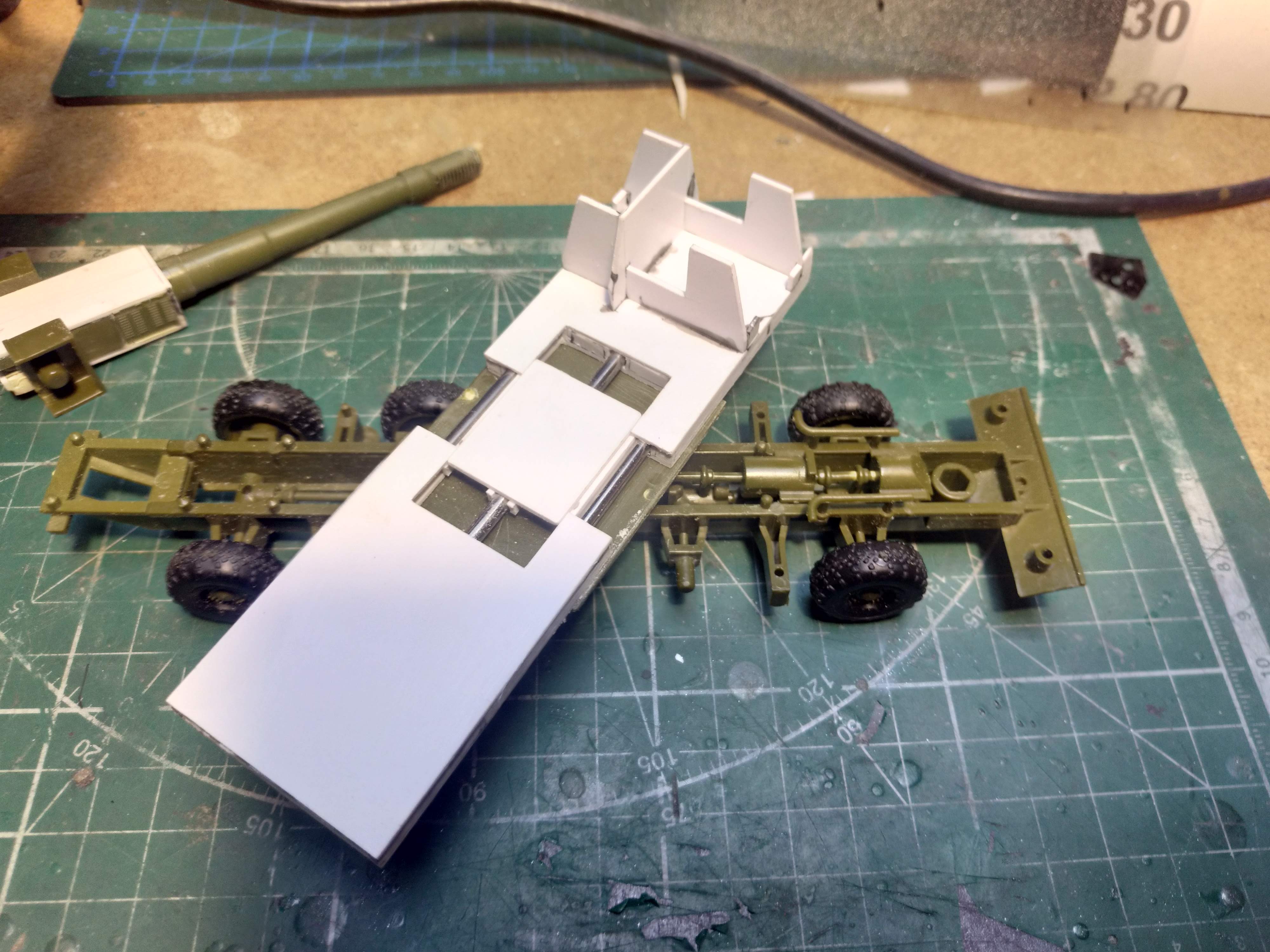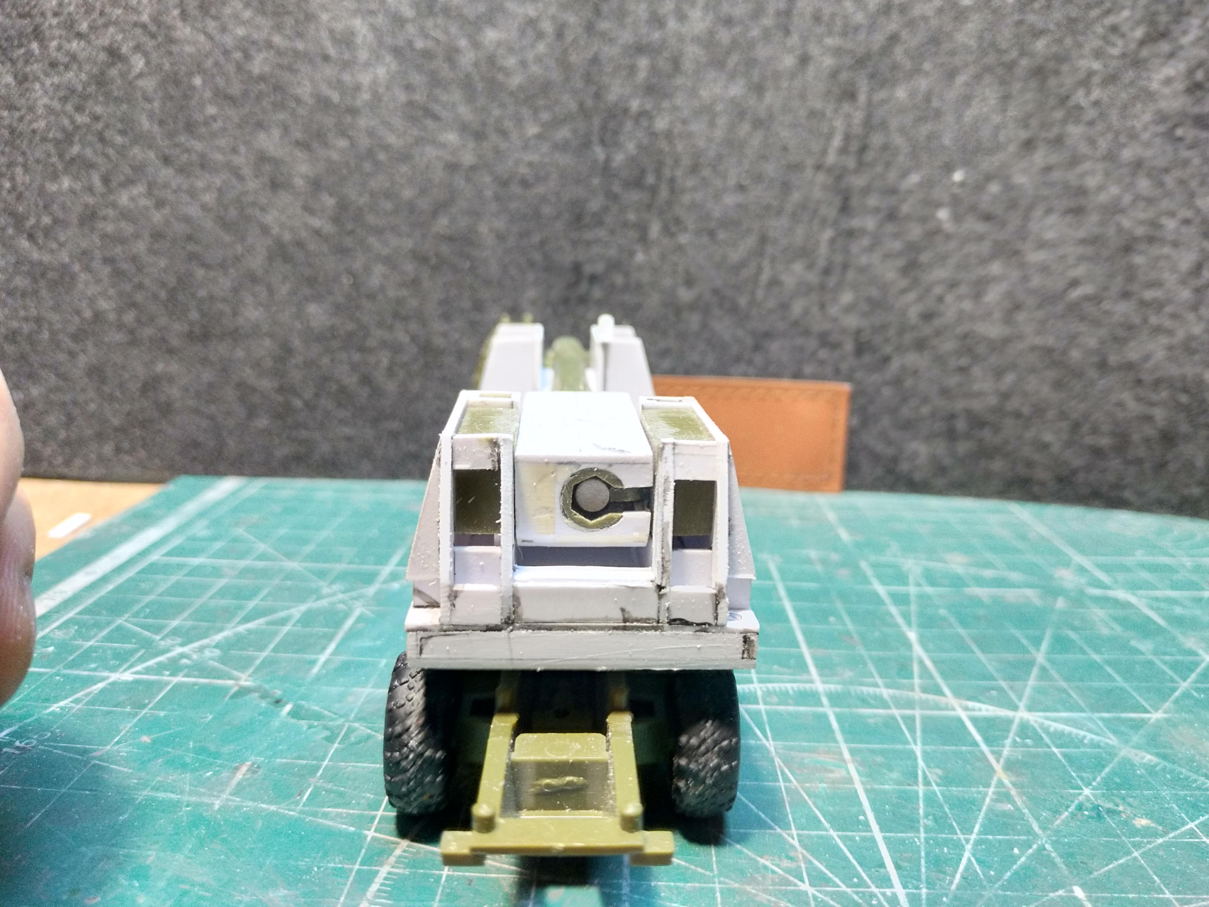 Продолжаю допиливать Nuke Cannon - закончена передняя часть, борта, выносные опоры(правда еще нужно сделать опорные площадки и куда их убирать в транспортном положении), так же немного добавил деталей на верхней части базовой платформы(решетки моторного отделения). Сейчас доделываю заднюю часть, покрашу кабину внутри, поставлю лобовое стекло и можно будет приступать уже к непосредственно покраске. Лестницы пока не ставлю - уж больно они хрупкие, поставлю перед покраской. В общем для эстетики использую запчасти тополя и бредли в основном.