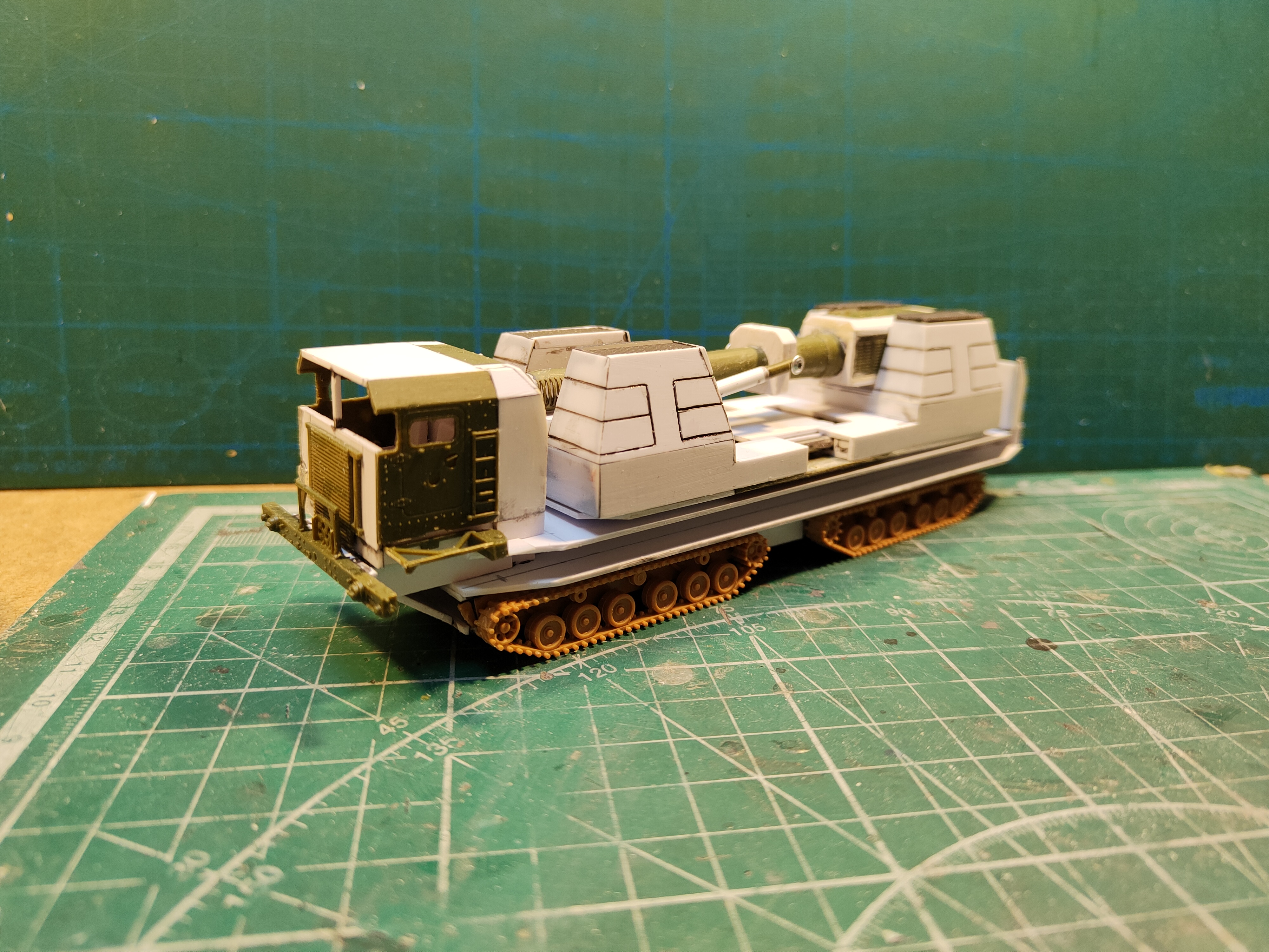 Сделал узоры камуфляжа на платформе с пушкой. Вроде бы неплохо. Правда на кабине третий цвет почти не видно. Наверное придется его наносить в третий раз.