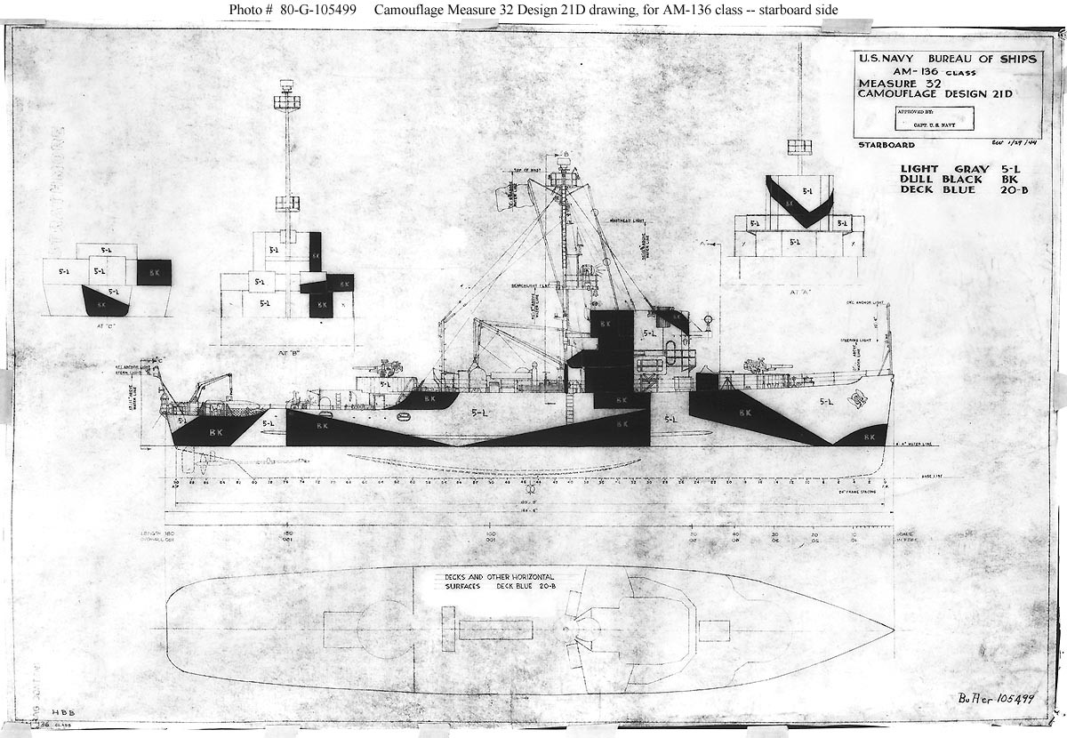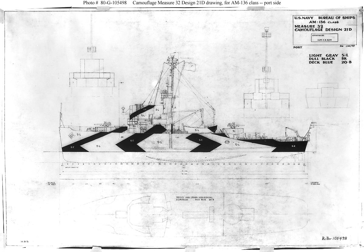 Я хочу построить головной PCE-842 на 1944 год, он один из немногих камуфлированных кораблей этого типа, нес камуфляж MS32/21D (фото тут http://www.navsource.org/archives/12/02842.htm). Официального скетча или фото правого борта нет, но многие из "родственных" тральщиков типа Адмирабл несли тот-же камо, по подписям на официальном navsource.org для тральщика Кандид использовались только 2 из трех цветов, черный и light grey 5-L. Форма пятен берется с фото Augury, Candid, Bond и других тральщиков, где не видно как они распологались на 842ом (http://www.navsource.org/archives/11/02149.htm, http://www.navsource.org/archives/11/02301.htm, http://www.navsource.org/archives/11/02303.htm, http://www.navsource.org/archives/11/02137.htm, http://www.navsource.org/archives/11/02152.htm, http://www.navsource.org/archives/11/02154.htm).