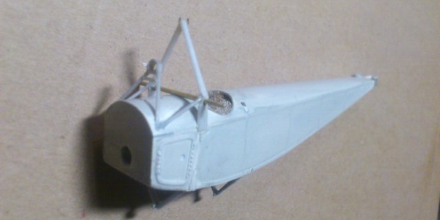 Вернулся к фюзеляжу. Снял переднюю, до середины, верхнюю част и приступил к кабине. Пол и борта из 5 и 3мм пластика соответственно. Брус квадратного сечения вырезал из 5мм пластика. Растяжки проволока.