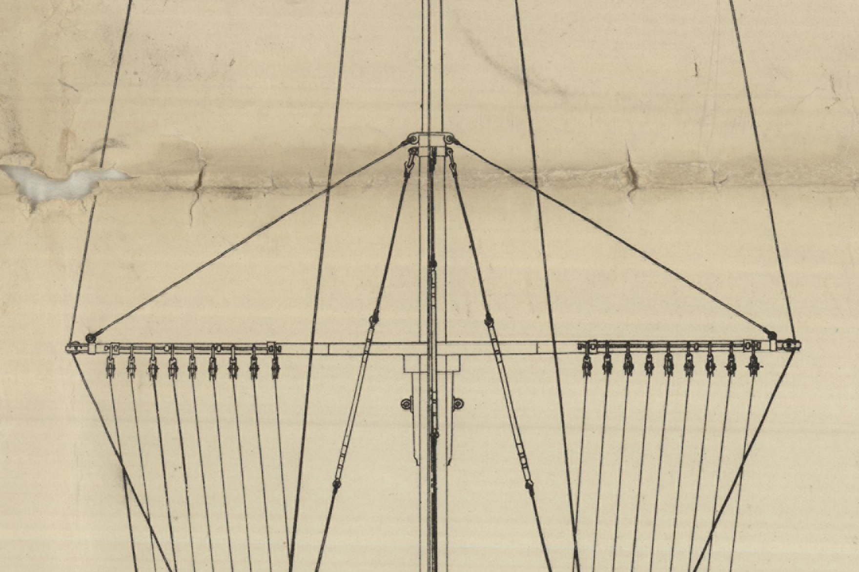 Всё, что вижу, это то, что конструкция напоминает каркасный стень-салинг, встроенный в эзельгофт мачты. Есть даже путенс-ванты внизу конструкции, схожий отведённый в корму силует краспиц. Тогда порванная растяжка слева - это стень-ванта, шедшая к этому салингу и которая была продолжением путенс-ванты. Но! Но это - чисто предположение.