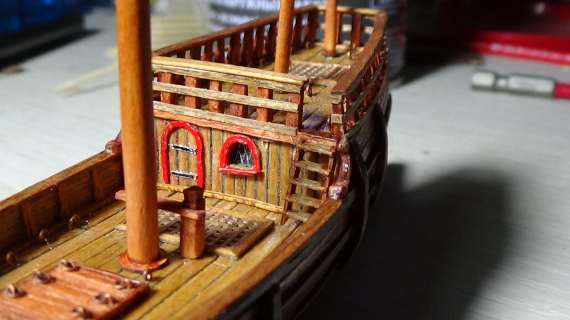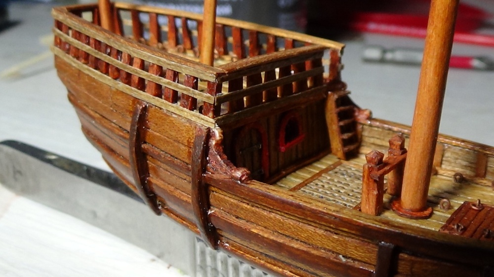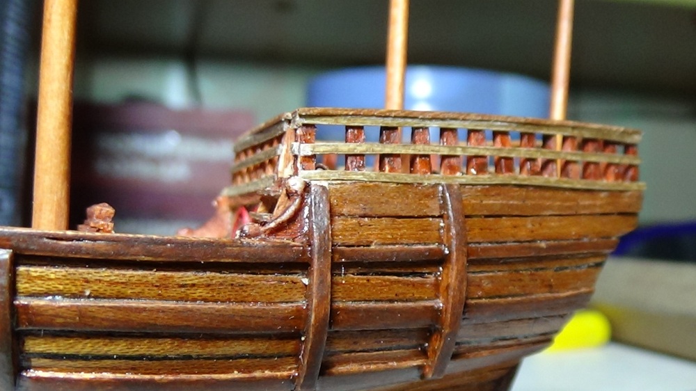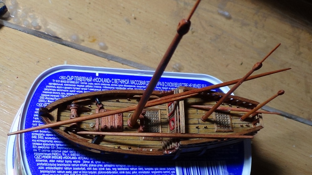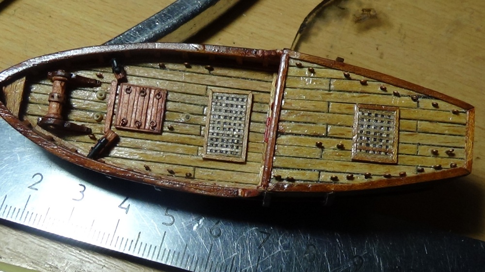 Симпатично получается, только брашпиль переверните длинными упорами в нос, здесь схемы Amati неверны, и как-то нужно с блеском бороться. Возможно пройтись мелкой (000) стальной ватой, по маслу помогает, как будет по лаку сказать не могу.