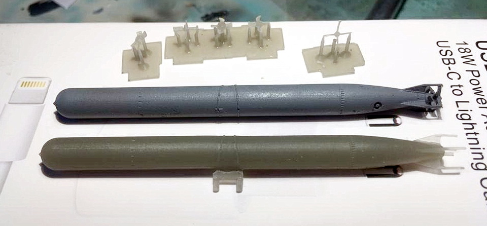 Что касается торпеды, то, если не ввязываться в перепил (что я решил не делать), то, на мой взгляд, уровень торпеды из набора примерно соответствует уровню модели в целом. И тогда заморачиваться с одной конкретной, пусть даже очень хорошей, деталью вряд ли целесообразно.