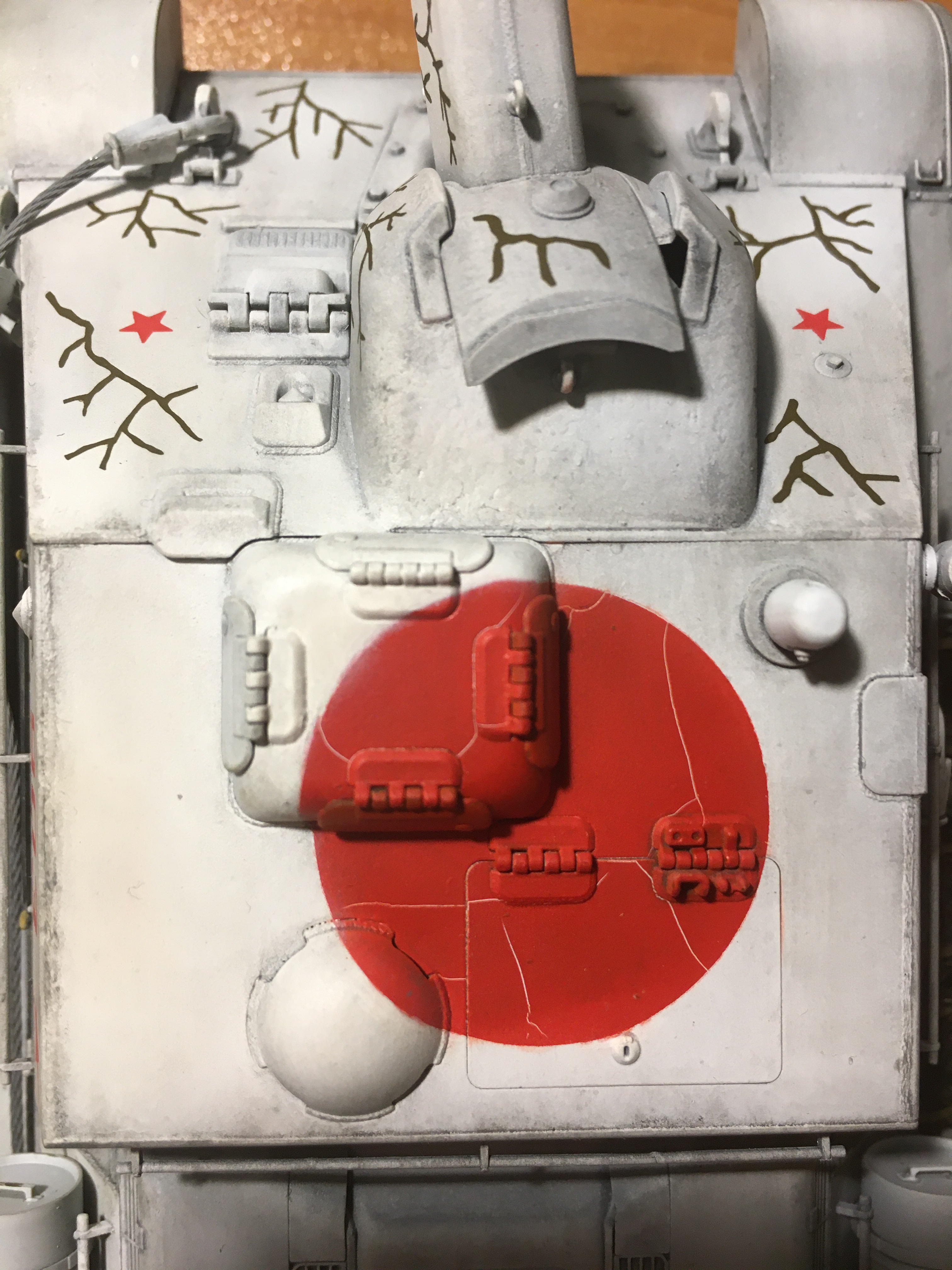 Добрый день! Решил посмотреть сделанную года 1,5 назад модель су-122 и обнаружил странный эффект - потресканная нанесенная краска. Такого я еще на своих соделях не наболюдал. Коккелюр какой то. Красил белой акриловой тамией XF-2, красный цвет X-7 RED GLOSS, смывка черная тоже тамия. Как можно исправить ?