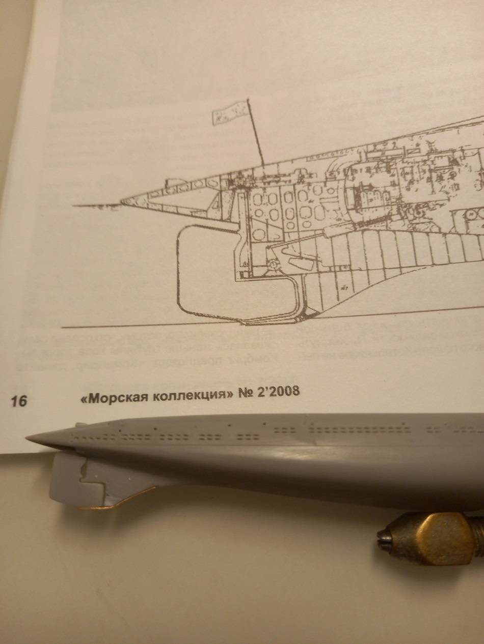 Вот что сделано: сняты щиты ТА, сделан первый отсек прочного корпуса с торпедными трубами, переделан рудер-пост, прорезаны мини-стамеской шпигаты - но не насквозь, а только углублены миллиметра на полтора.