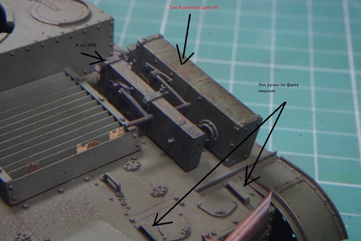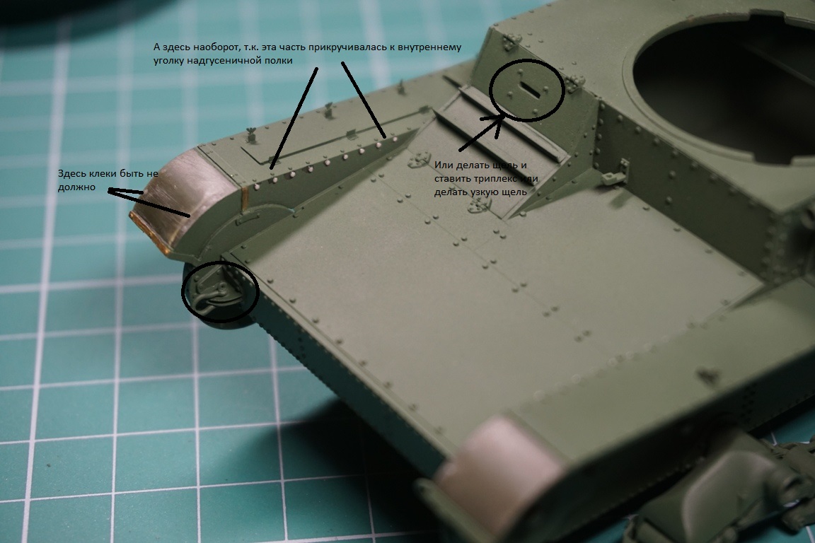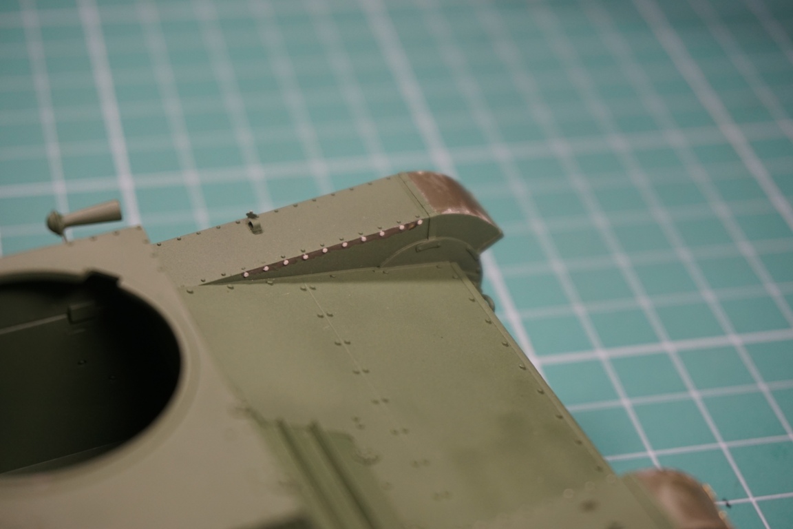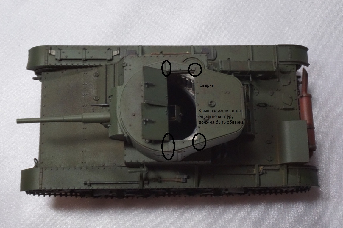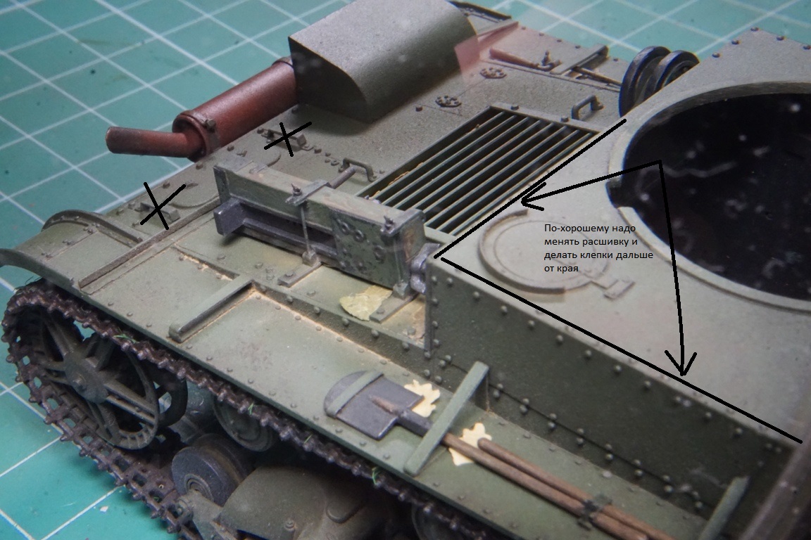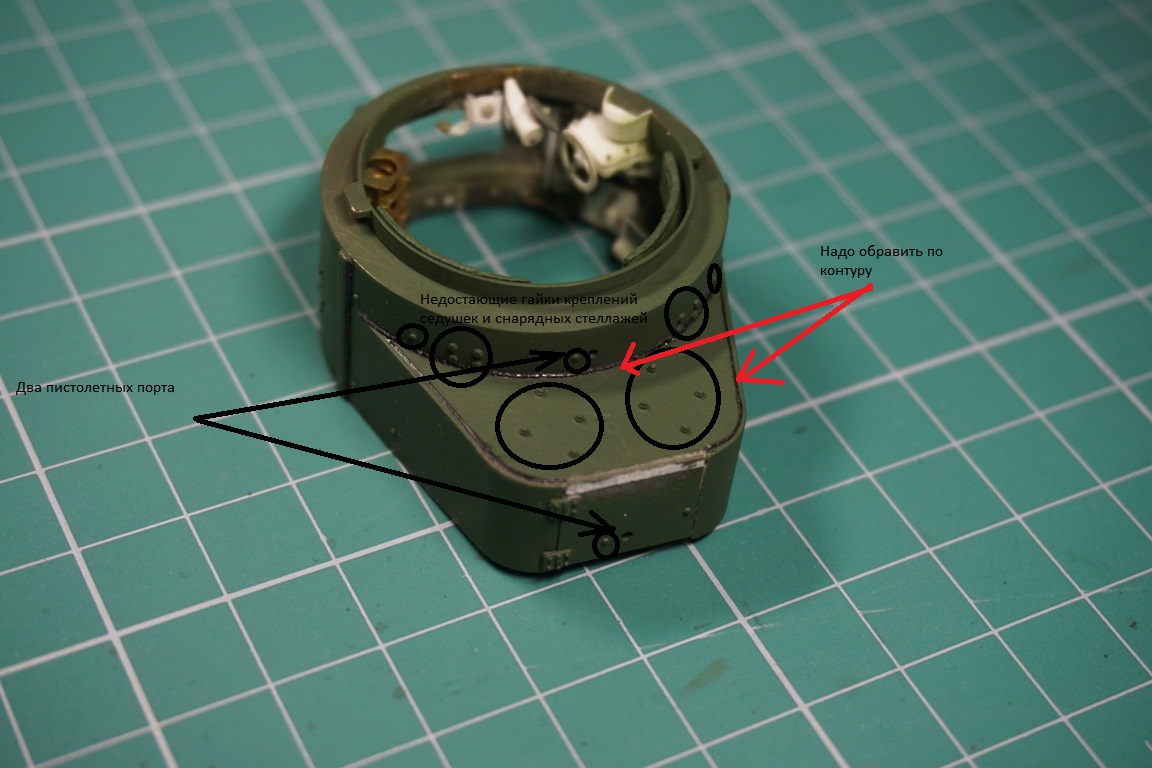 На подбашенной коробке надо делать расшивку. Там боковые листы и верхний подбашенный проклепывались с внутренним уголком. У ХБ клепка дана слишком близко к краю, а верхний лист в стык с боковыми. Без сноса этой клепки расшивку не сделать. Я этот косяк заметил уже после покраски, поэтому оставил как есть (только с боковой расшивкой, как сейчас у тебя).