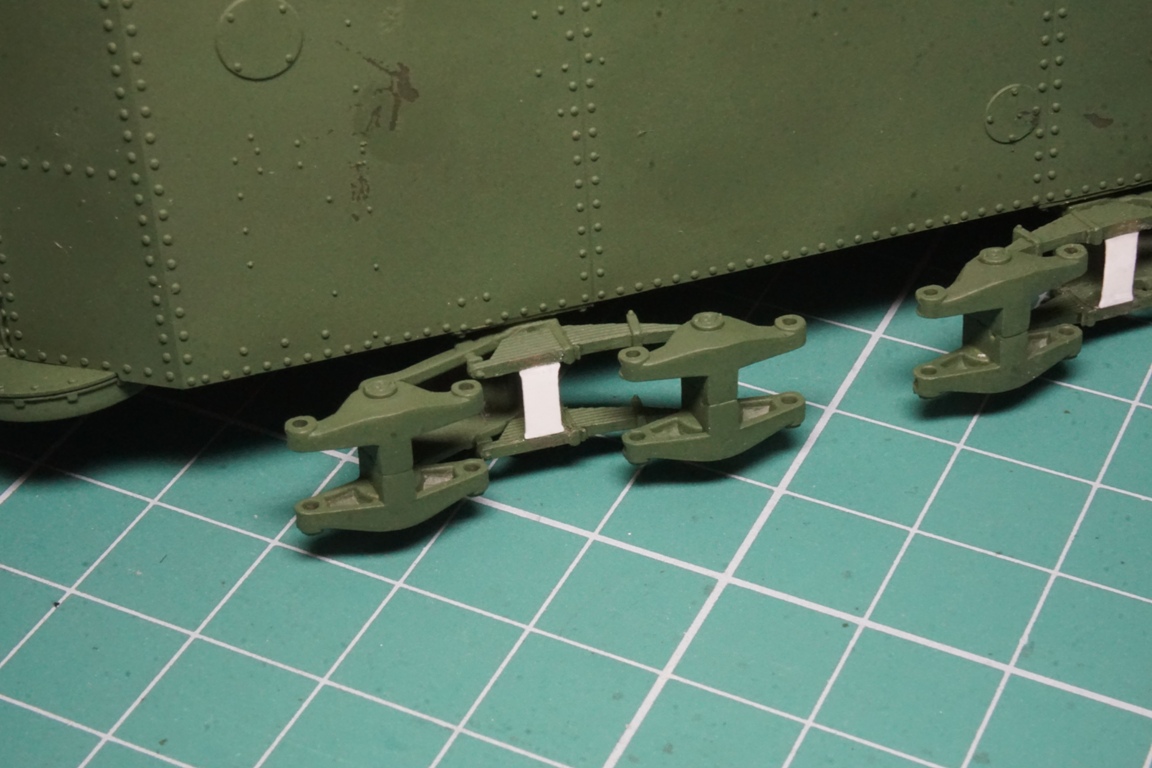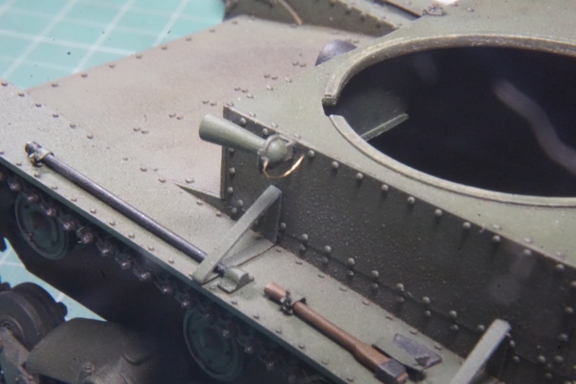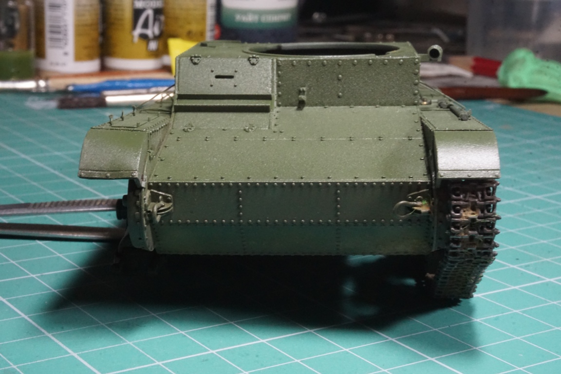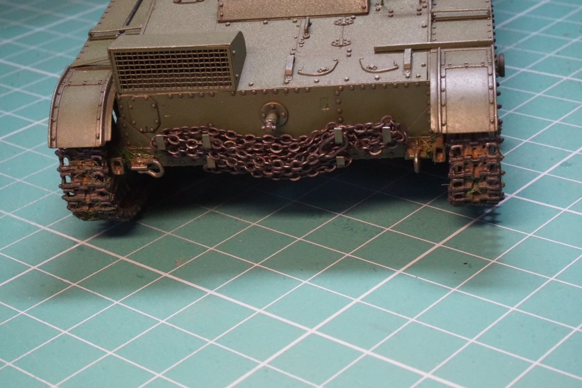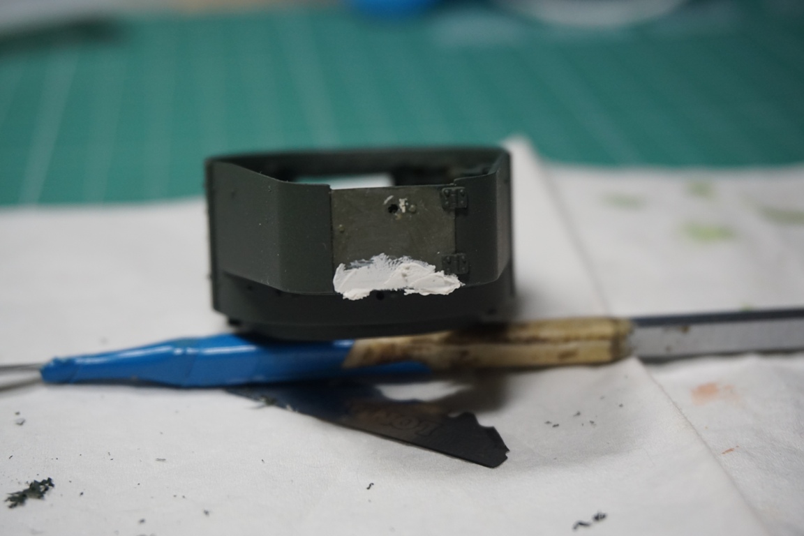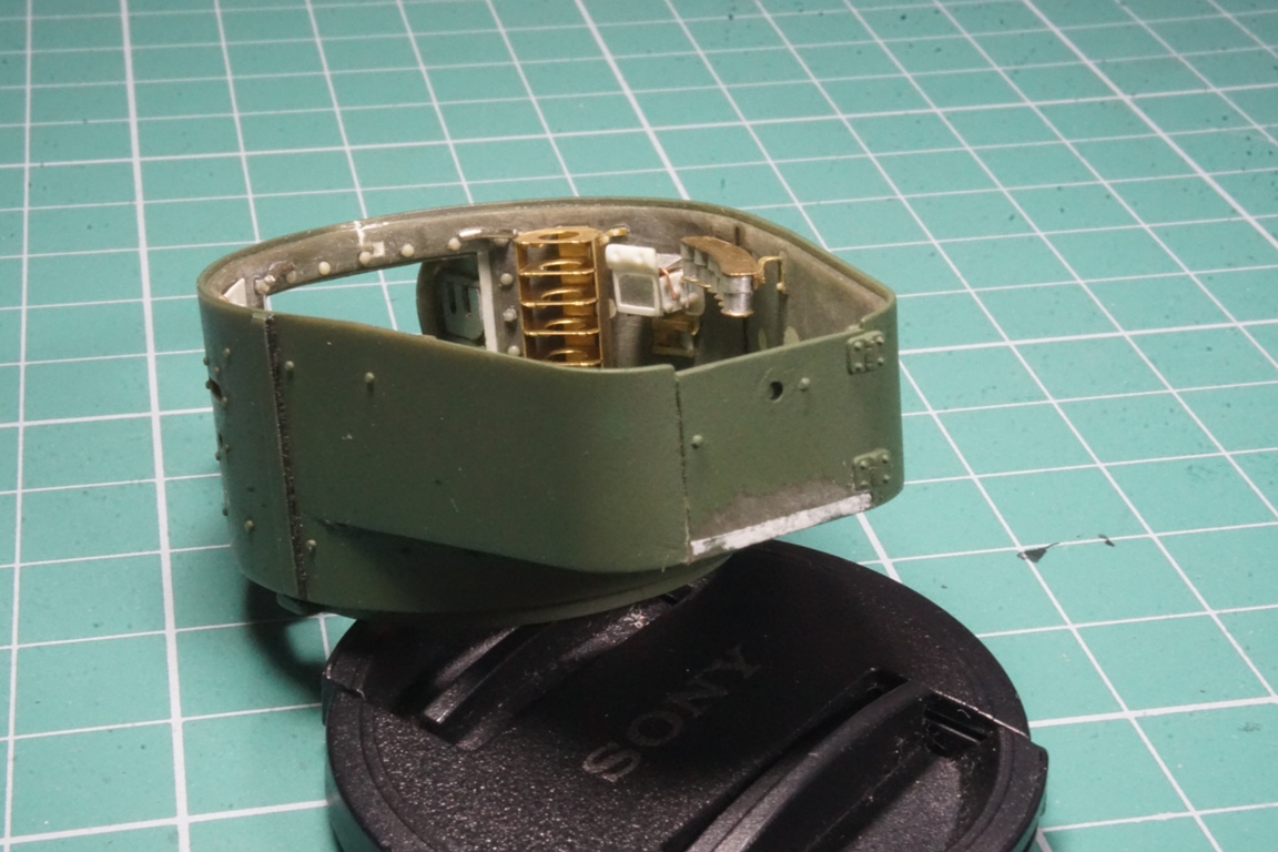 На подбашенной коробке надо делать расшивку. Там боковые листы и верхний подбашенный проклепывались с внутренним уголком. У ХБ клепка дана слишком близко к краю, а верхний лист в стык с боковыми. Без сноса этой клепки расшивку не сделать. Я этот косяк заметил уже после покраски, поэтому оставил как есть (только с боковой расшивкой, как сейчас у тебя).