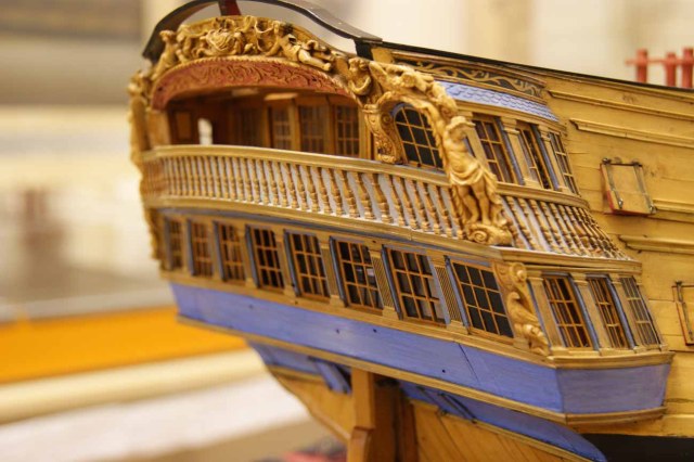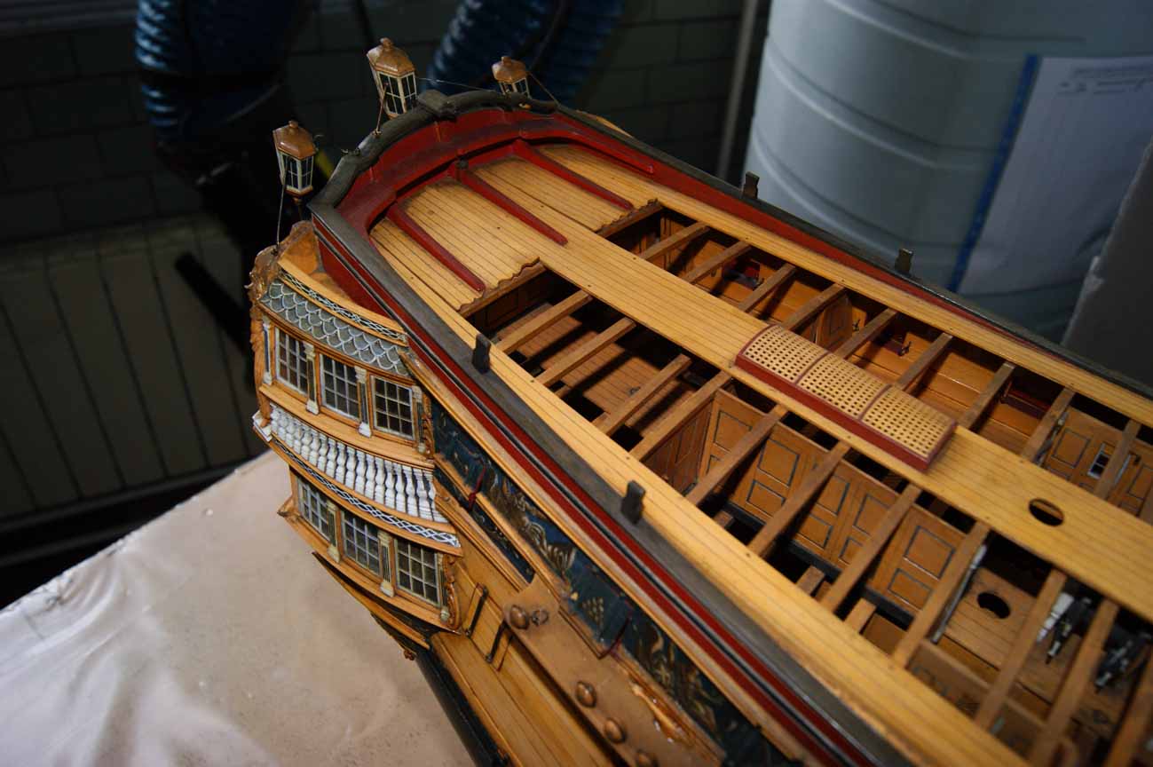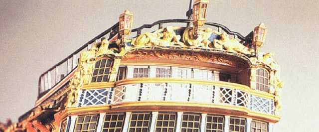 Интересны так же бочки для питьевой воды на чаках квартердека - люди вне боя в основном работают наверху, с парусами, и тоже хотят пить. Обратите внимание на типичные английские курятники - они, в отличии от классических континентальных, многоэтажные. Нетрудно заметить козу на первом плане - ясли для крупного скота находились на шкафуте (при конструкции корабля, как на картине). И уж совсем нетрудно заметить, что сразу несколько офицеров, в числе которых минимум два - высших званий, находятся у... левого борта корабля.