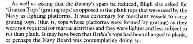 [7] "Gratten tops". Gratten переводиться как жнивьё. Жнивьё это солома, оставшаяся на корню после жатвы. Другими словами марсы должны были сделать из множества тонких брусков.Николай Шишлевский написал:Я думаю, что марсы на "Баунти", после их переделки имели конструкцию решётки из дубовых реек, установленных в ряд, с определённым интервалом между ними.