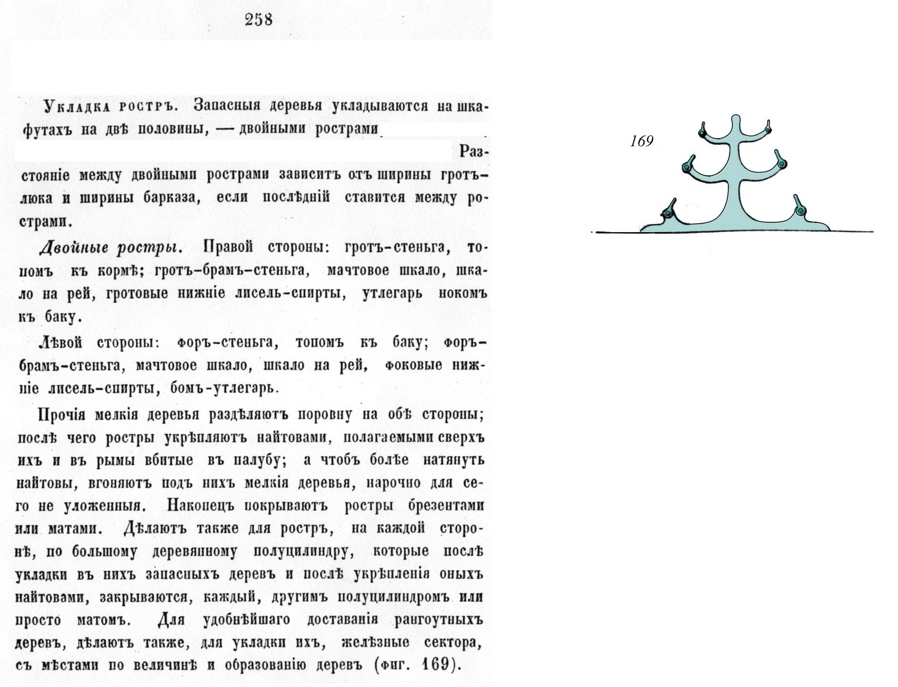Про ”Морскую службу в Англии”, соч. Гласкока перевод кап.2-го ранга Корнилова. 1839. Могу сказать следующее. Само название, этого сочинения, говорит о том, что здесь идет речь об укладке запасного рангоутного дерева на действующих кораблях английского флота, а не на строящихся или ремонтирующихся кораблях. Хороший перевод. Очень грамотно всё расписано. Возьмите на вооружение, пригодиться. Дополню нарезку Игоря, полной страницей 258 для последующей ссылки на неё, чтобы показать, что из себя представляли железные сектора на рисунке 169.