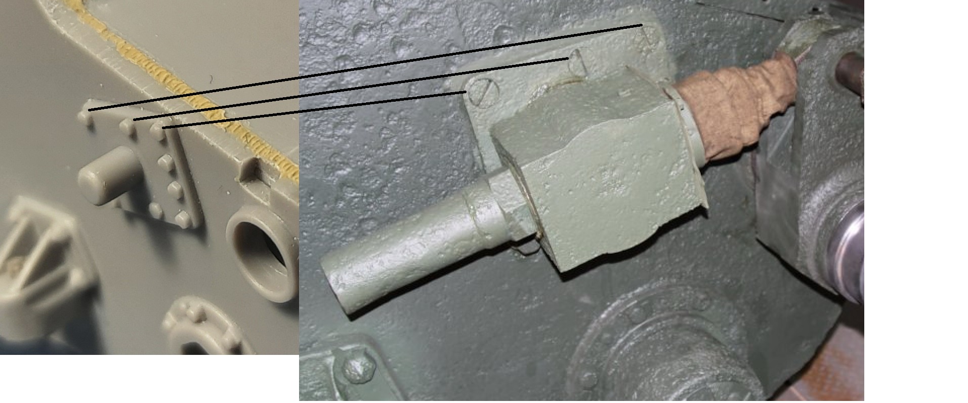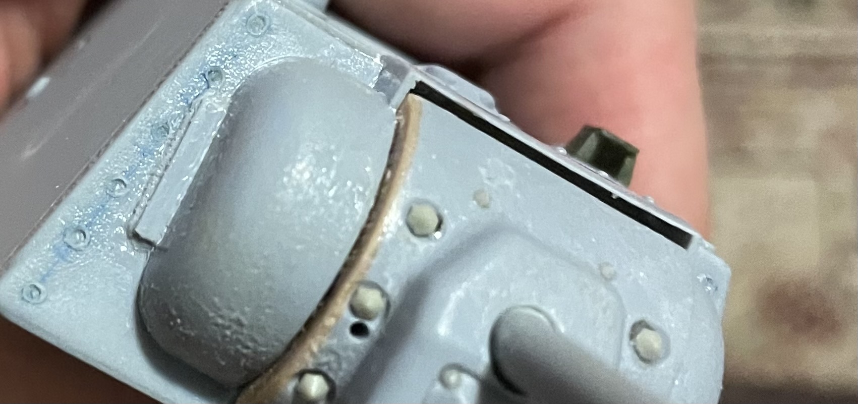 Двигаемся потихонечку по башне. Просмотрев кучу фото, пришел к выводу что крыша башни все таки в шип соединялась и вокруг пулеметной установки есть очень массивное кольцо усиления. Пример на фото. Ничего умнее не придумал, как скрестить бульдога с носорогом) Собственно низ башни из набора Трумпетер 000357, а верх 000358. Далее вклеил детали под установку бронировки смотровых приборов, высверлил в них родную имитацию винтов и заменил их на винты от Э.В.М.