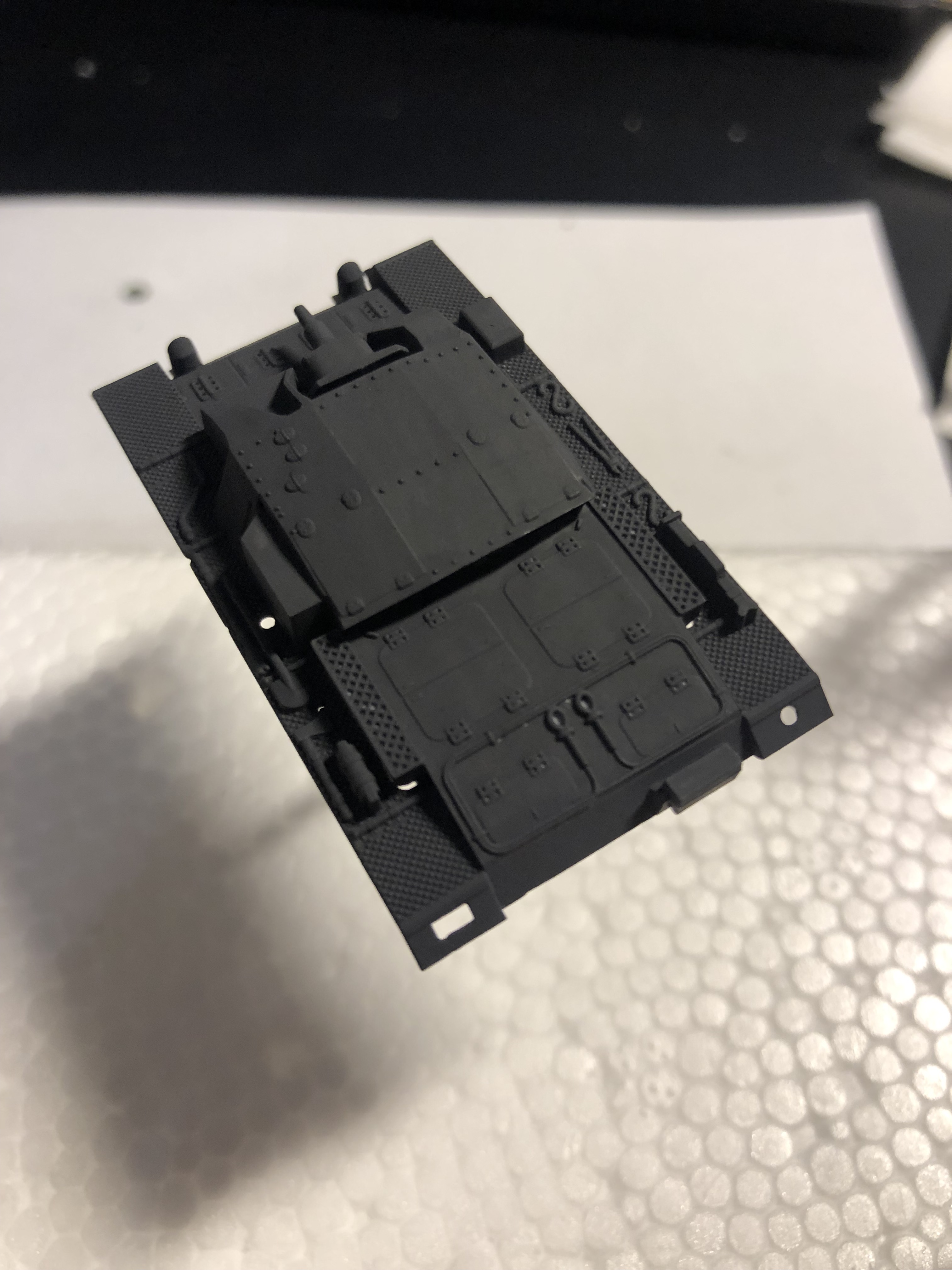 База нормальная. Можно сделать высветление, но не сухой кистью, гусеницы - намешать темно серый ( и добавить "по вкусу" металлик потемнее) с коричневым, потом сухой кистью какой нибудь металлик (не темный, но и не слишком светлый) или просто под завершение стройки натереть грифелем карандаша. Смывку на глянцевый лак, жидко жидко разведённый водой. Я бы тонировку прямо сверху на высветленную матовую базу сделал, на глянце никакого эффекта не будет.