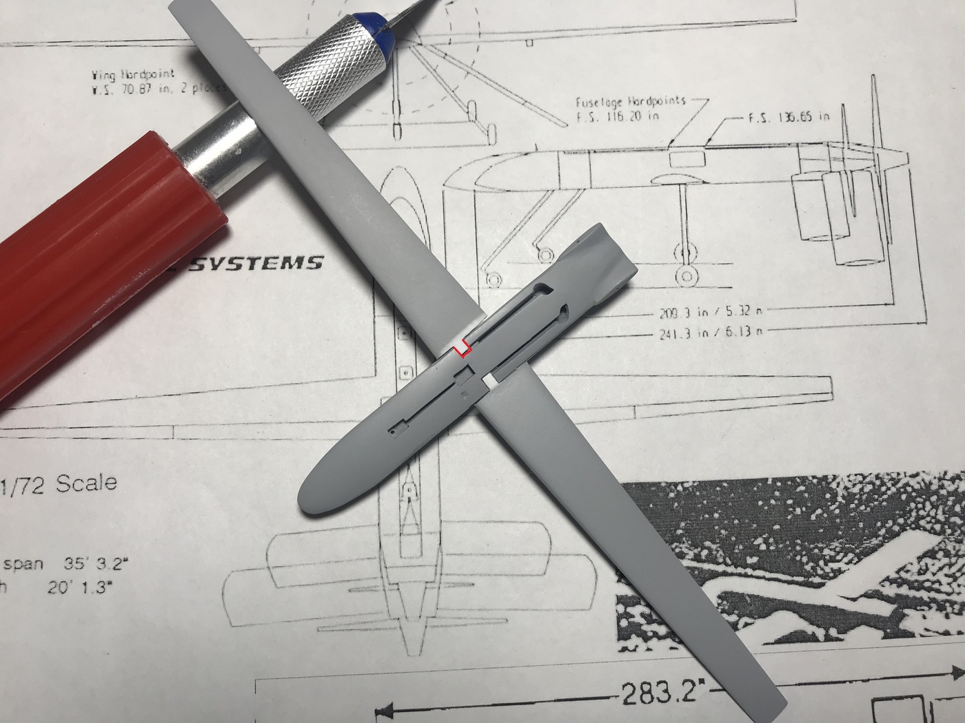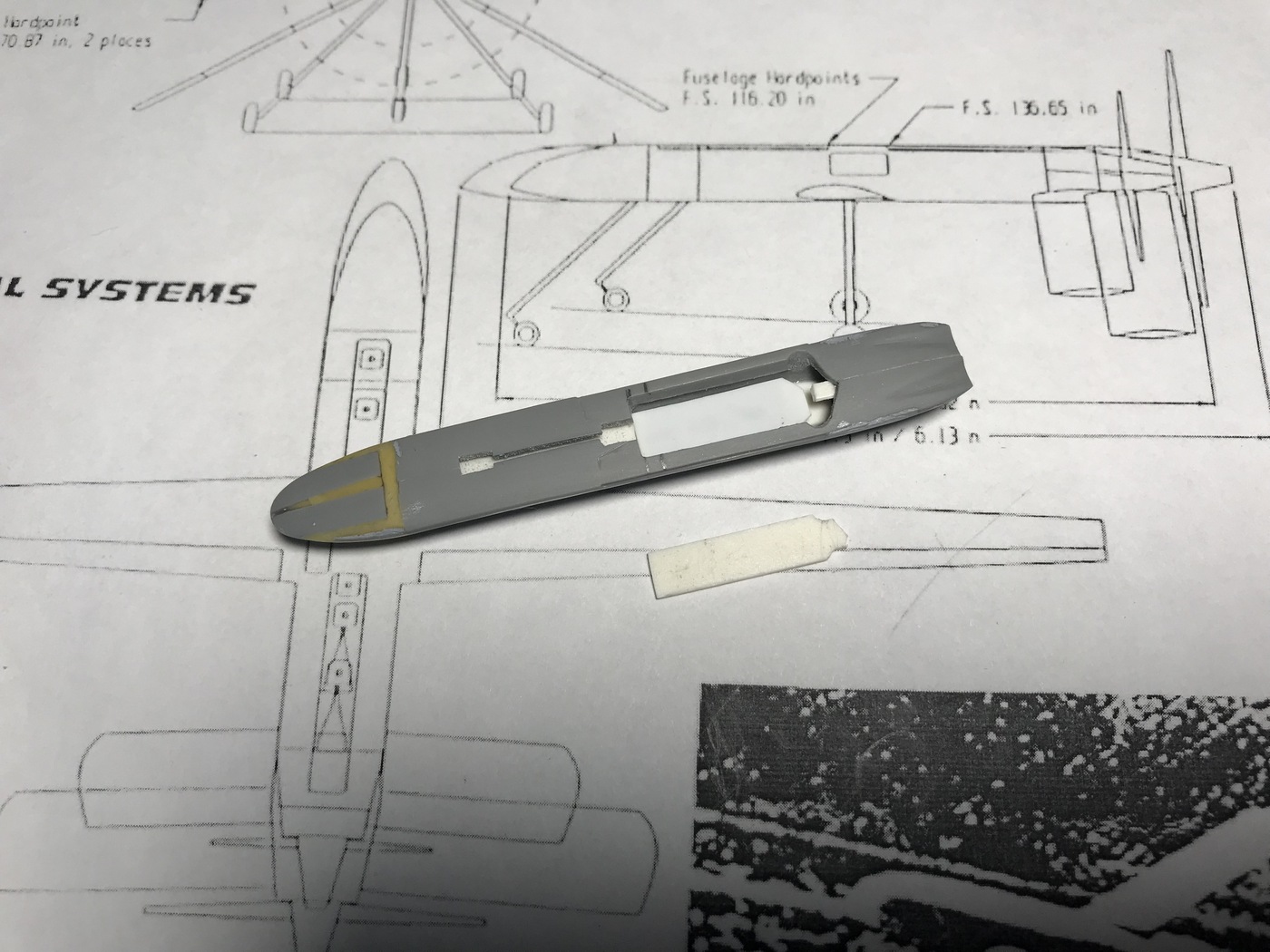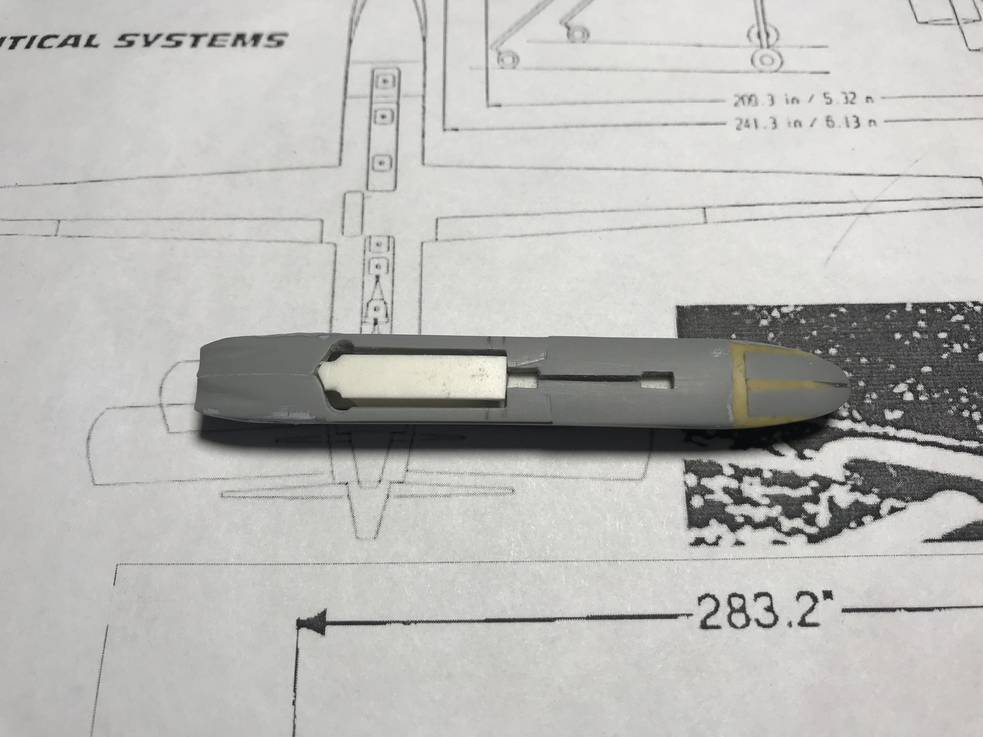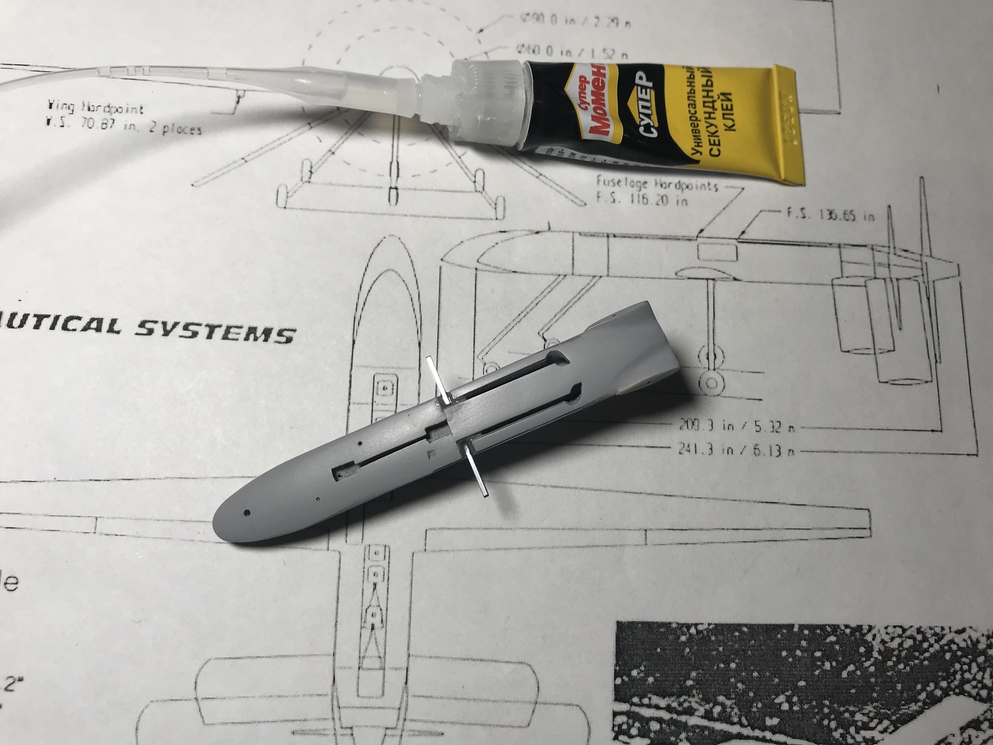 Склеил половинки корпуса, вырезал основные ниши и место под центроплан. В верхнюю часть корпуса вклеил кусок литника(нужно сточить 1мм, сверху корпуса)....