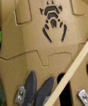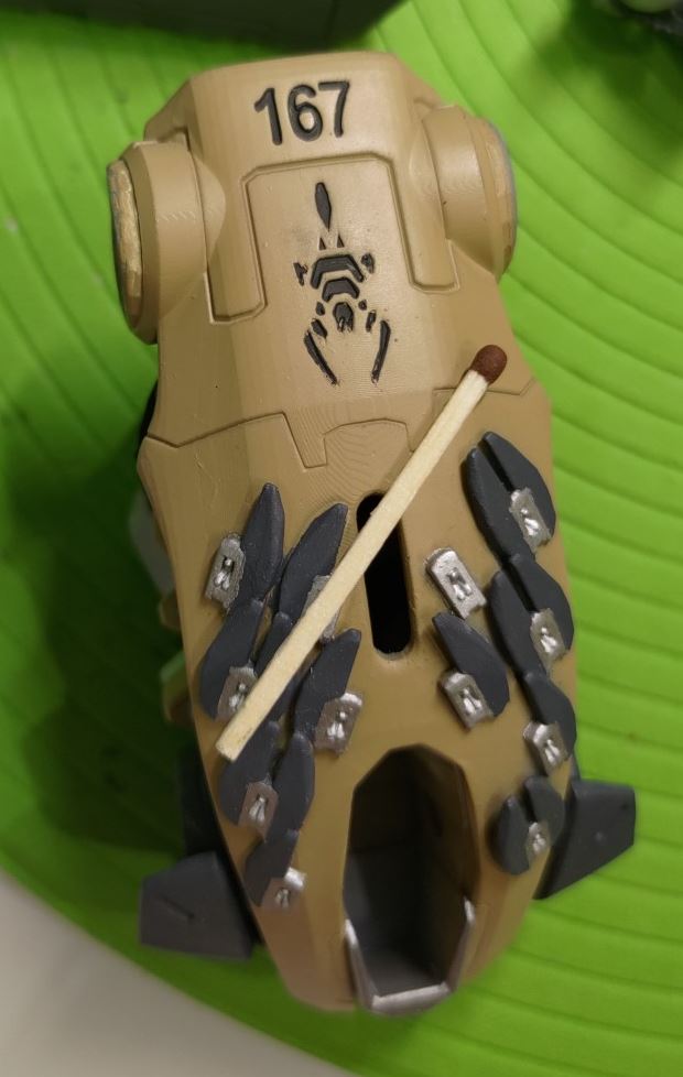 -          пока вёз робота на фотосессию, в рюкзаке перевернулся торс и немного вытек фотополимер и испортил покраску вокруг ”заглушки”. Тут такое дело, после печати всё было помыто и вылизано спиртом, но видимо в какой-то хитрой полости внутри сохранилась смола и не увидев ни разу солнышка она радостно устремилась нам всё портить)