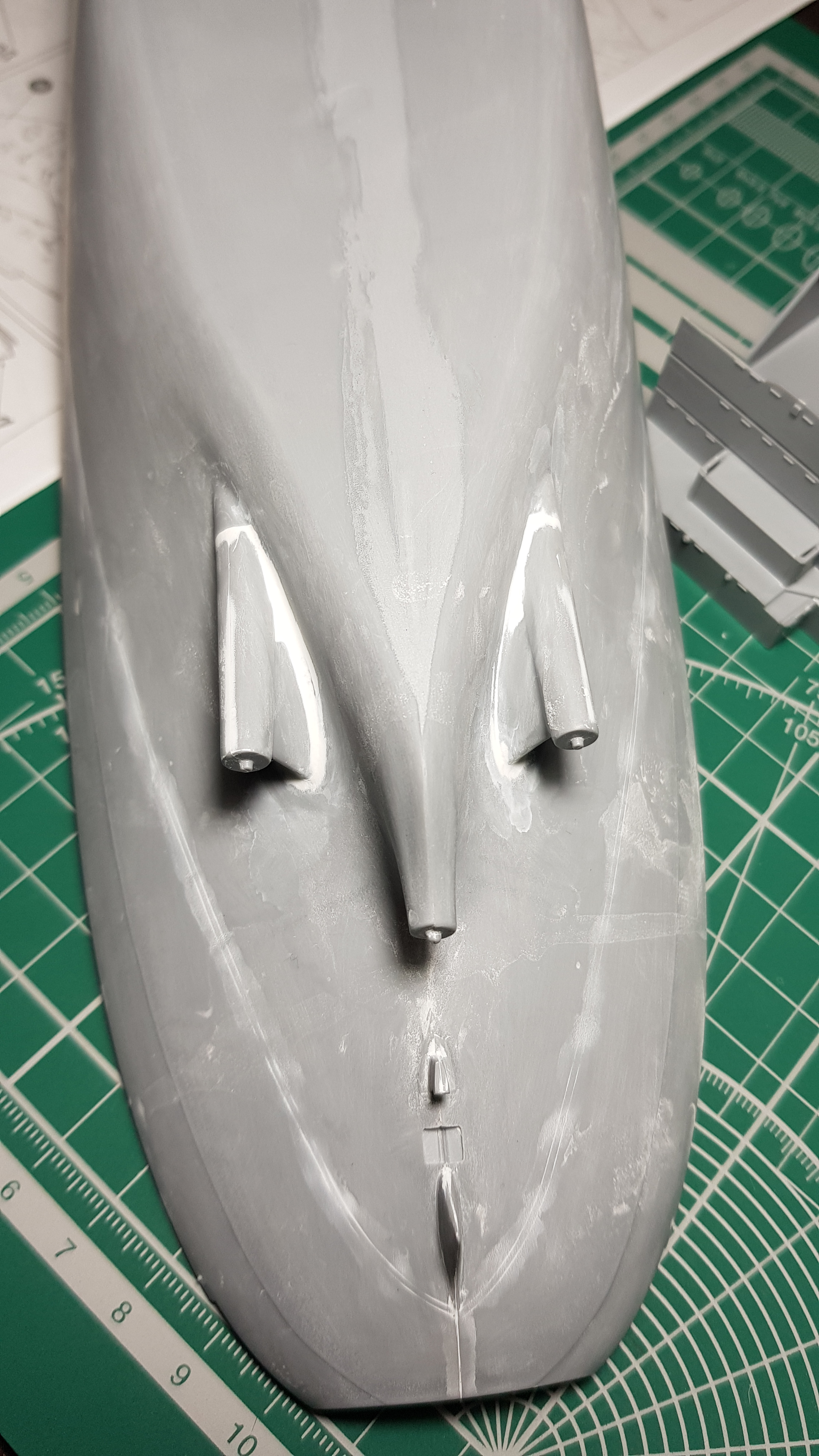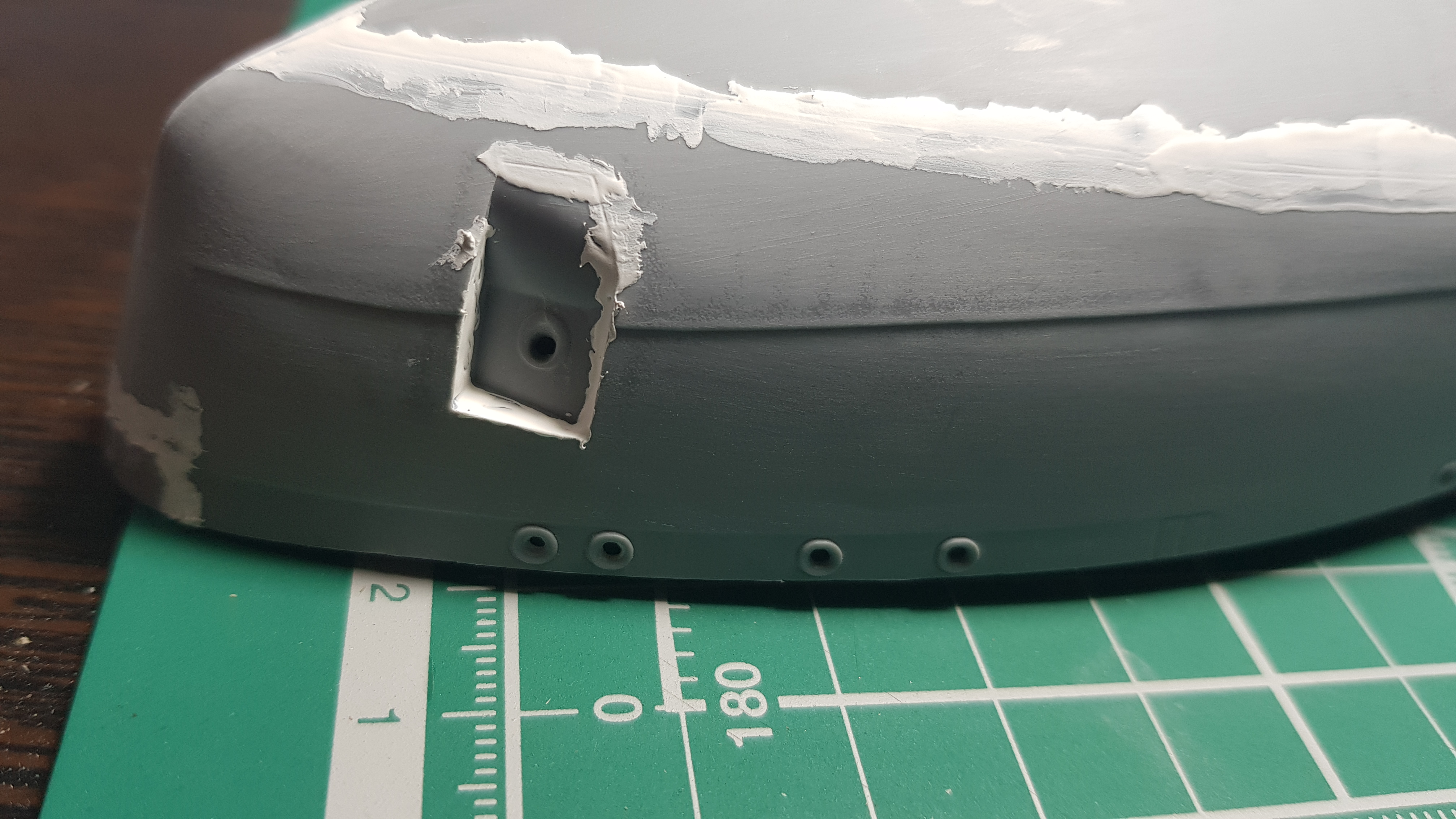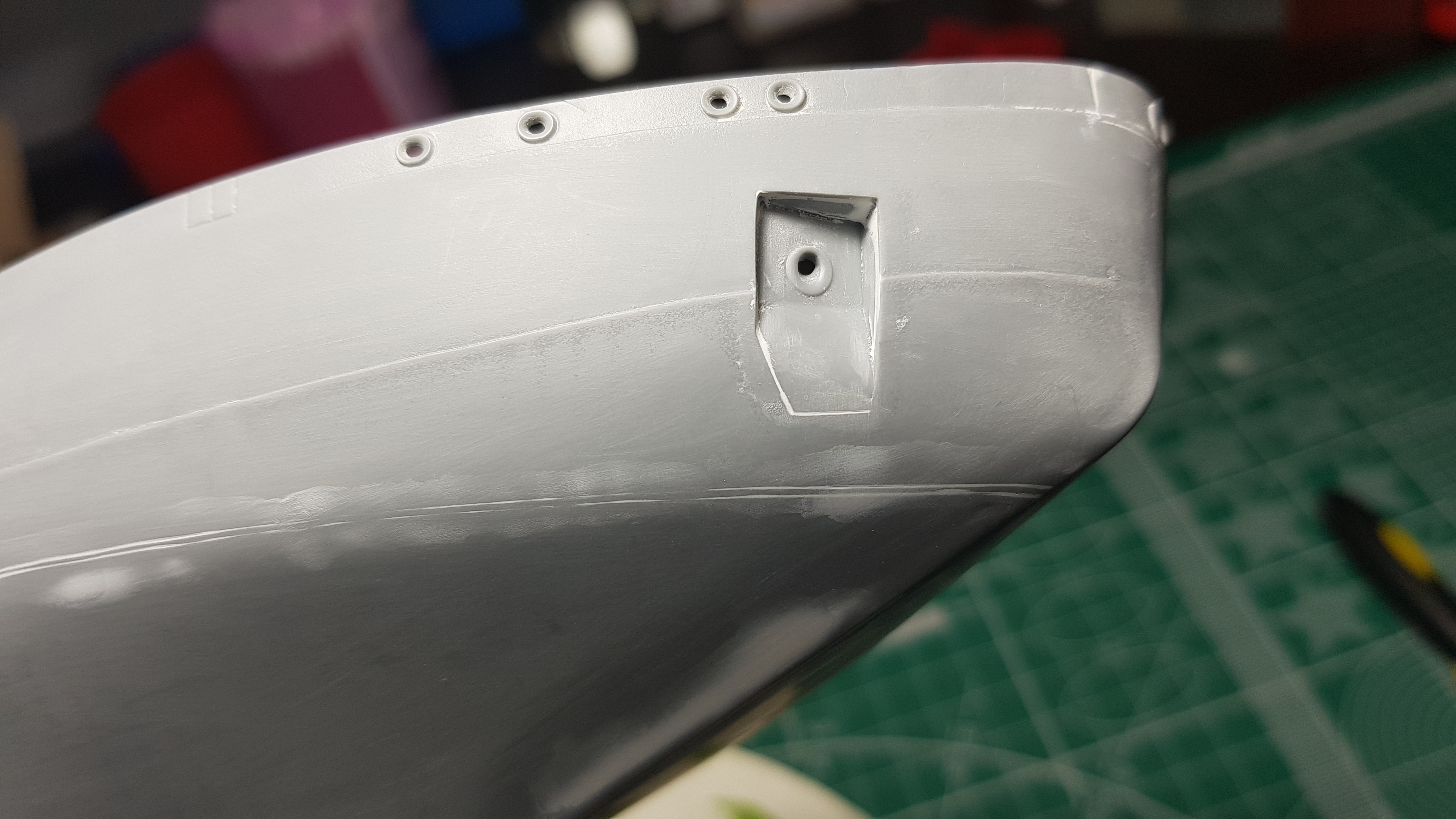 Продолжаем. Зашлифовал корпус Р800. Шагрень почти стерта. Зашпаклевал все что осталось после шлифовки. Ватерлиния, это реально то, чего лучше бы небыло. Смонтировал дедвудные трубы и тоже шпаклевка. Возможно Михаил и стоило воспользоватьсч методом окунания)))
