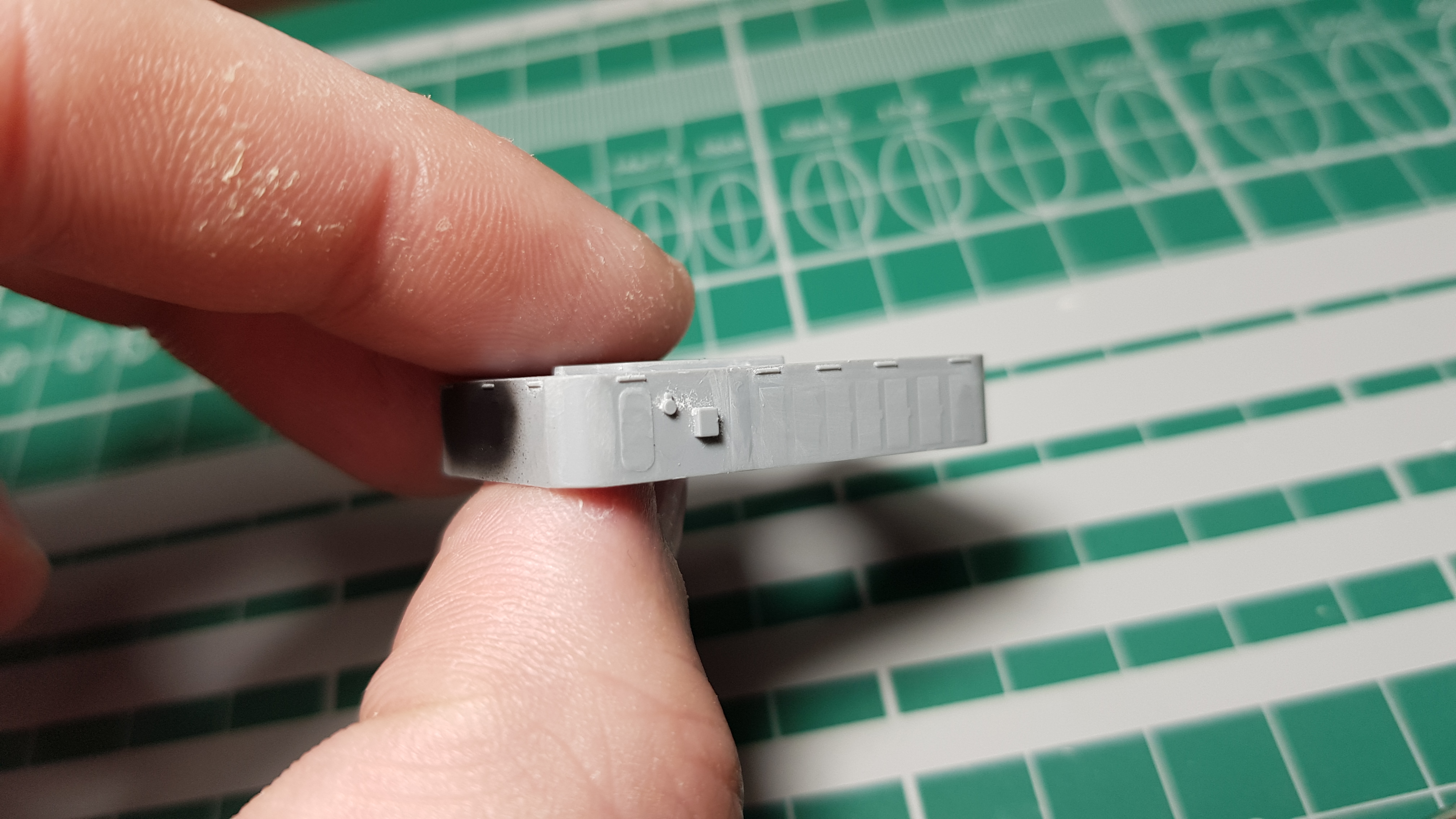 Шагрень, действительно, только проблему создала. Может и бывает такое покрытие в жизни, но на модели будет смотреться печально. Лучше тонким слоем зашпаклевать, и зашкурить с брусочком. Главное, бронепояс не стереть