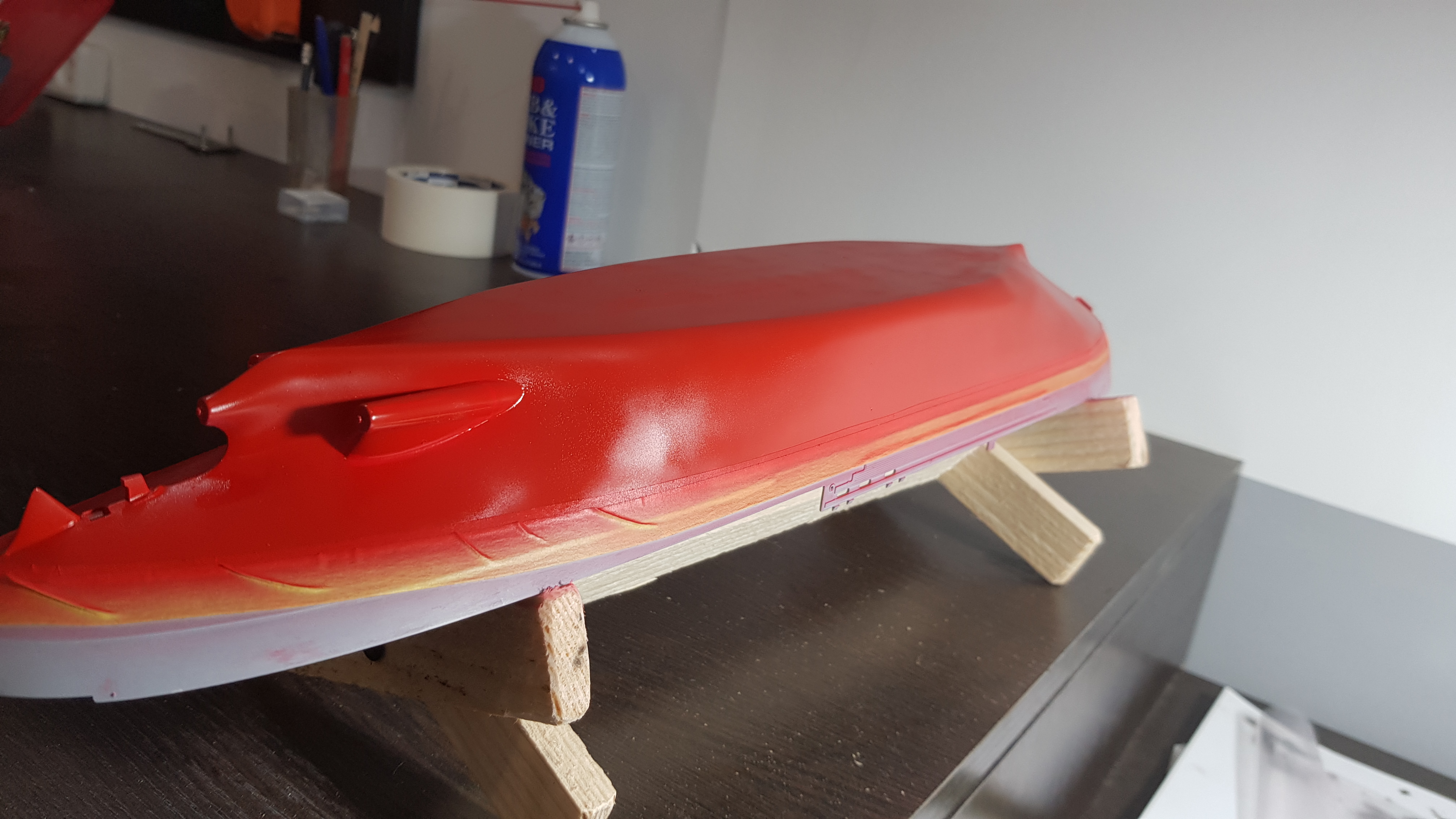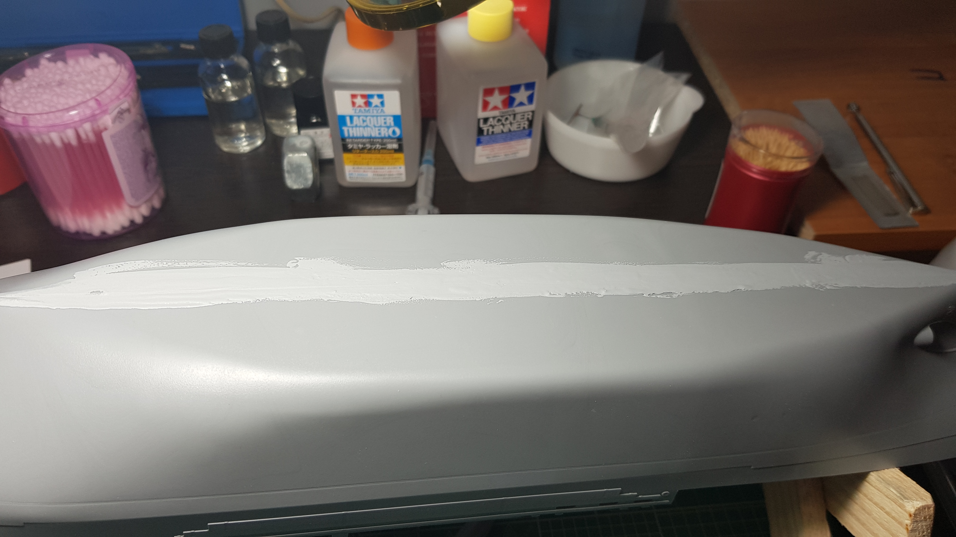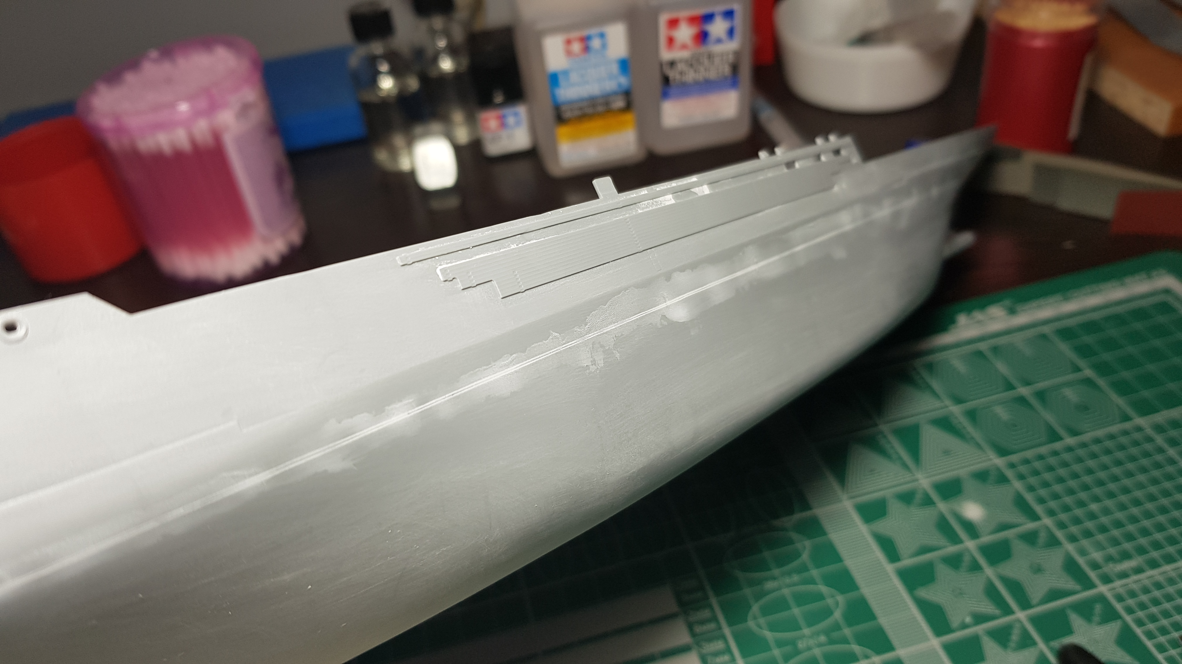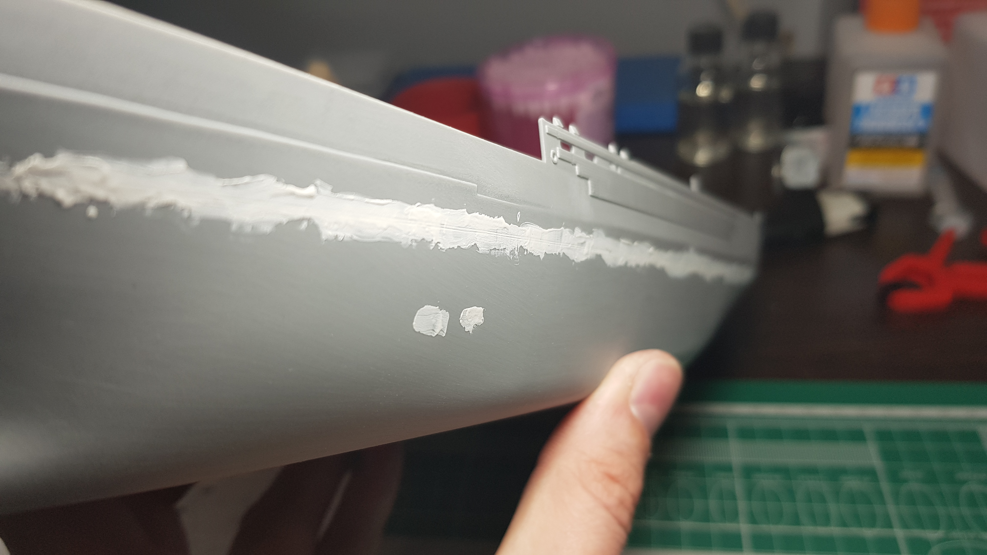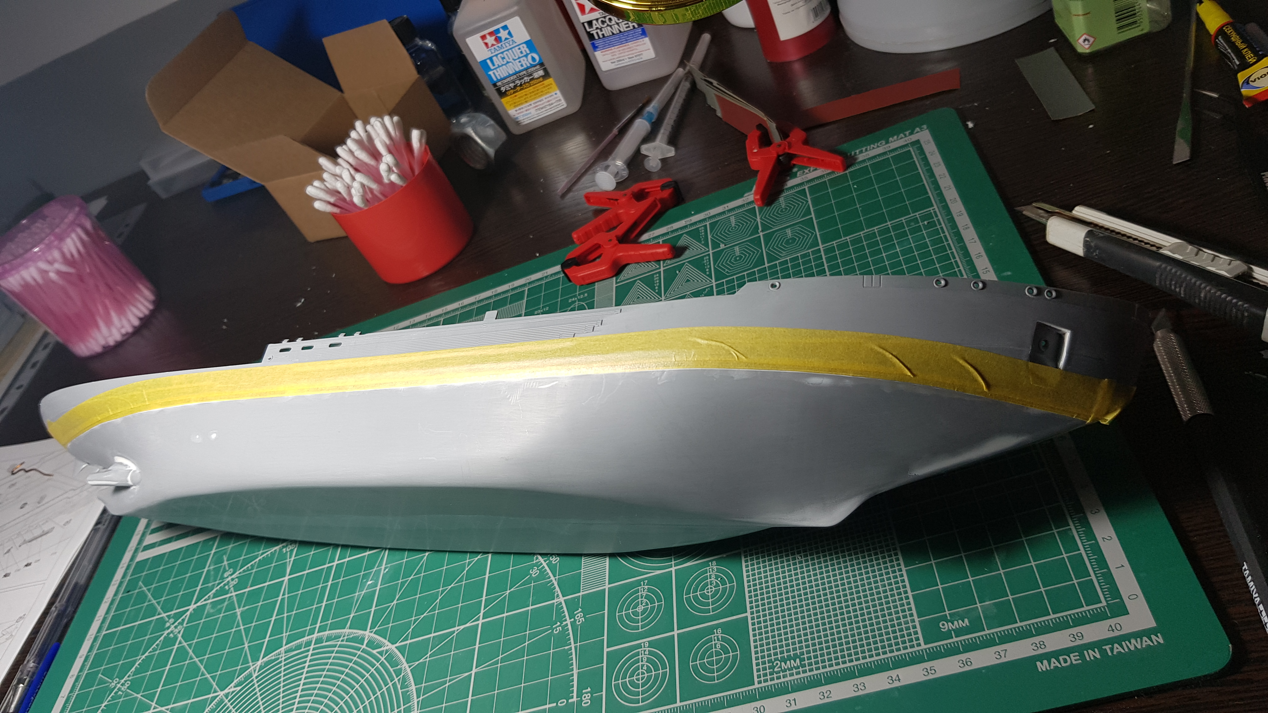 Приветствую! Пока дома на компрессоре сижу, решил заняться маляркой. Не охота на вахту тащить габаритные элементы. Покрасил подводную часть... краска Tamiya LP-7+родной растворитель. Впечатление двоякое. Ложится мягко. Работать приятно. Не укрывает от слова совсем. Белая шпаклевка светится местами. Разбавлял по разному. В общем предварительный вердикт-надо перекрывать грунтом или одним цетом поверхность, а потом уже финиш. Местами лег опыл. В лбщем не люблю я большие плоскости еще с автомалярки)))