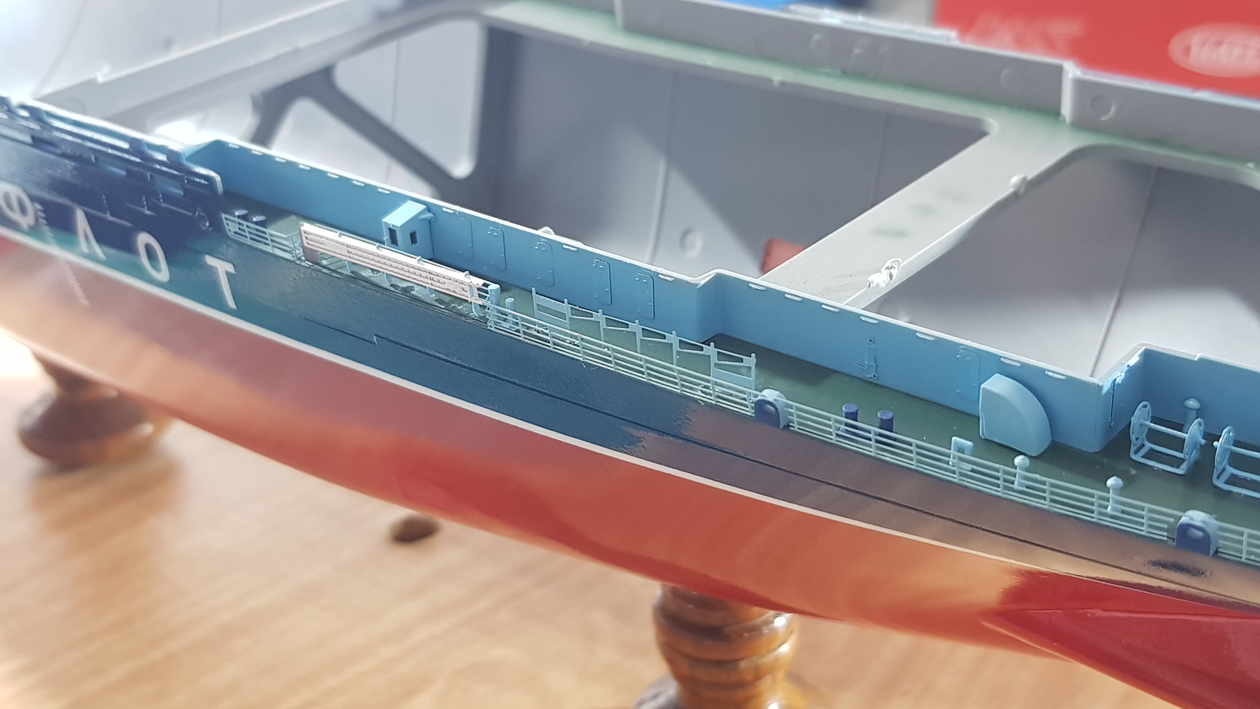 По декалям нанес глянцевый лак и посадил корпус на временную подставку. Смонтировал все палубные элементы на корме, леера, трапы, в общем все что относится к этой части палубы.