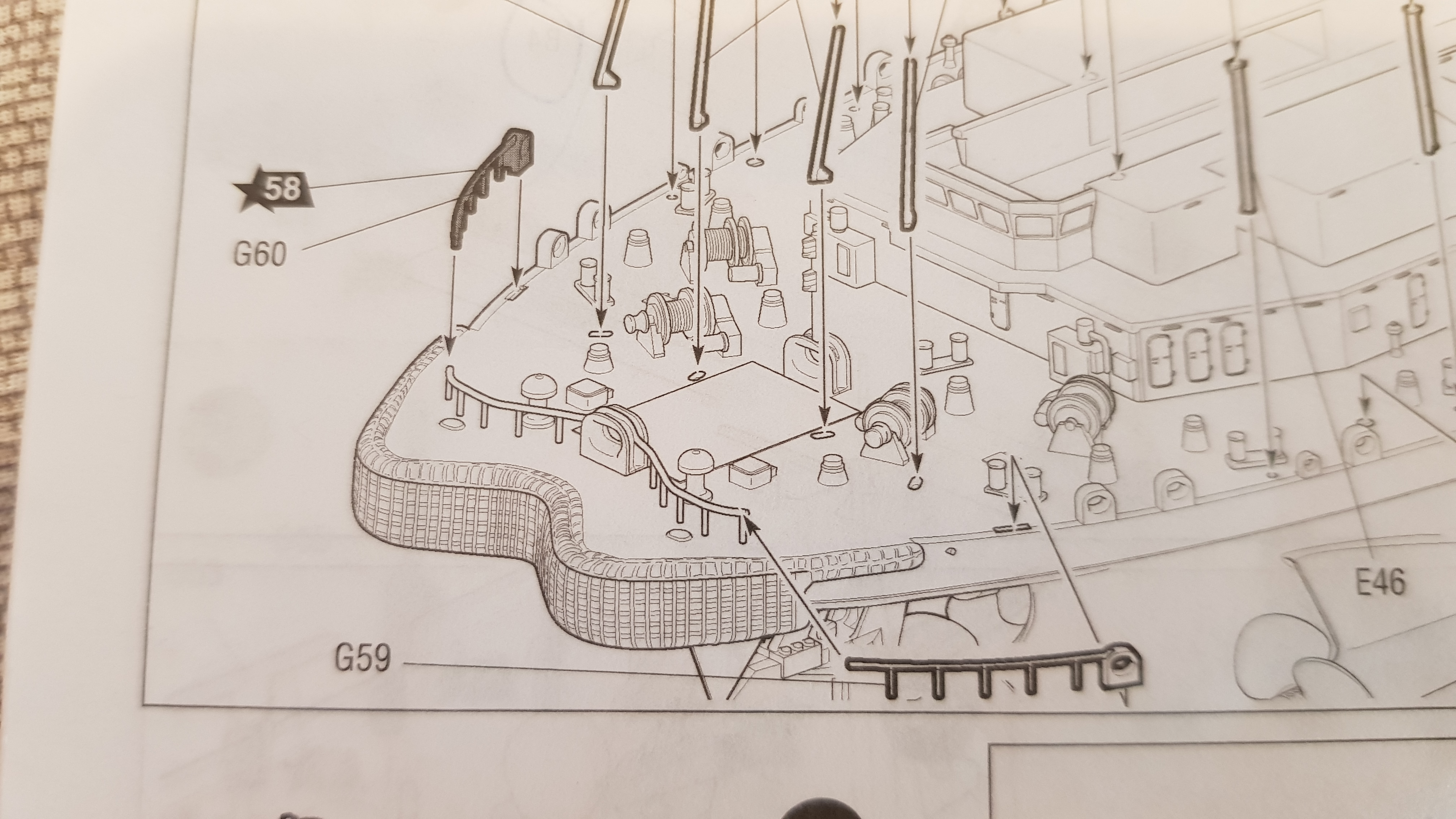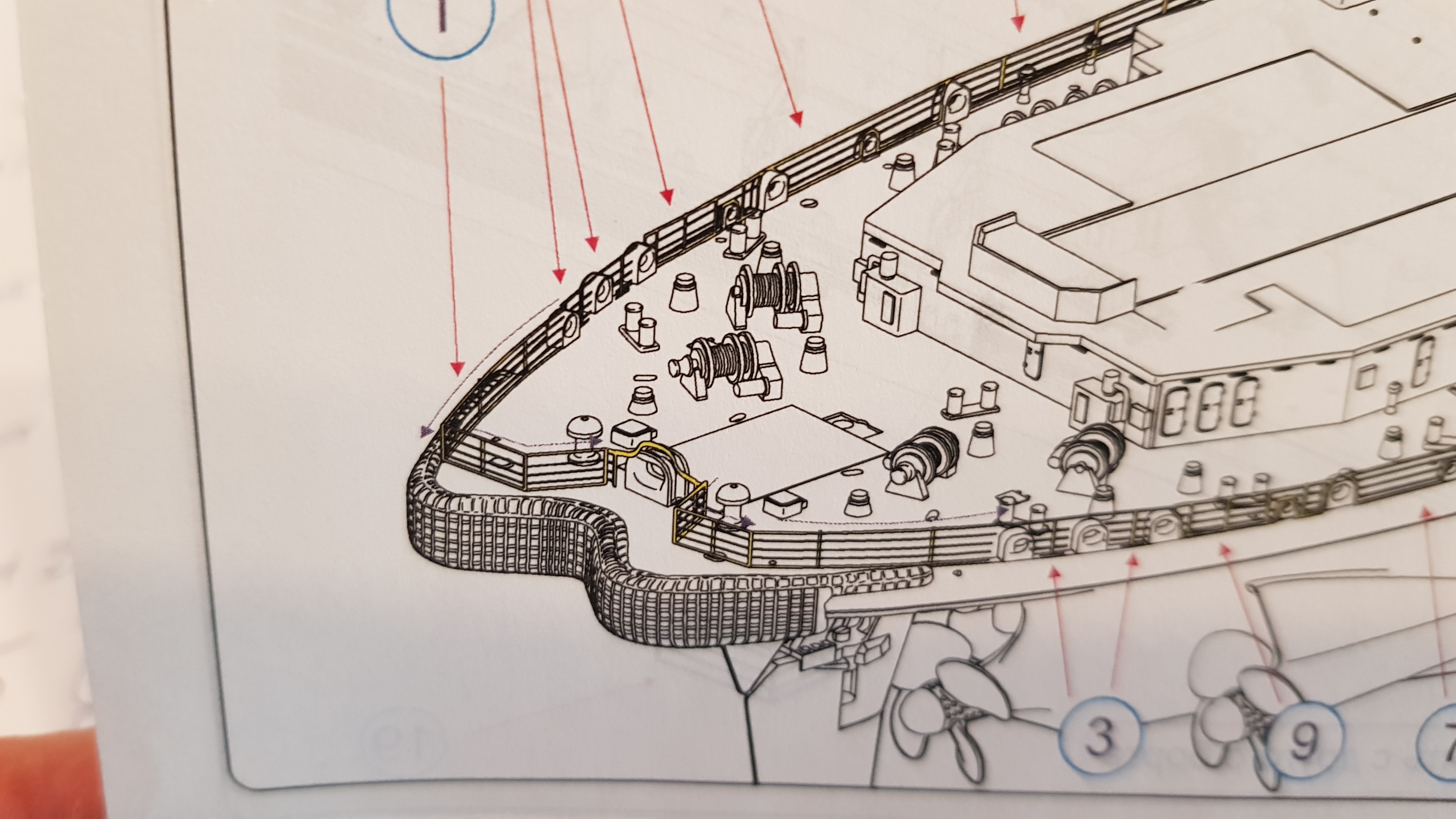 Вот есть момент с травлением. В травле кормовые леера даны как обычные (4 нити). В пластике как усиленные трубные, упрощенные. В оригинале тоже конструкция из труб мощных. Видимо из расчета буксировки и нагрузки канатов. Буду делать пластиковые, как дала "звезда"