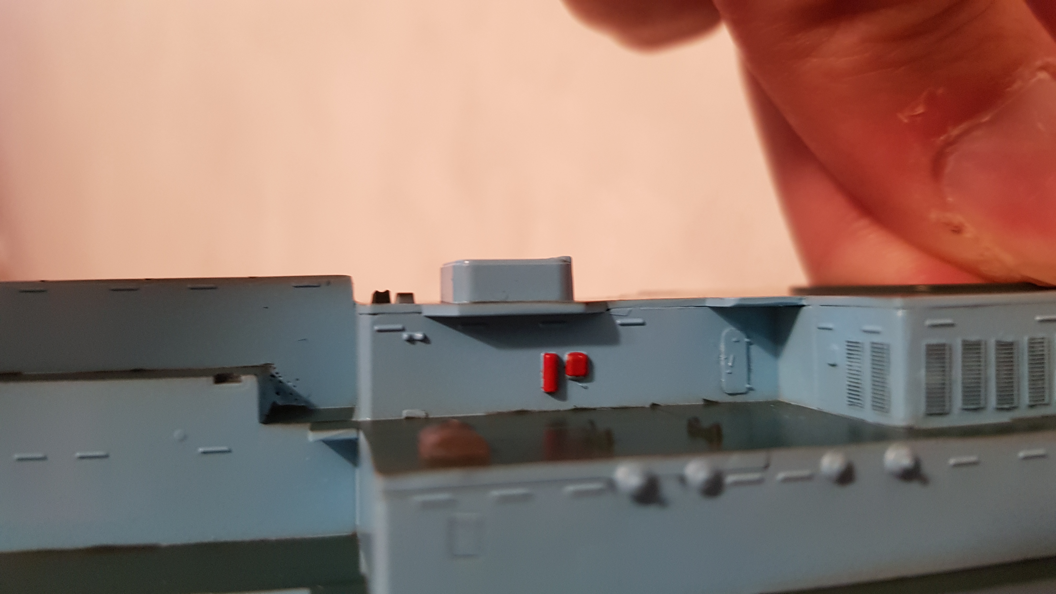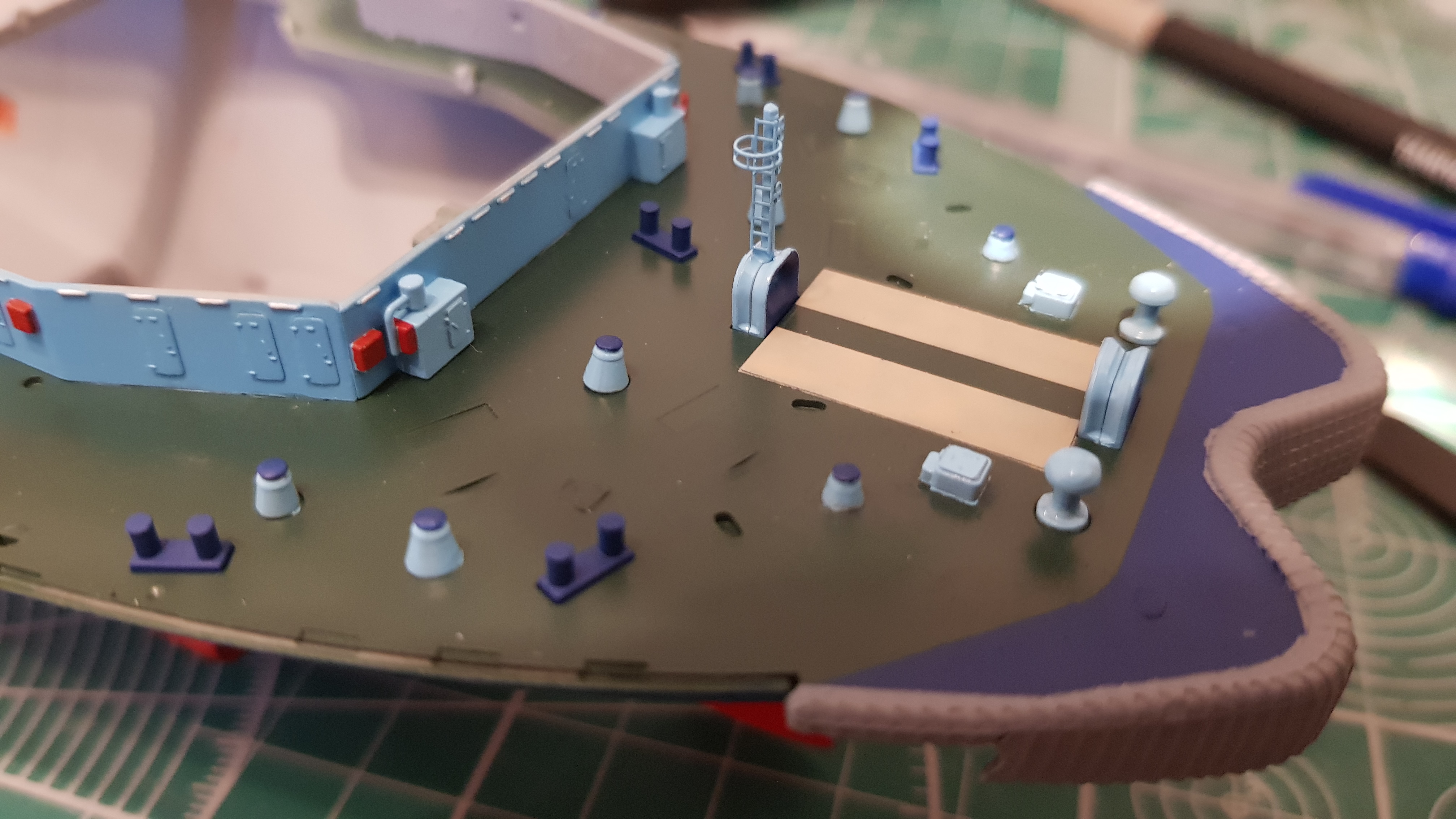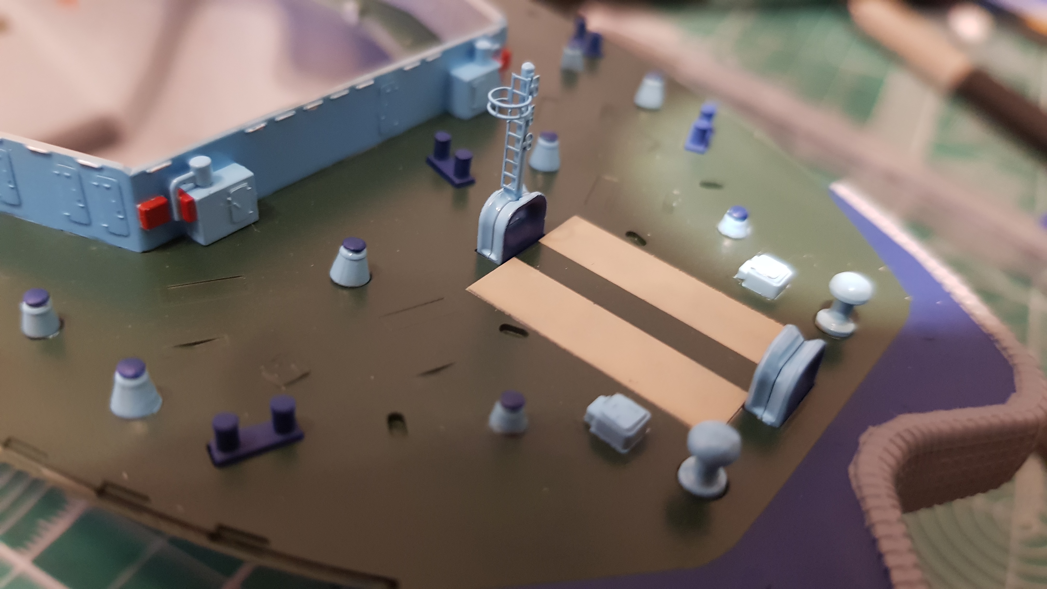 Вроде всё подготовил. Начал монтаж палубного оборудования на корме. Еще попробовал обозначить ручки на дверях черным, но толи из за отсутствия опыта работы с кистью, толи кисть не подошла мне... в общем решил отказаться от этой затеи.