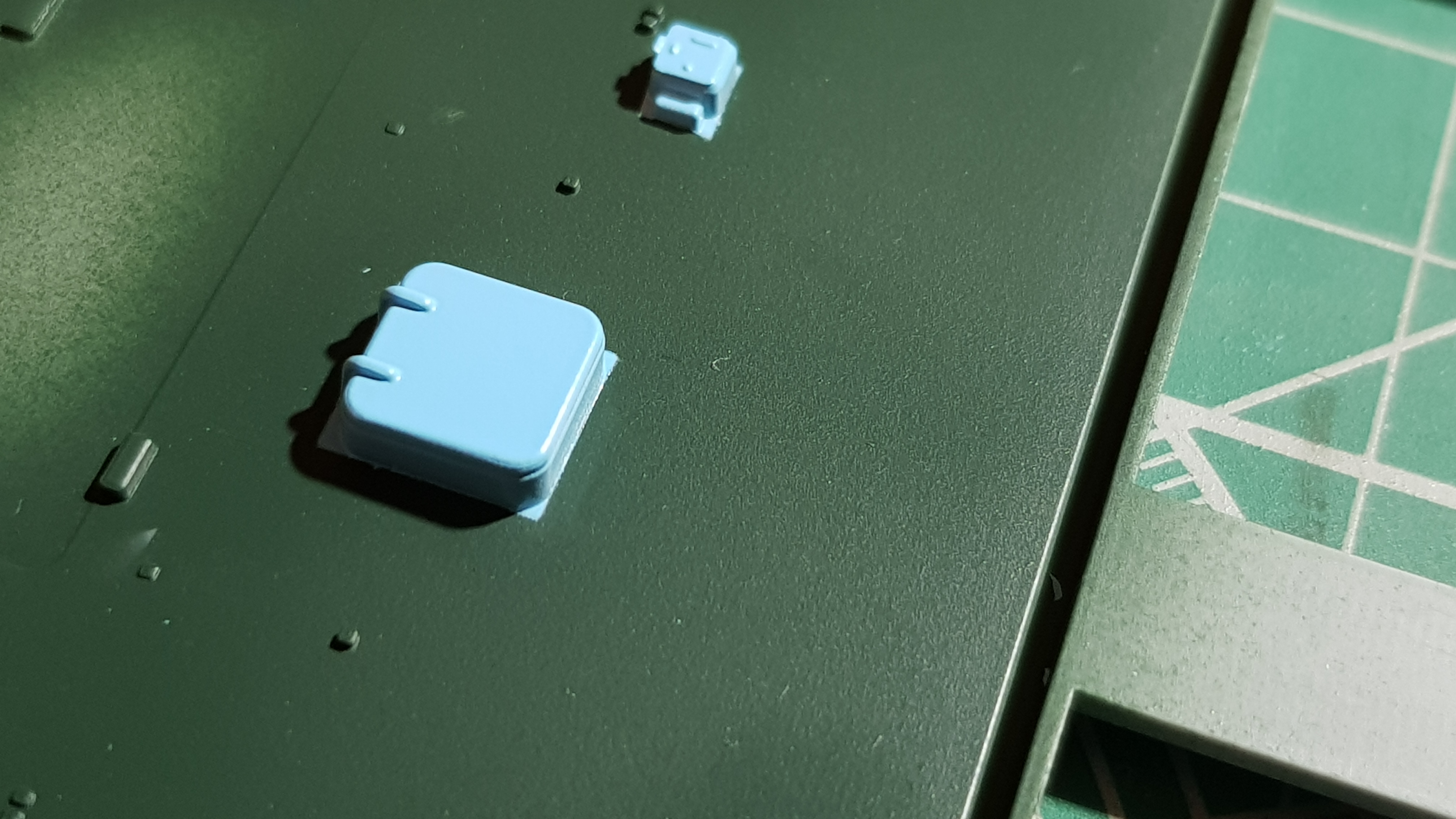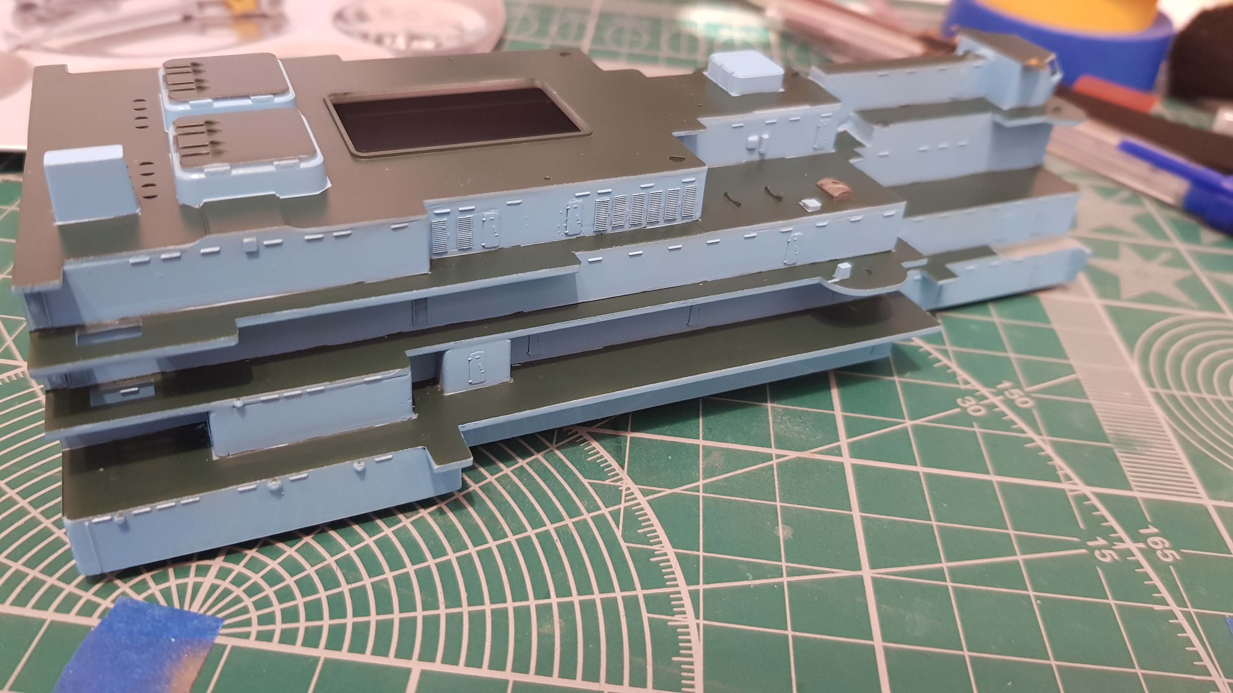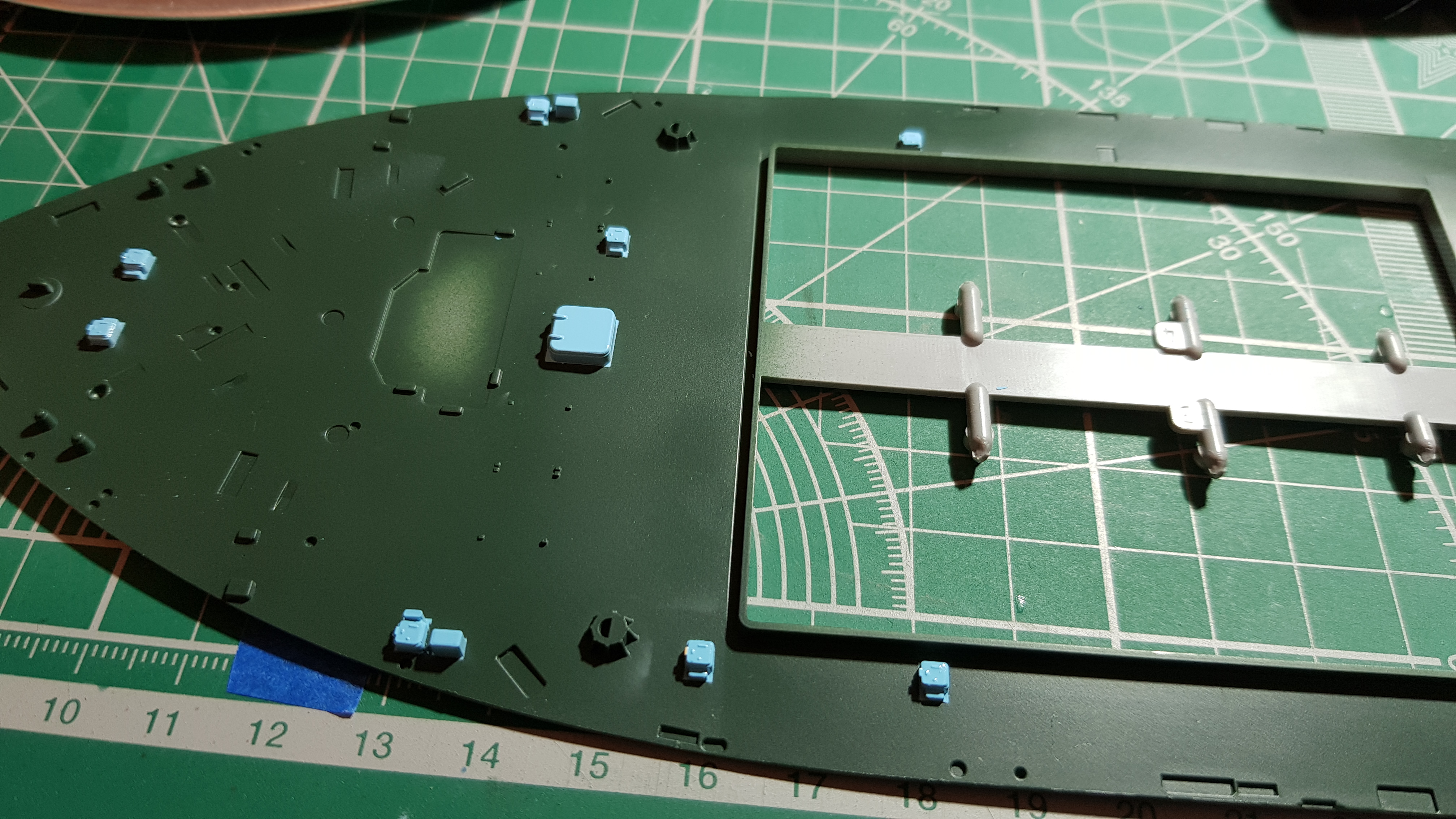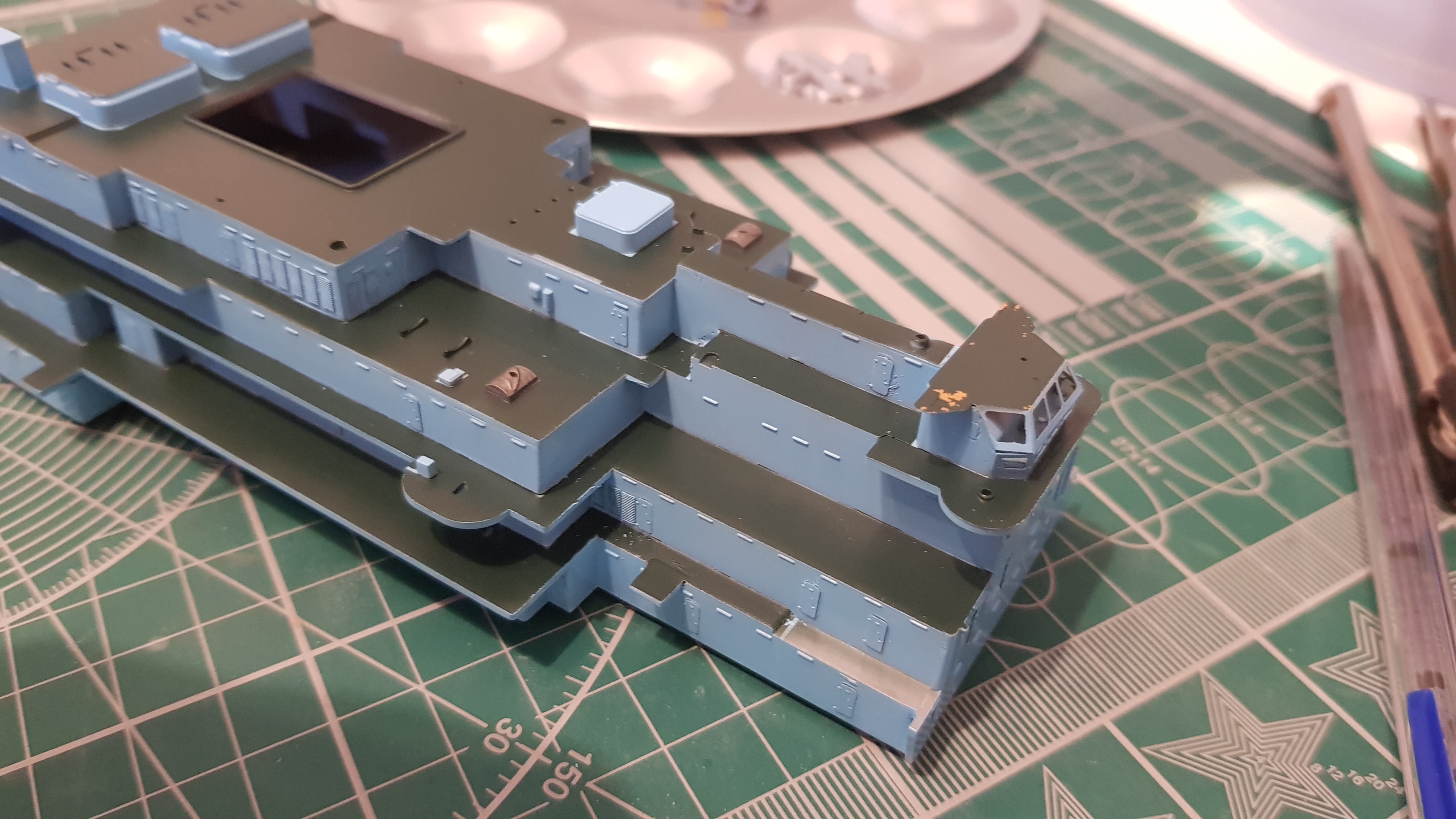 Снял маски с палуб. В виду того, что все комингсы с радиальными углами надо брать кисть и как то устранять эти голубые уголки. А какими кистями Вы пользуетесь для очень мелкой подкраски?))