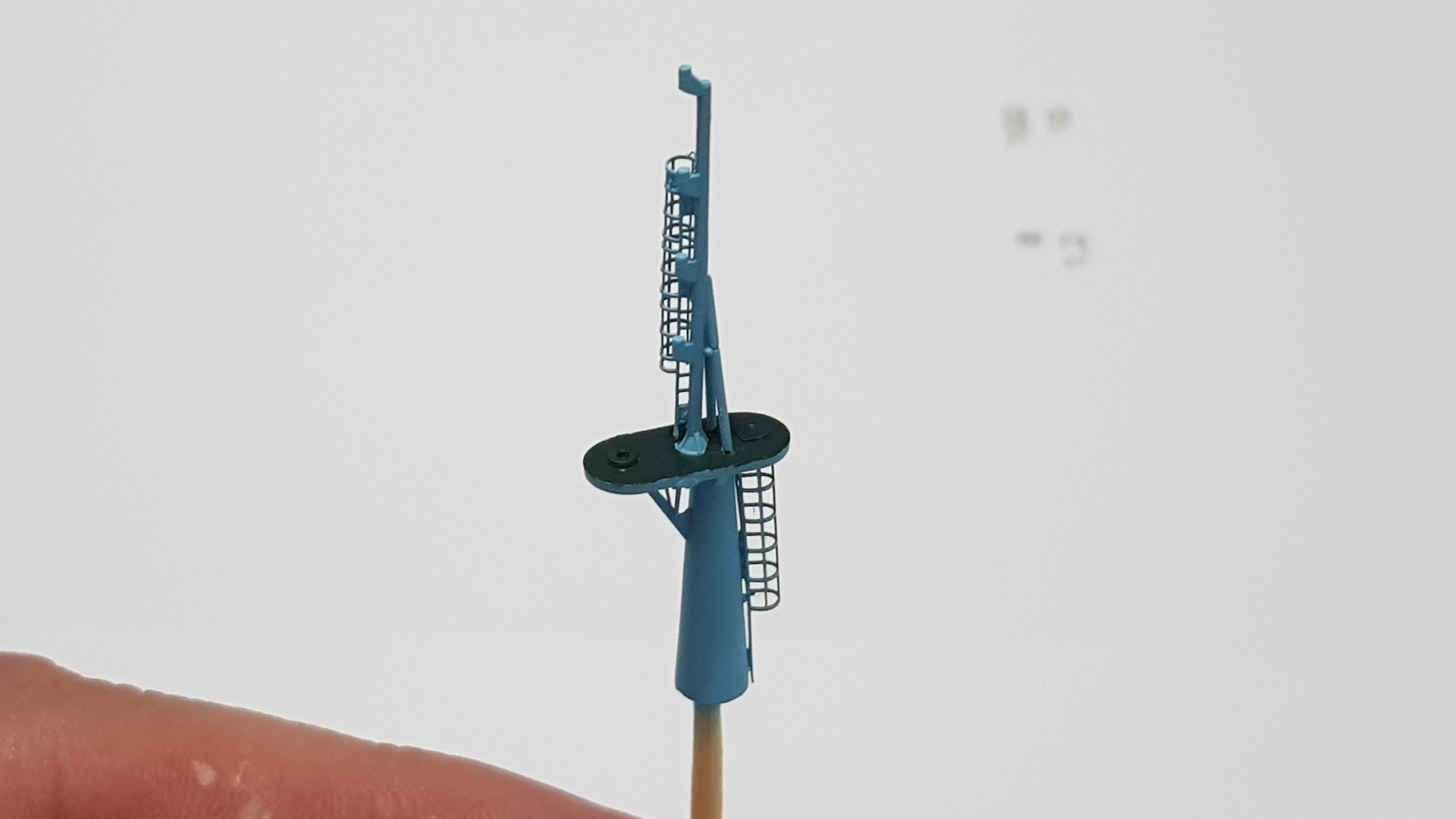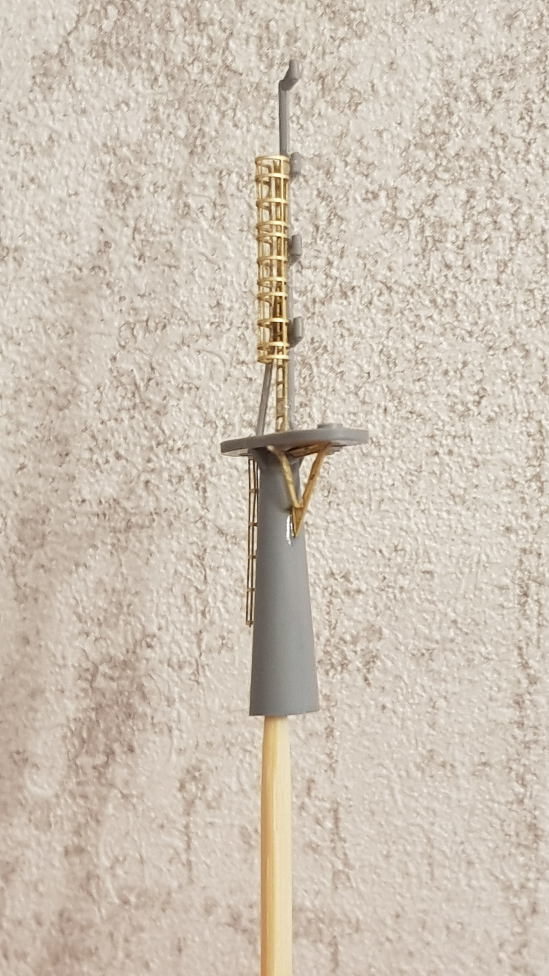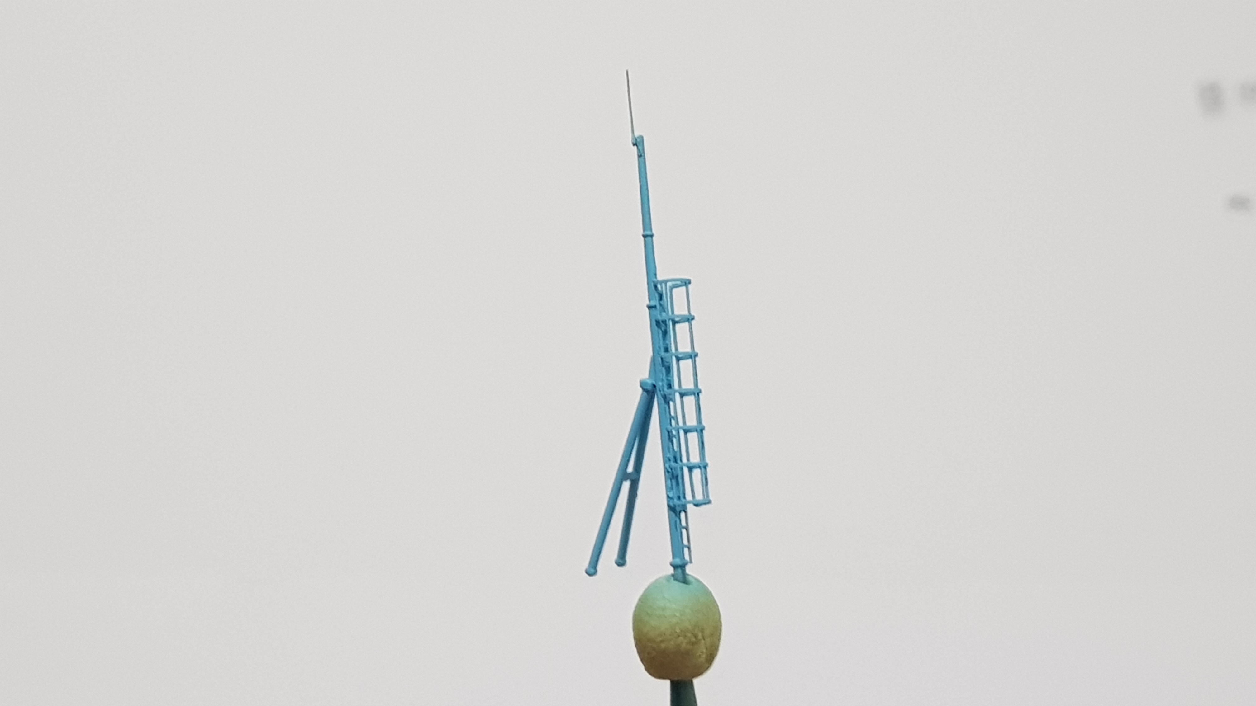 Собрал носовую мачту. Не хватает только локатора. И немного лееров и трапов на центральной надстройке.