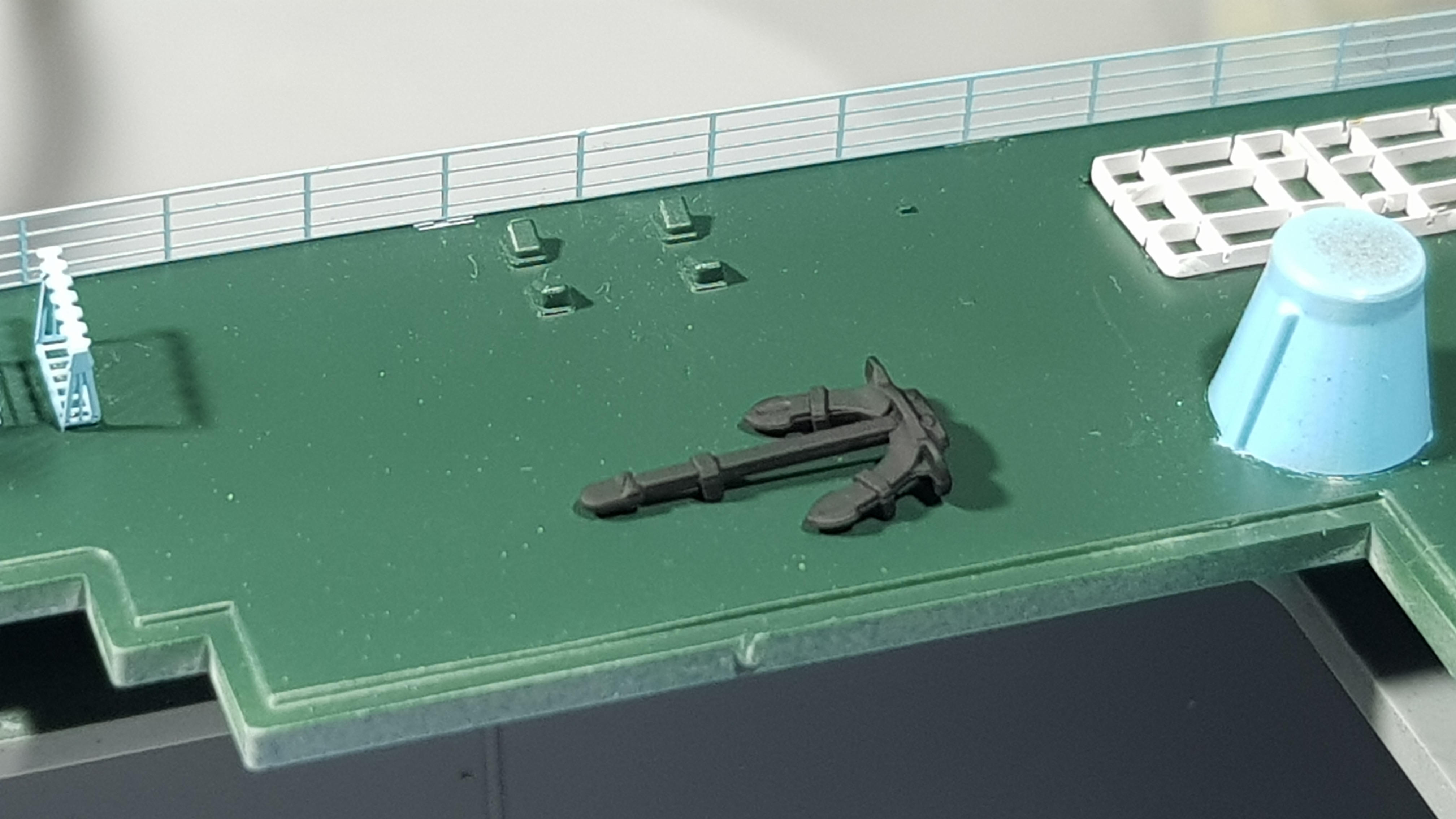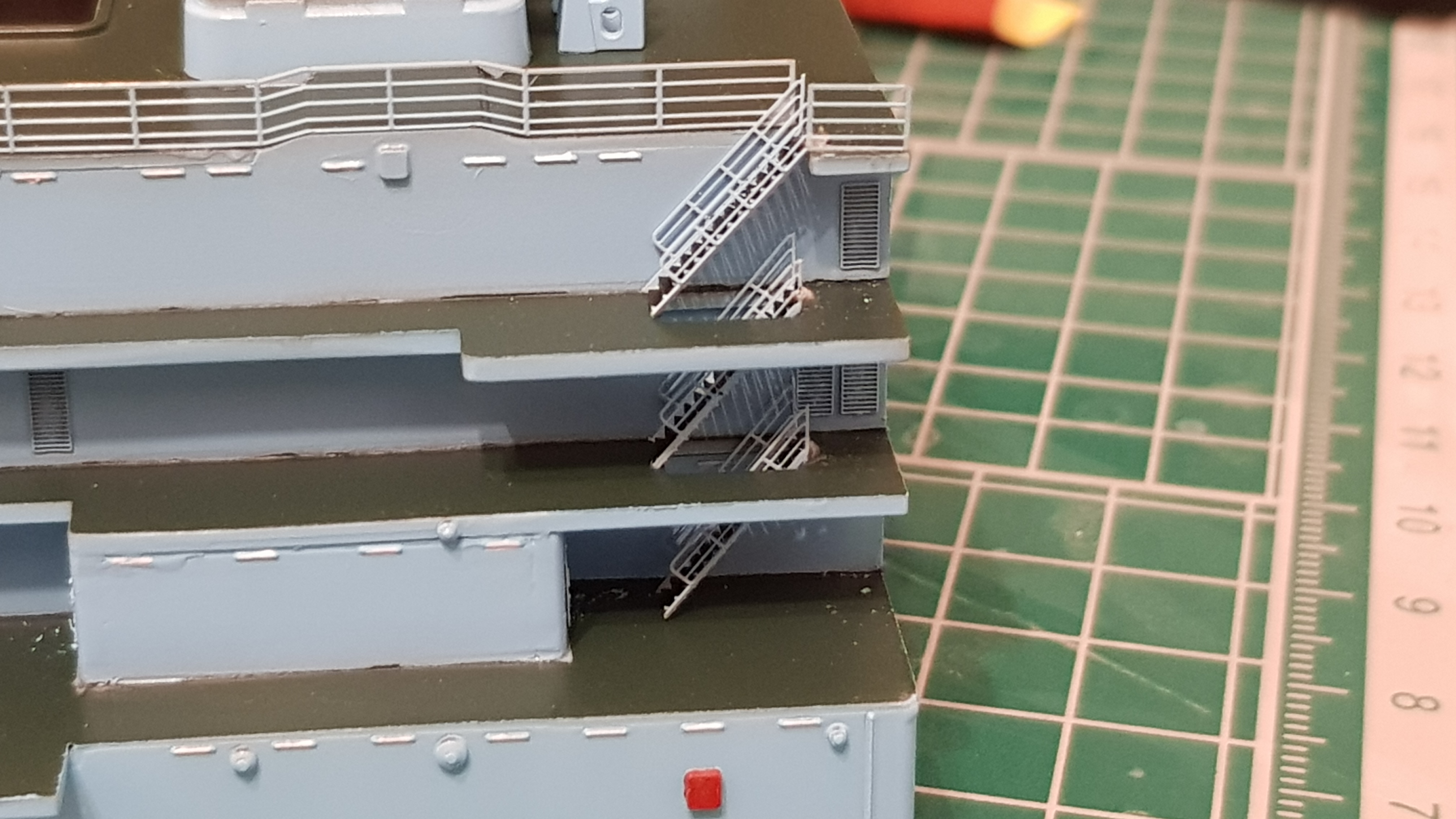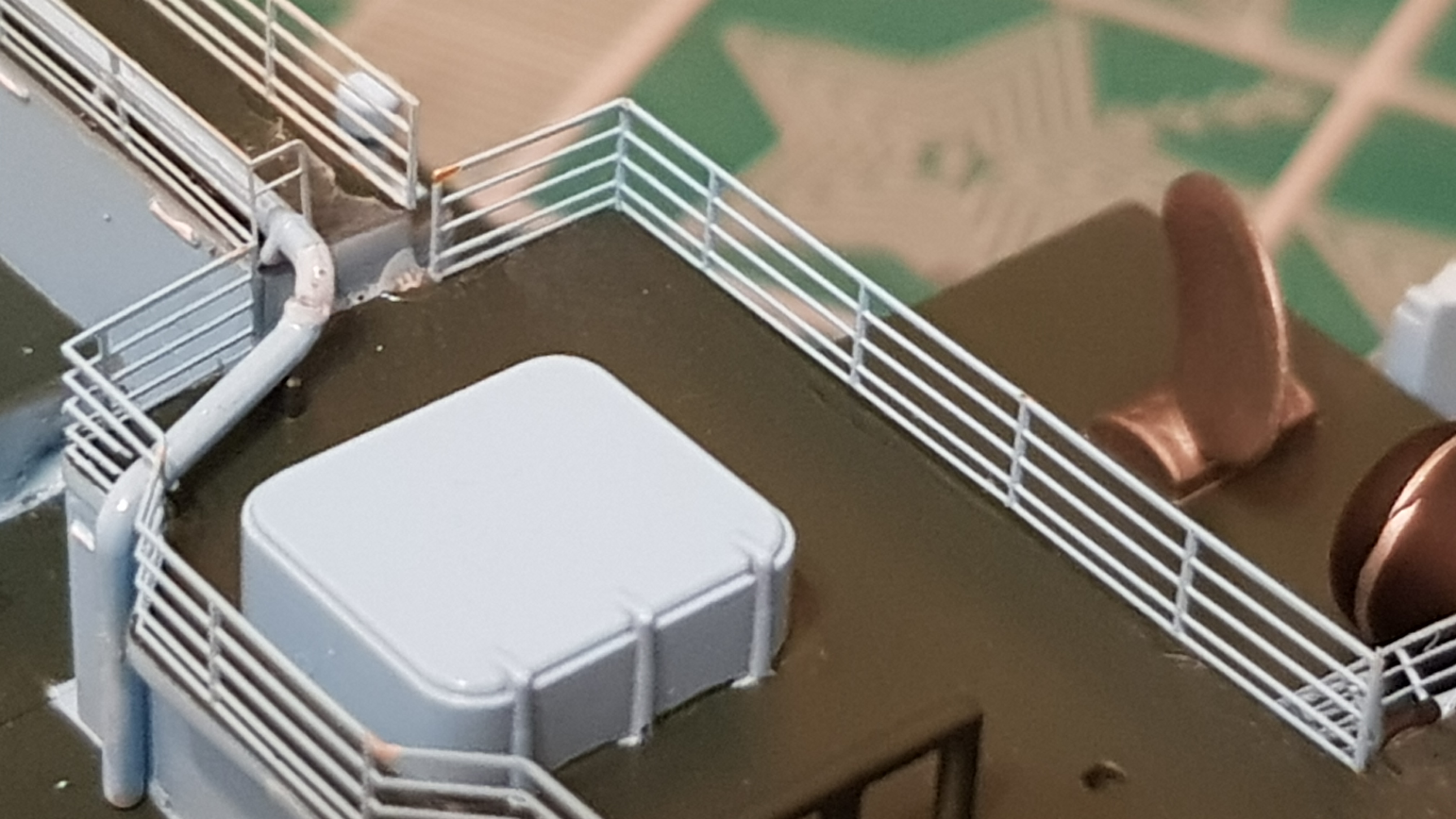 Смонтировал кучу лееров на центральной надстройке. С радиусными леерами нормально так накосячил. Дизайнерам из микродизайна мой огненный привет! Дурная затея с широкой планкой и клейкой леера в торец палубы. Собрал и покрасил мелочи на надстройку. Ну и название на мостике из цветного травления.