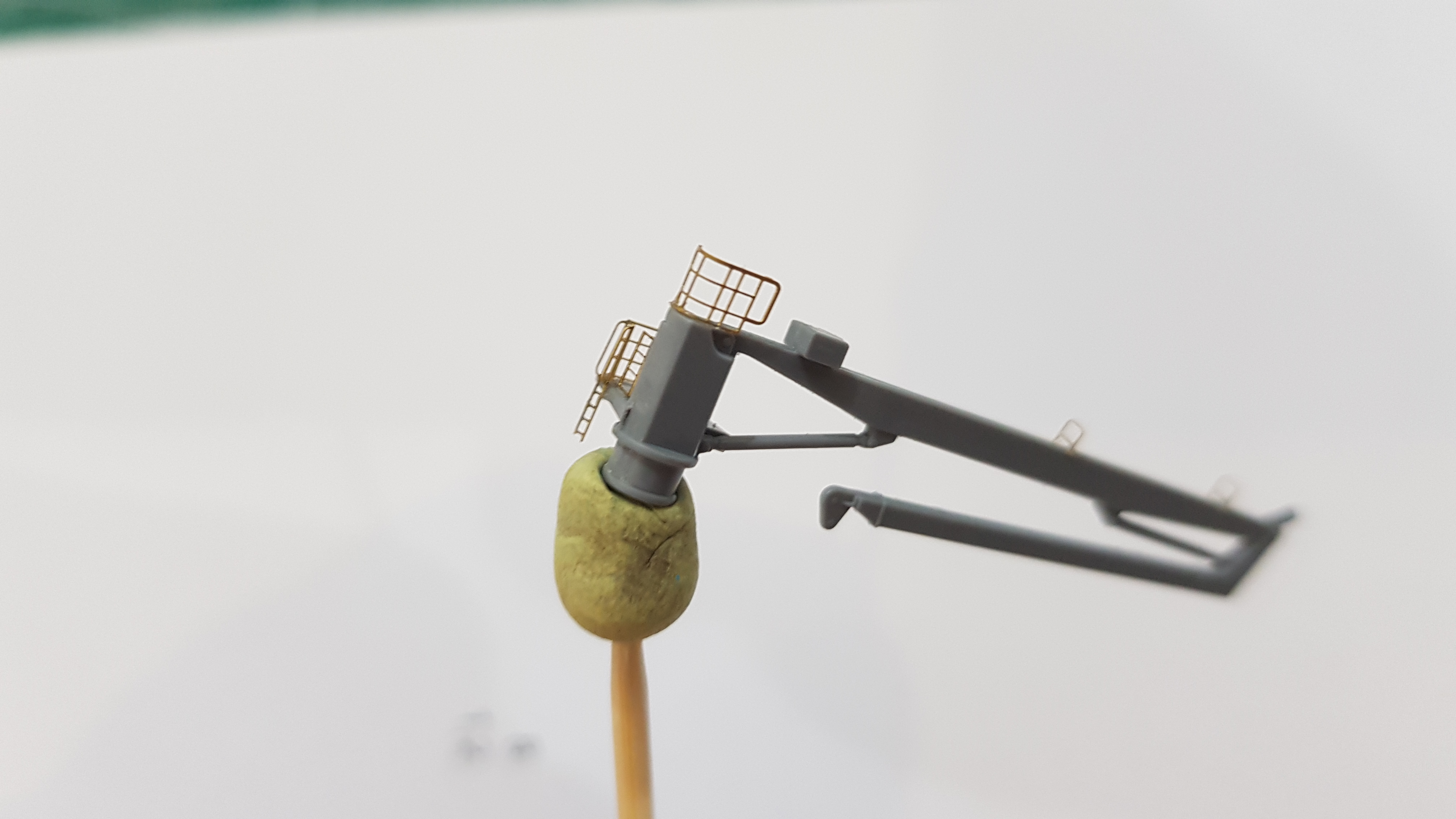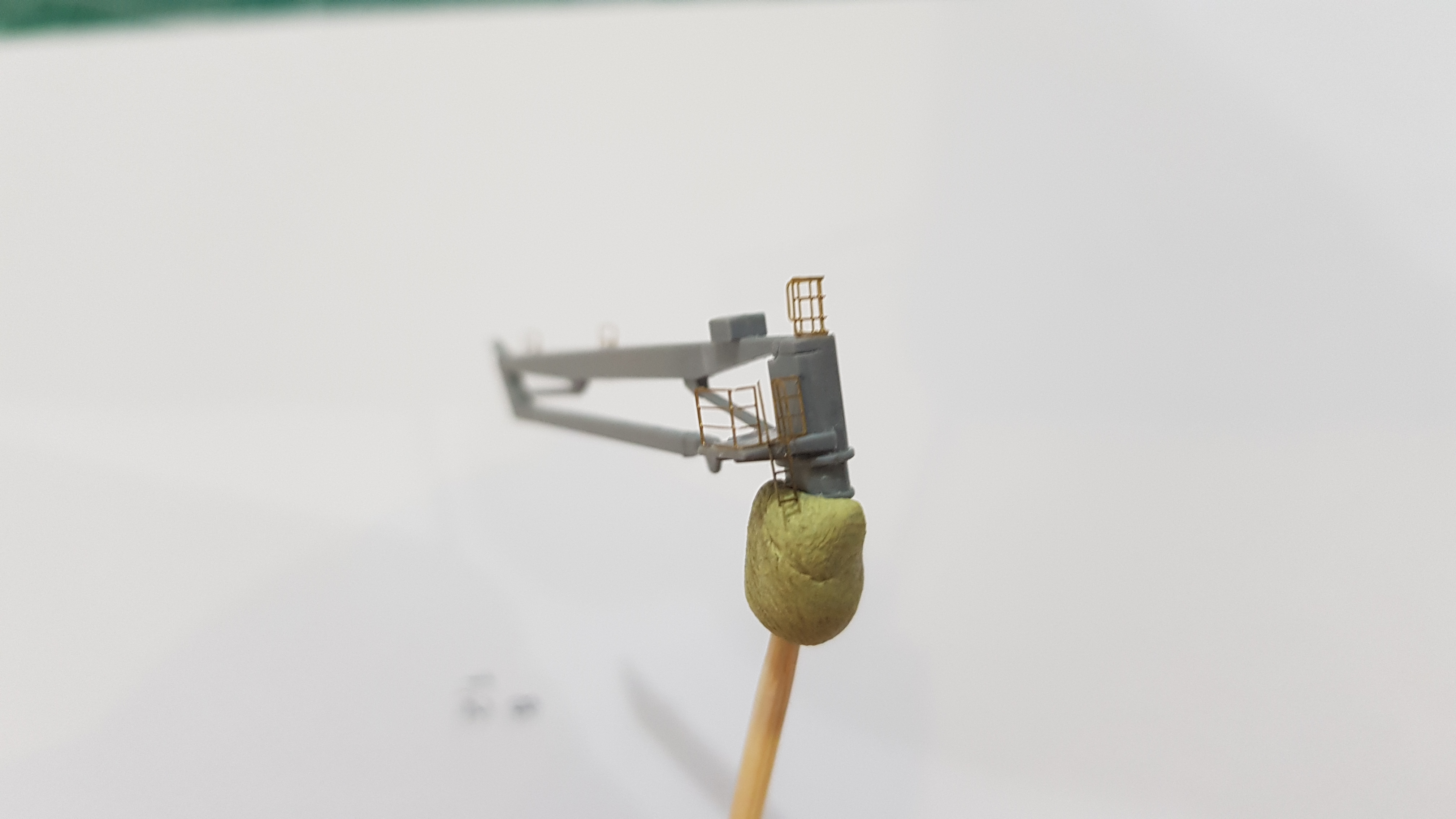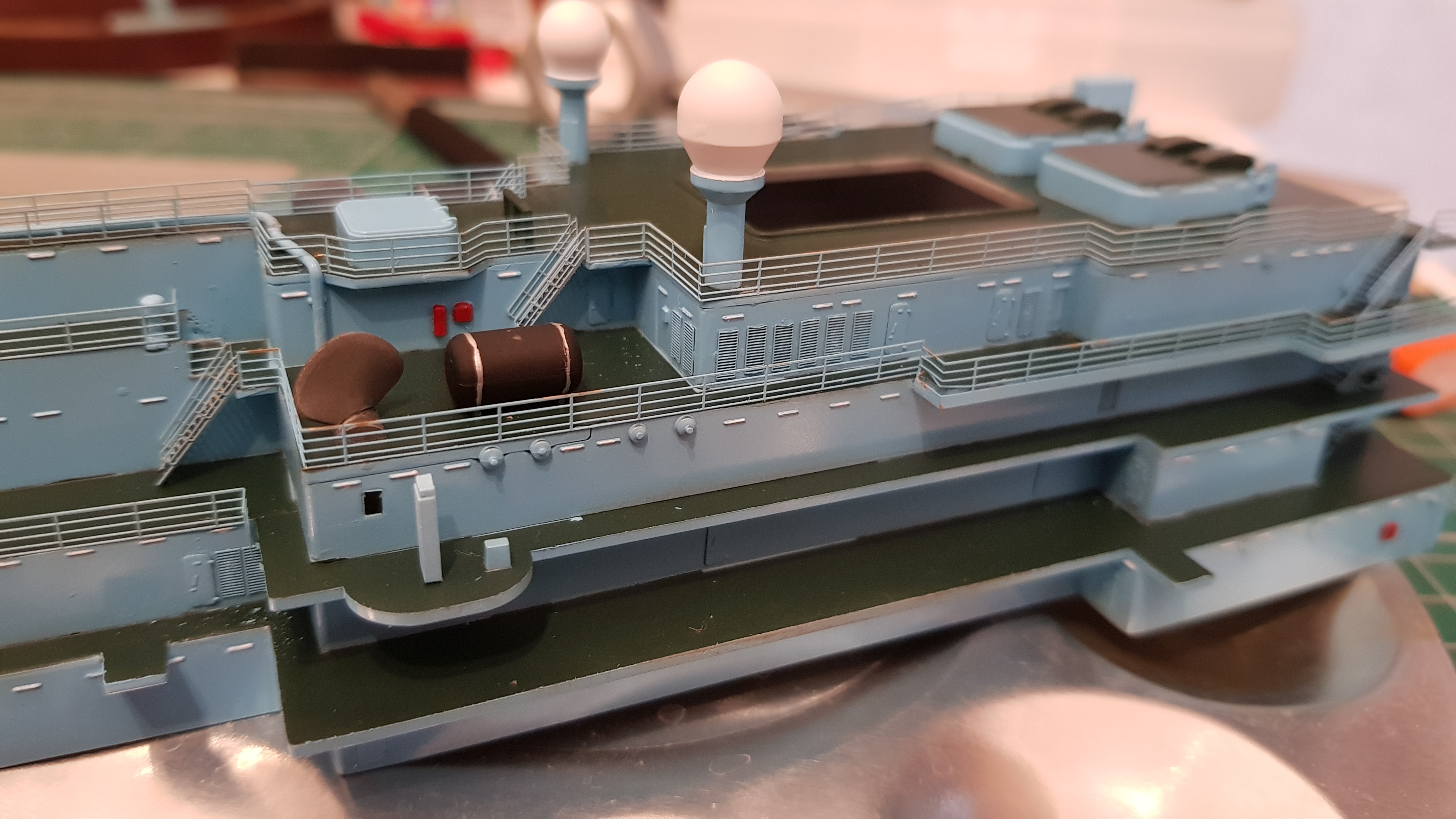 Смонтировал кучу лееров на центральной надстройке. С радиусными леерами нормально так накосячил. Дизайнерам из микродизайна мой огненный привет! Дурная затея с широкой планкой и клейкой леера в торец палубы. Собрал и покрасил мелочи на надстройку. Ну и название на мостике из цветного травления.