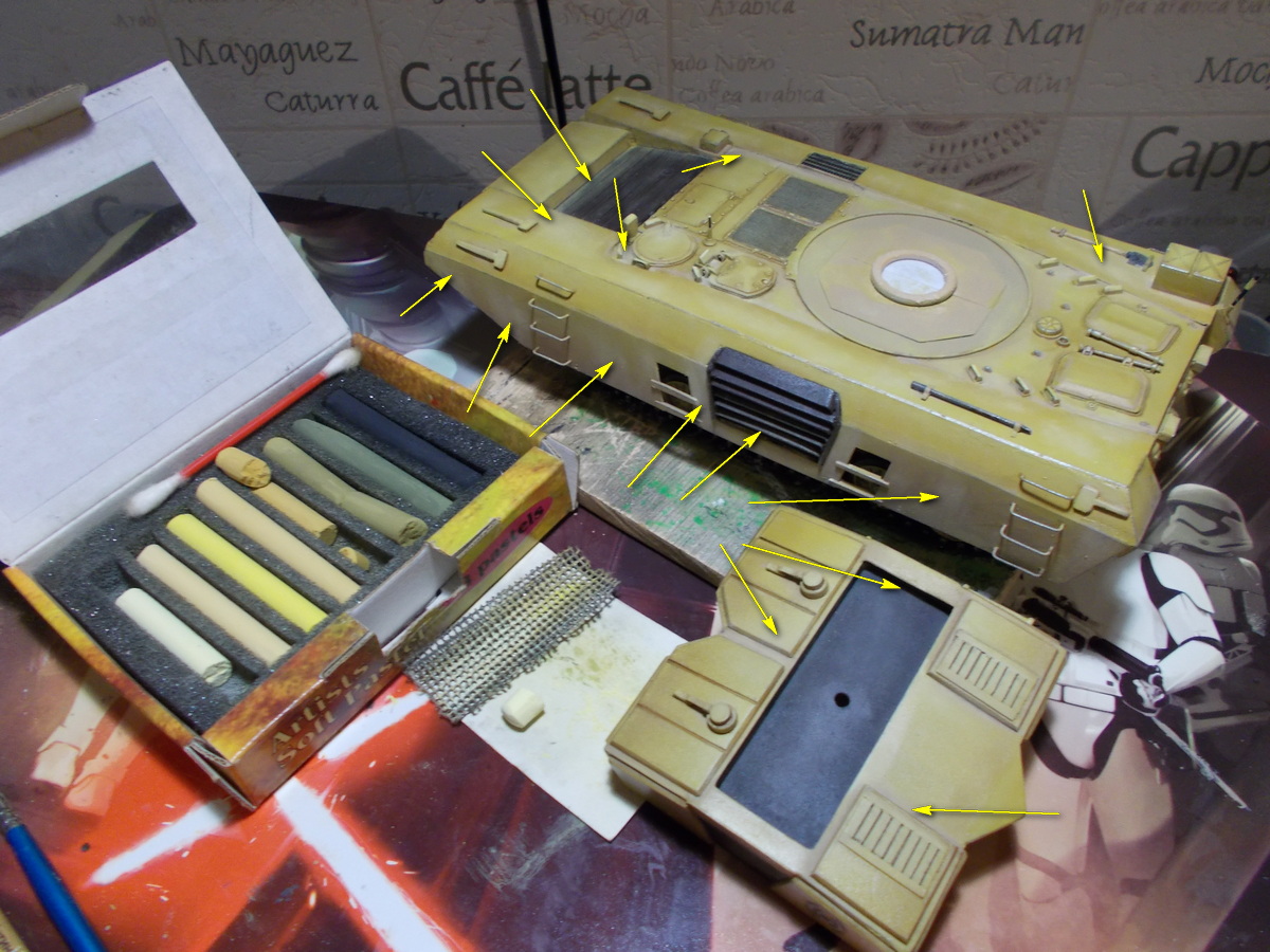 Натер края грифелем, нарисовал темно коричневым сколы и посыпал пегмент на зап траки и закрепил уайт спиритом. Как?)