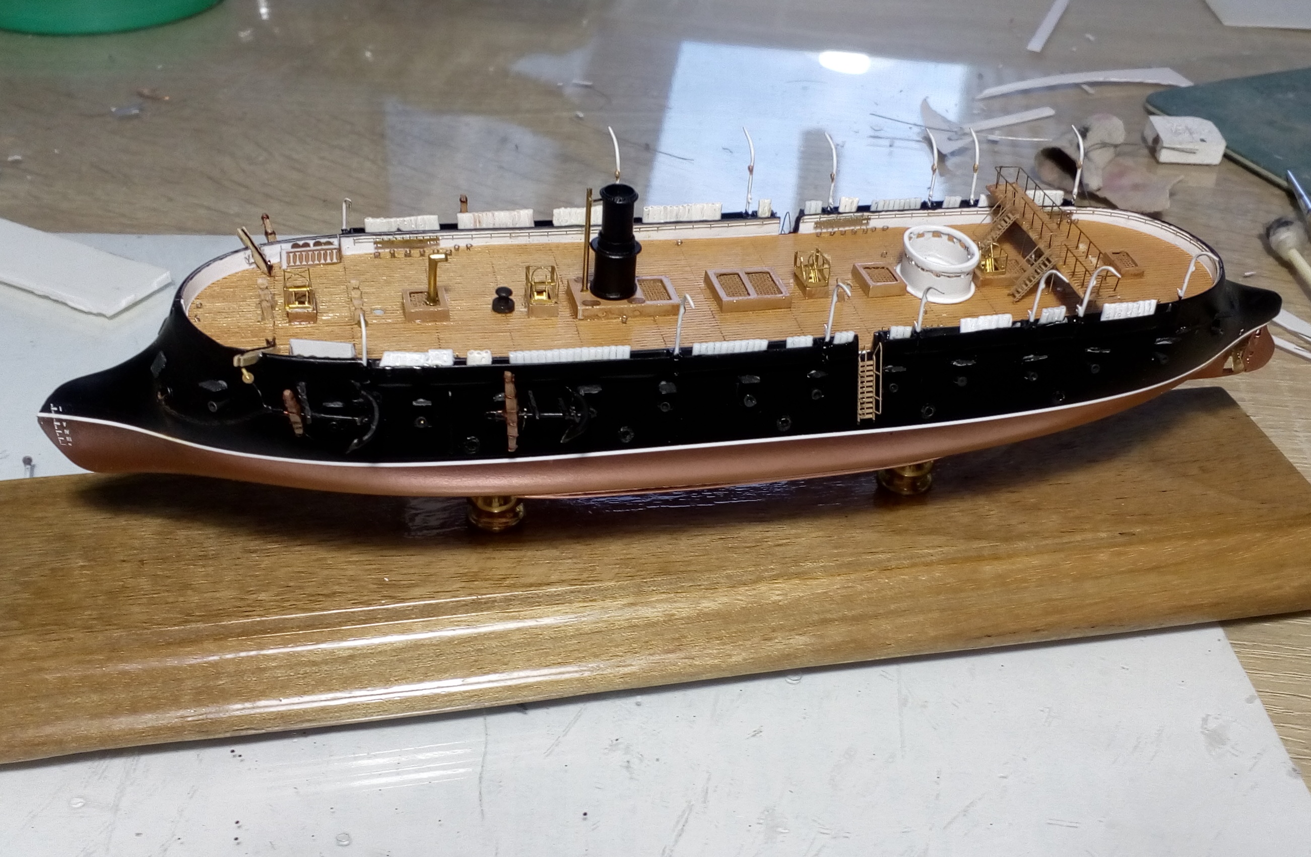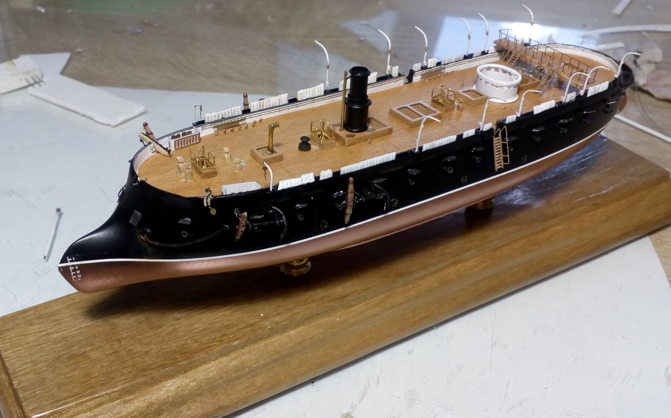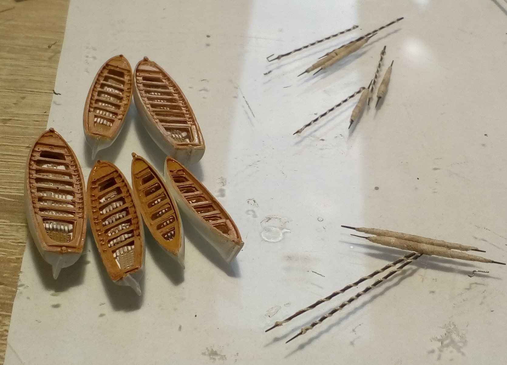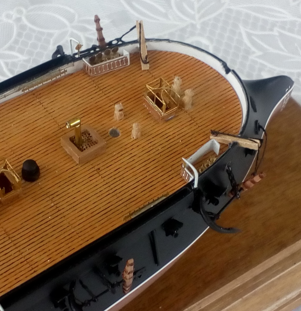На сегодняшний день прошпаклевал и погрунтовал шлюпки, сделал и установил из латунной трубки пушки, и покрасил мелочевку.