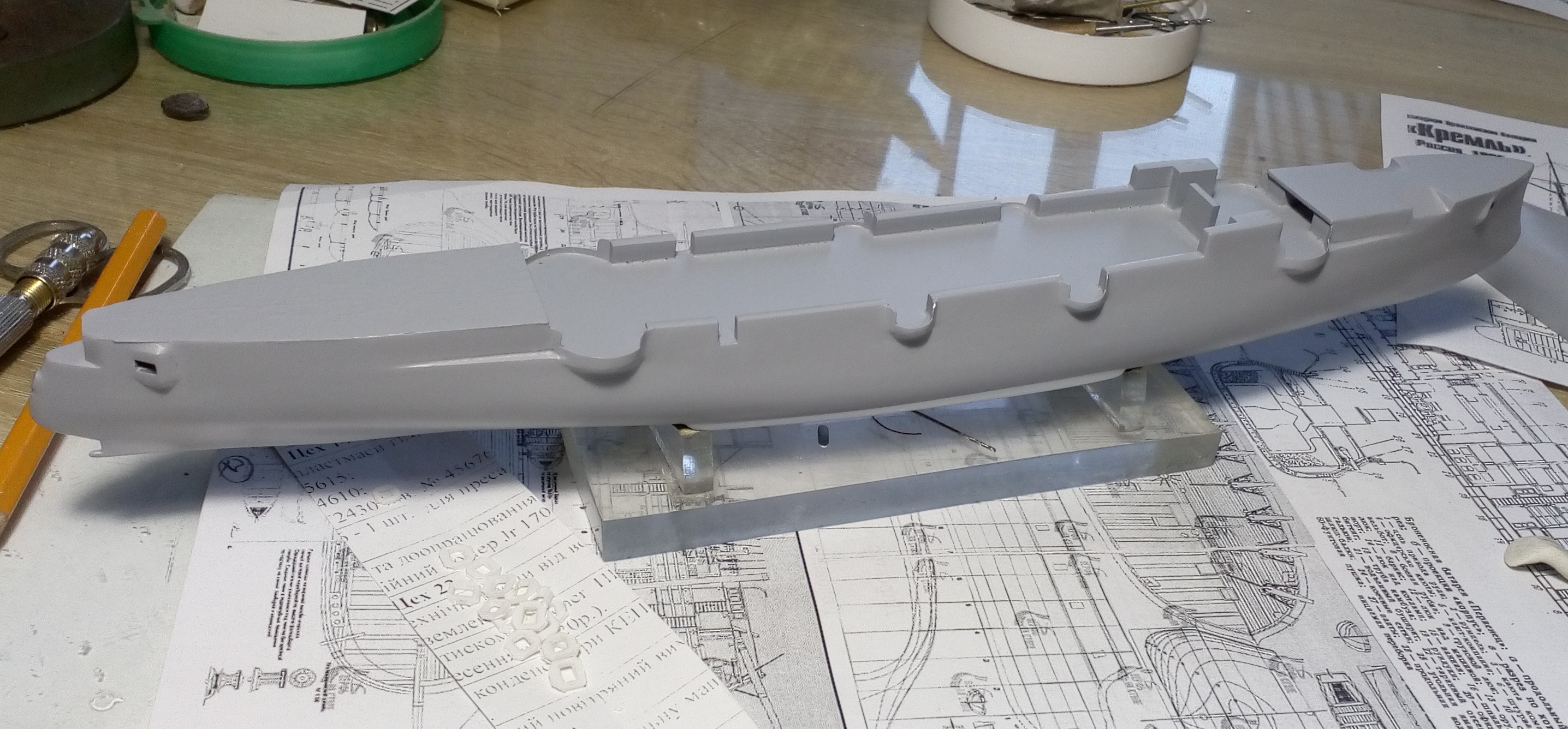По изготовлению корпусов думаю из эскиза будет понятно, палуба тоже из 1 мм пластика. Если есть казематы или пушечные порты, то в тех местах засверливаю примерно на 5-8 мм и делаю вставки из 1мм пластика. Дальше все это клею на цианопановый клей , обрабатываю наждачкой примерно R40 (самой крупной что есть),если вмятины или еще какие дефекты то шпаклюю полиэфирной шпаклевкой, а далее мелкой наждачкой. Потом грунтую, применяю нитро грунтовку "Макси Колор" Беларускую. После первого слоя слегка шлифую и наношу второй.Все готово к окраске, кстати крашу корпуса тоже краской из балончиков той же фирмы, что и грунтовка. Получается быстрее чем аэрогрофом и лучше, да и дешевле намного, хотя у меня аэрографов 3 шт и не дешевых. Мелочовку да крашу аэрографом. Вообще для меня изготовлене корпусов это самый интересный момент в работе над моделью, начинаешь один и не можешь остановиться.