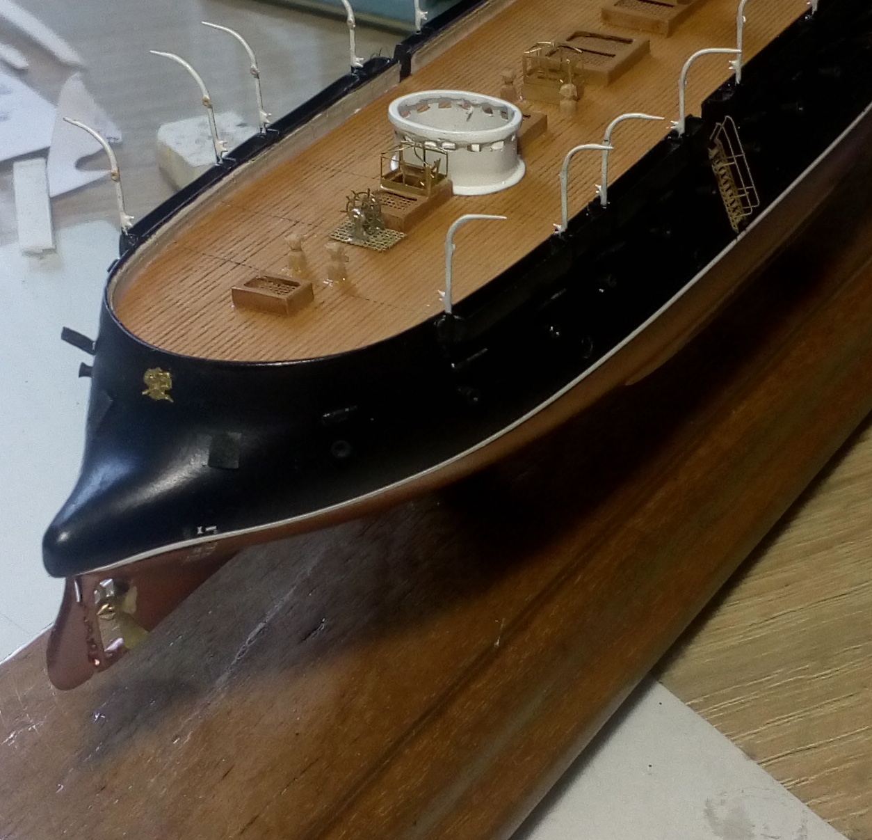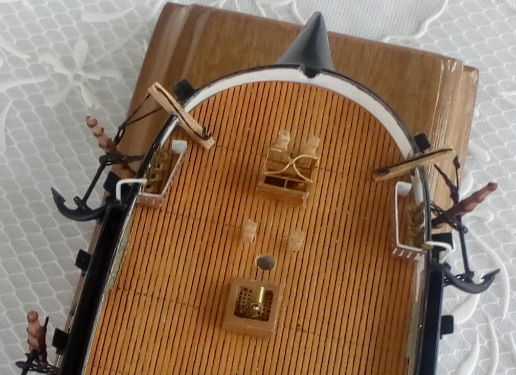 Стройка потихоньку идет вперед. Сегодня установил шлюпбалки, которые вчера сделал и покрасил, а также установил гребной винт и якоря. Сними пришлось повозиться, кучу всяких цепочек и ниточек, но к сажелению на фото их почти не заметно, сливаются с бортом.