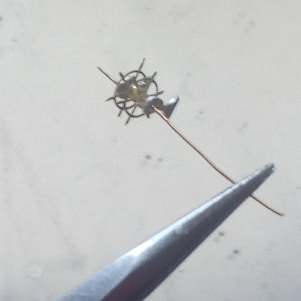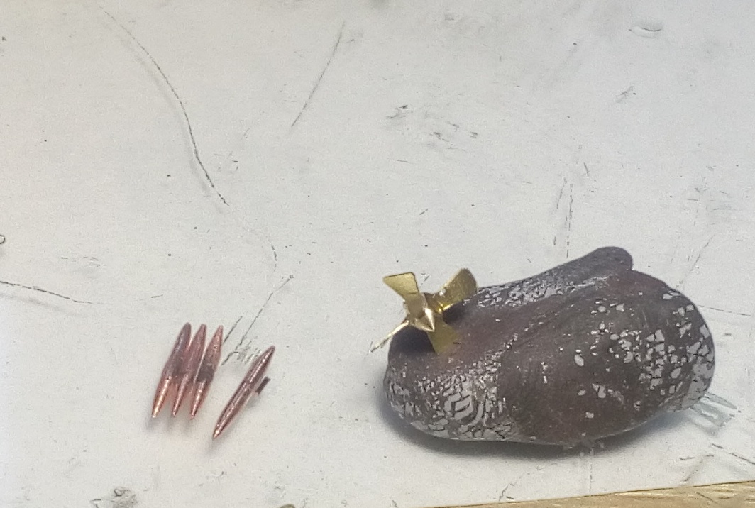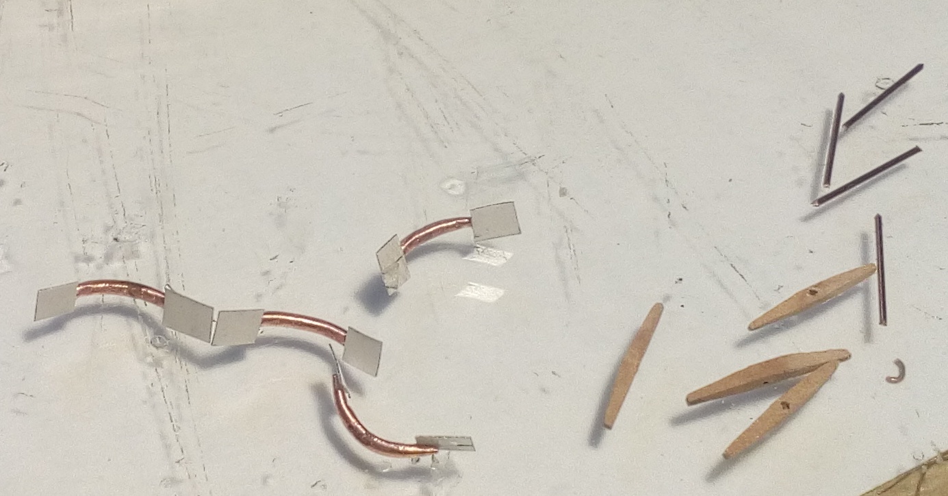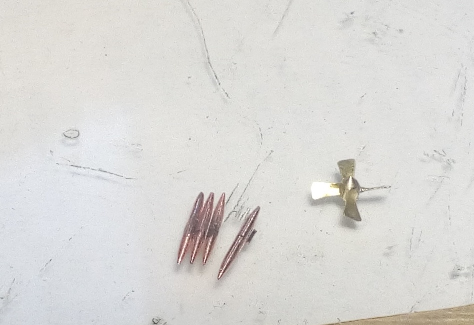 Сегодня из остатков фототравления и латунного болтика М4 был изготовлен гребной винт, а также мачтовые битенги и крамбол. Четыре кусочка медной проволоки на фото, это будущие адмиралтейские якоря.