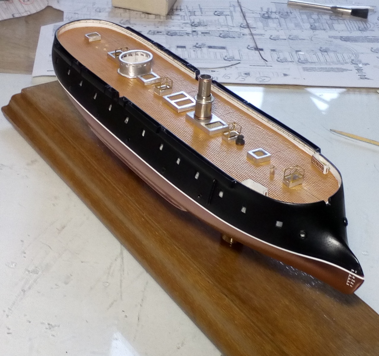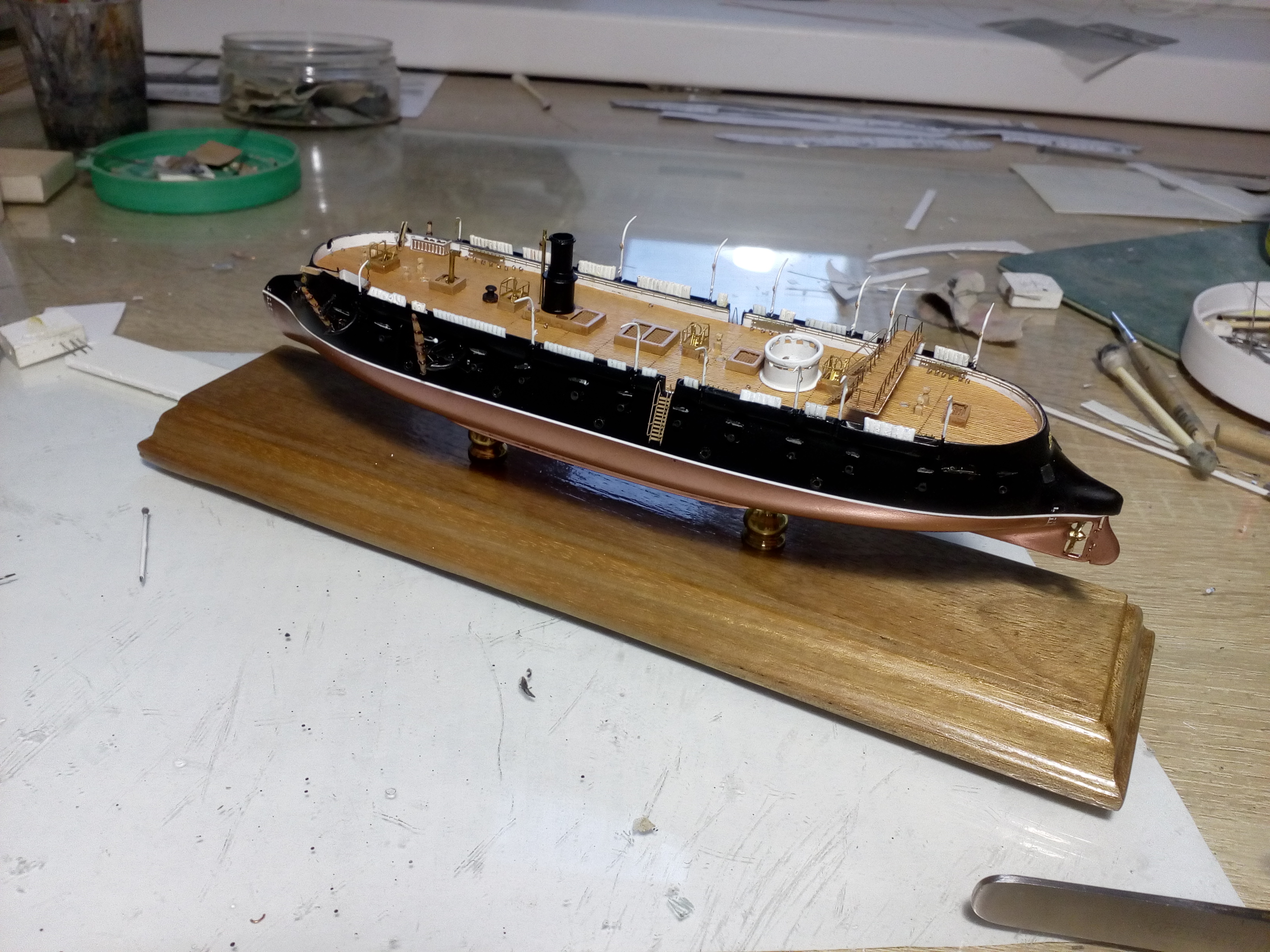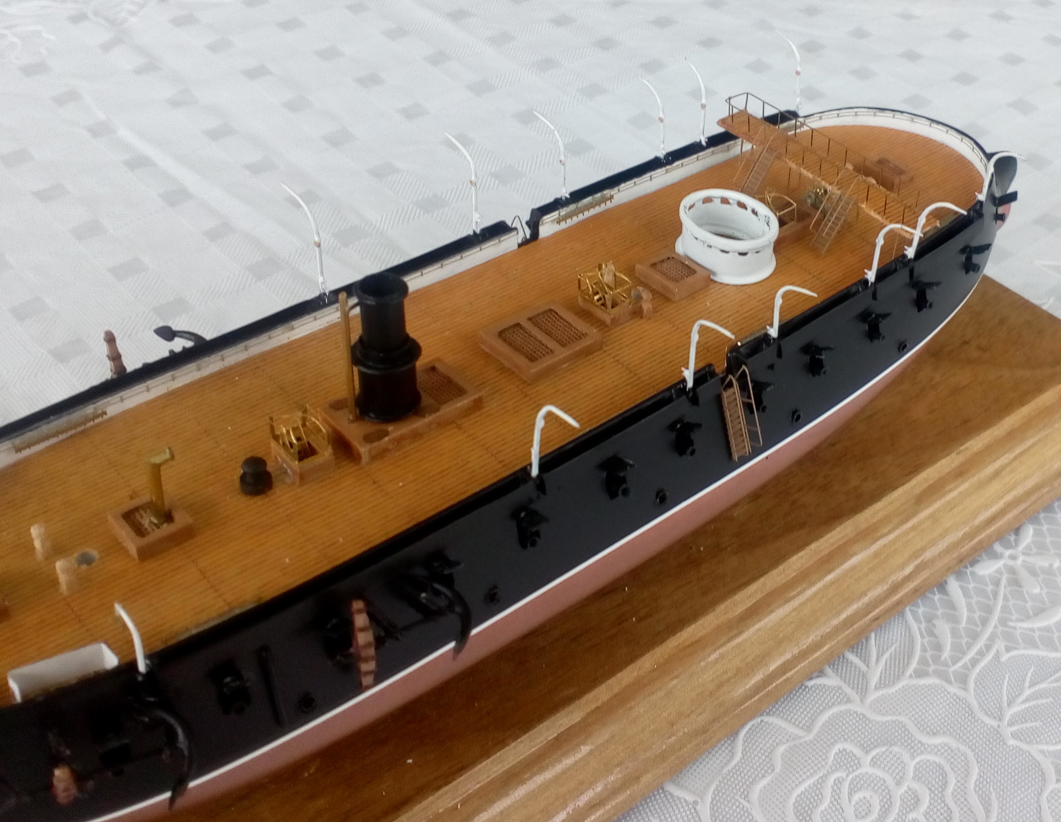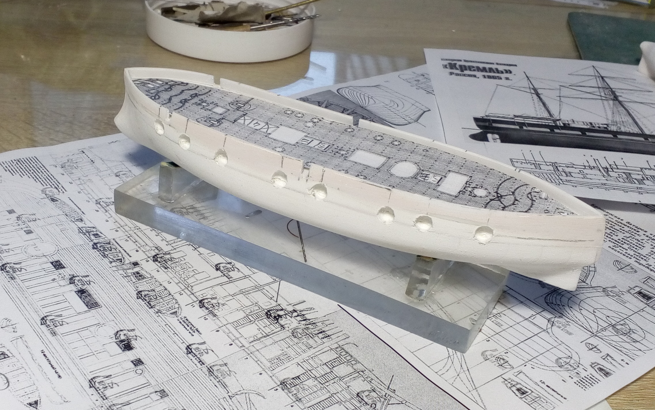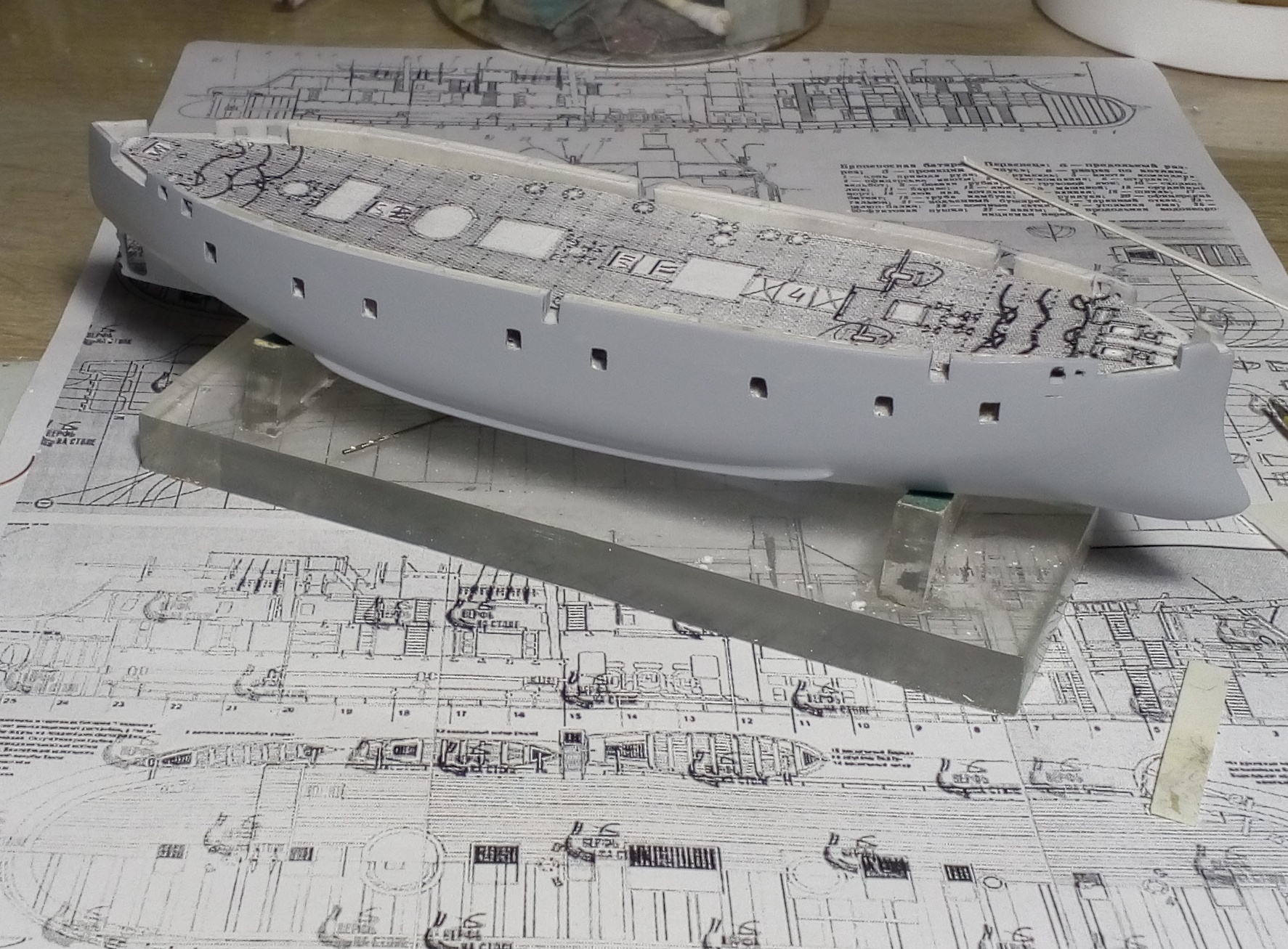 На сегодняшний день получается вот такой мухожук. Корпус полностью окрашен, приклеена палуба, сделана труба из старой антены от телевизора и командный носовой гальюн. Может кто-нибудь подскажет какими были крышки пушечных портов изнутри?