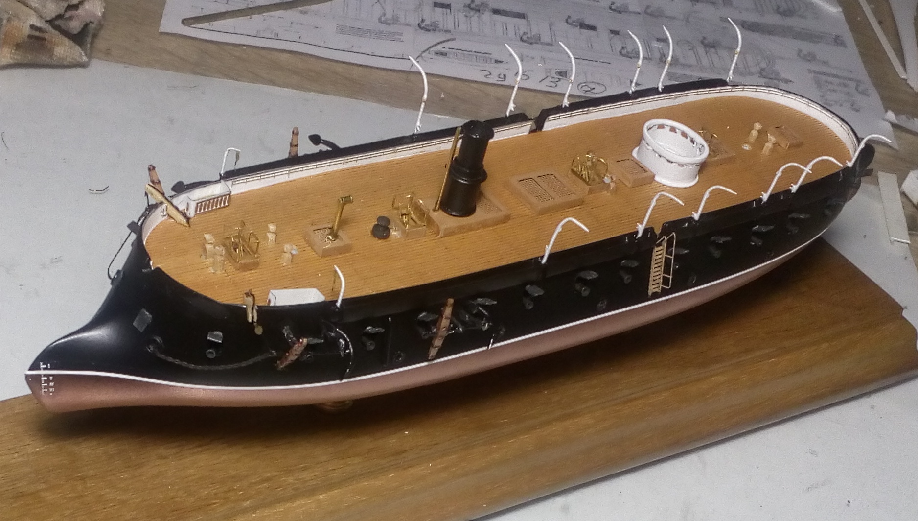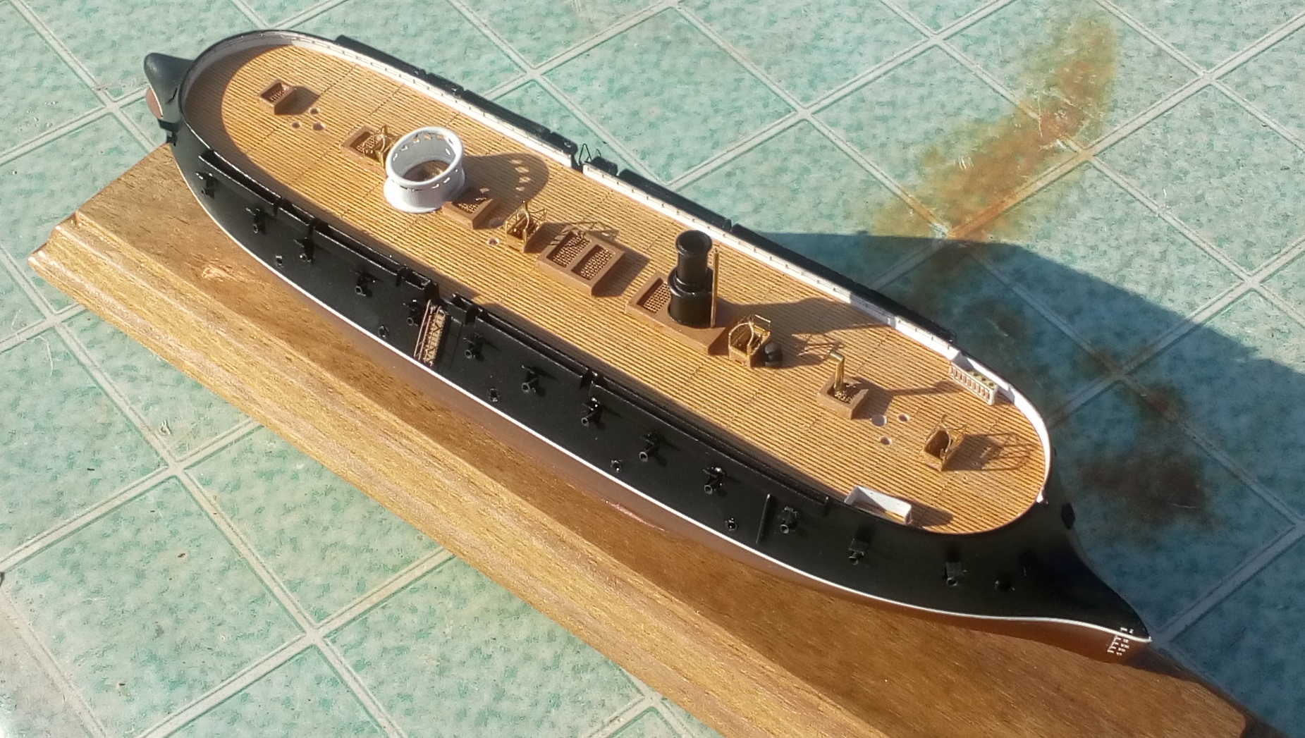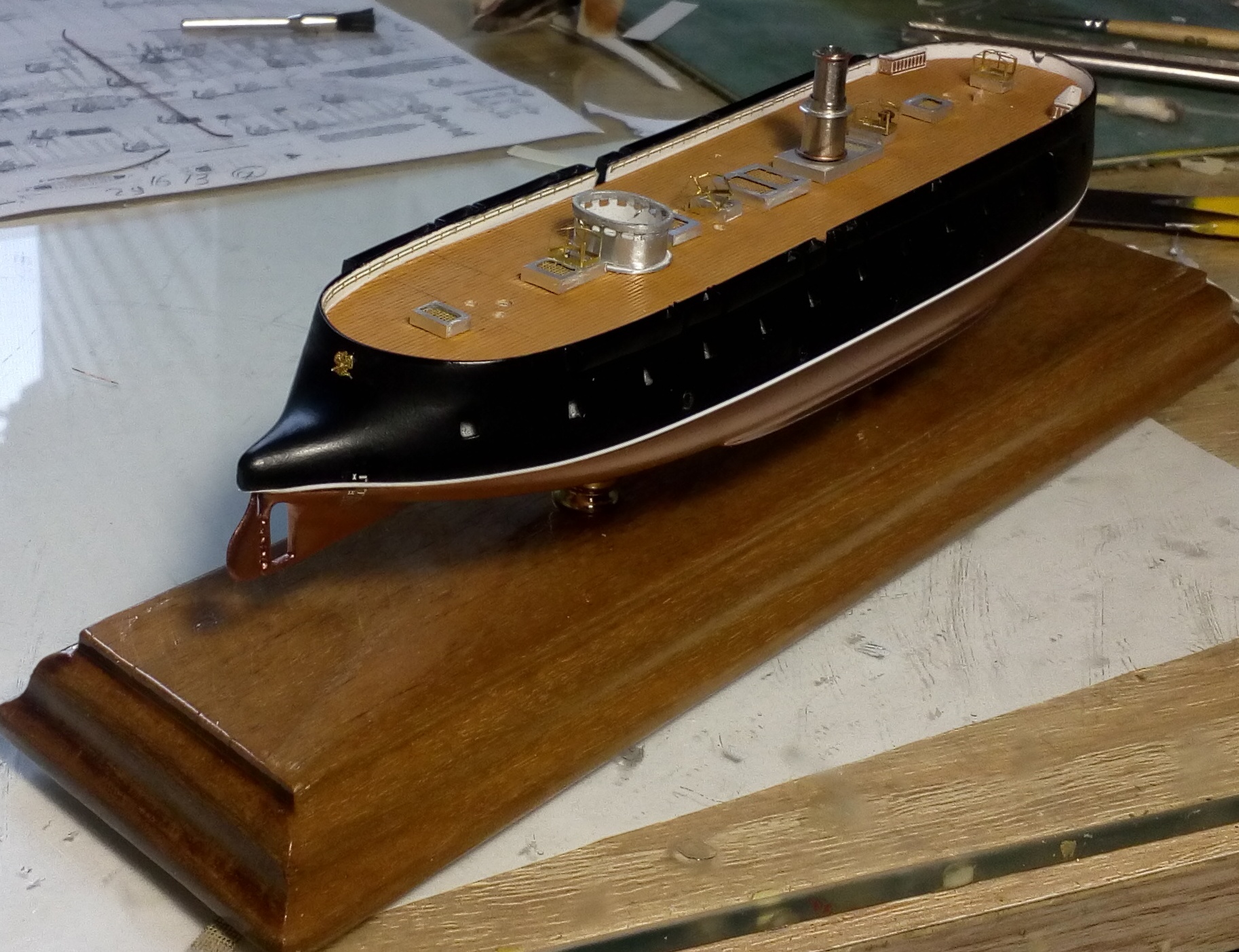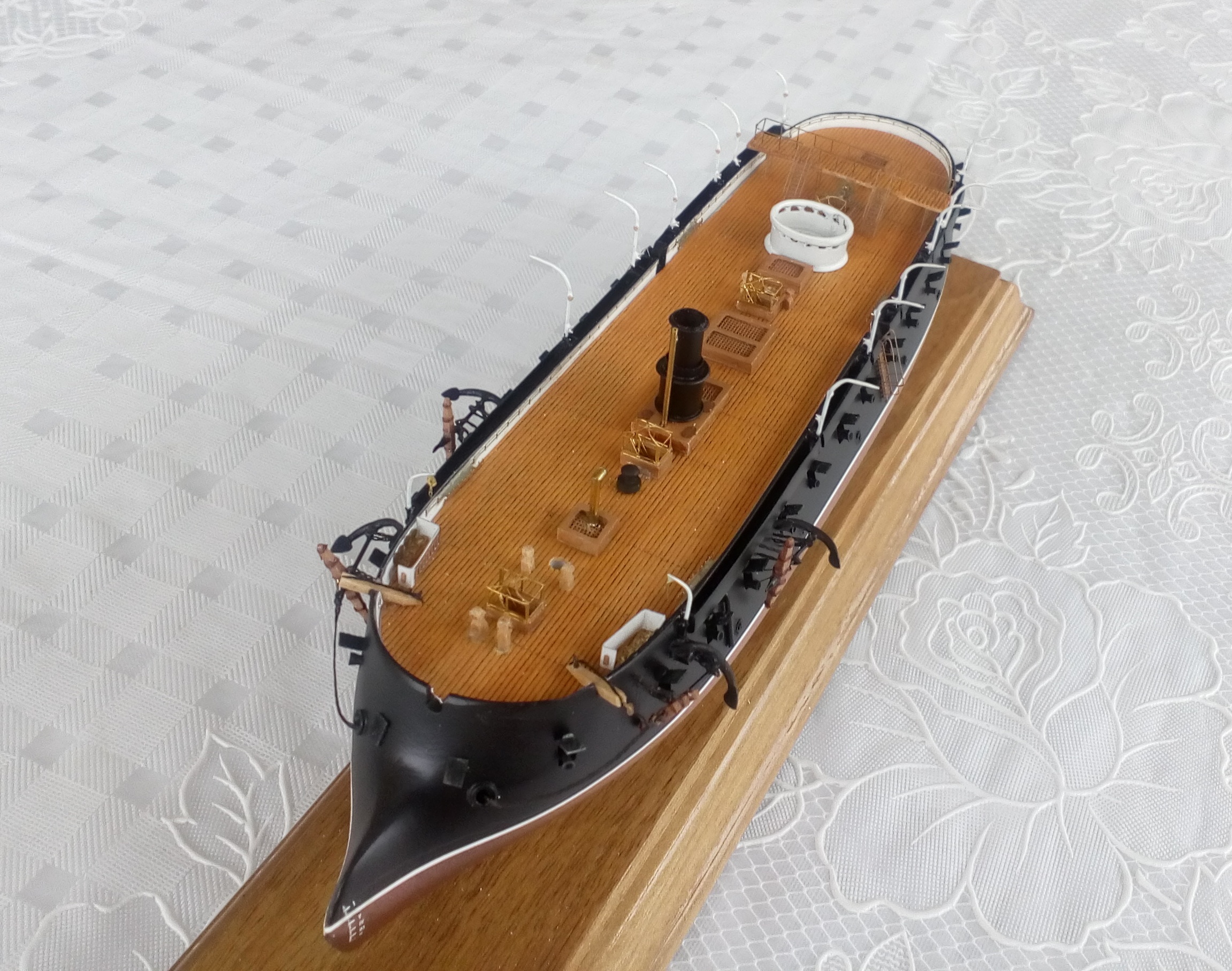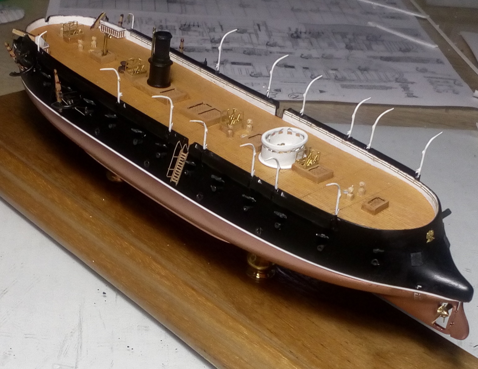 На сегодняшний день получается вот такой мухожук. Корпус полностью окрашен, приклеена палуба, сделана труба из старой антены от телевизора и командный носовой гальюн. Может кто-нибудь подскажет какими были крышки пушечных портов изнутри?