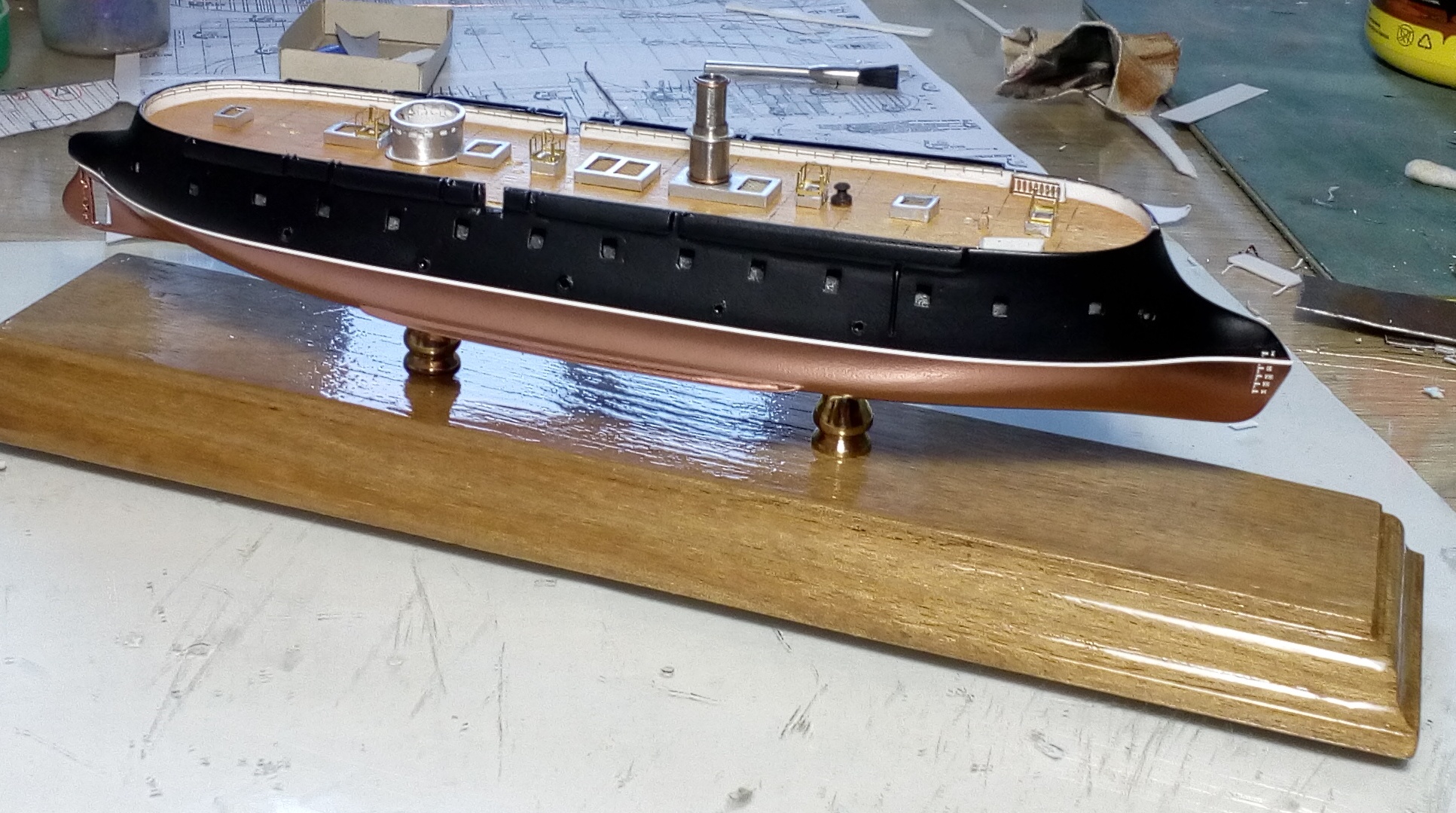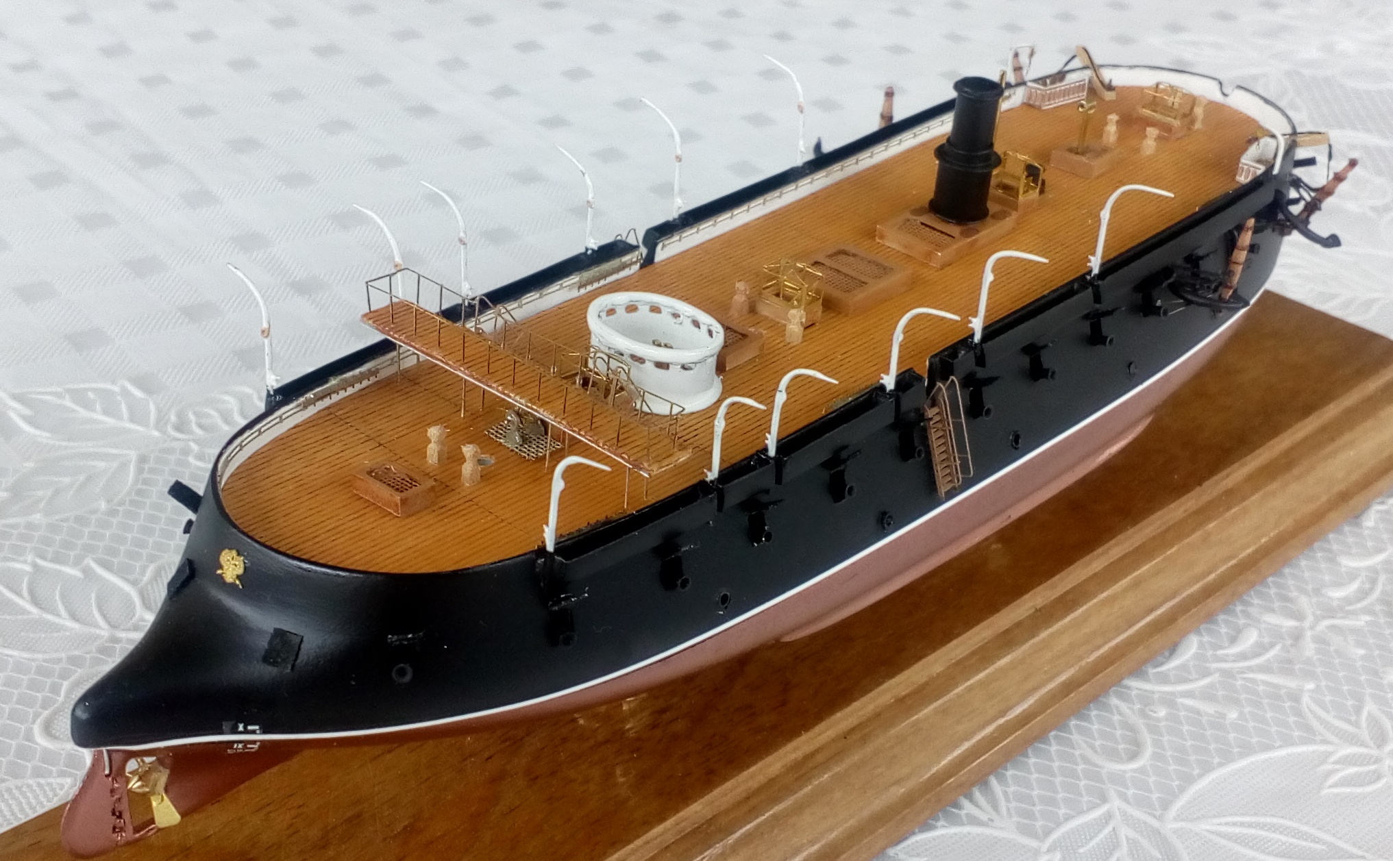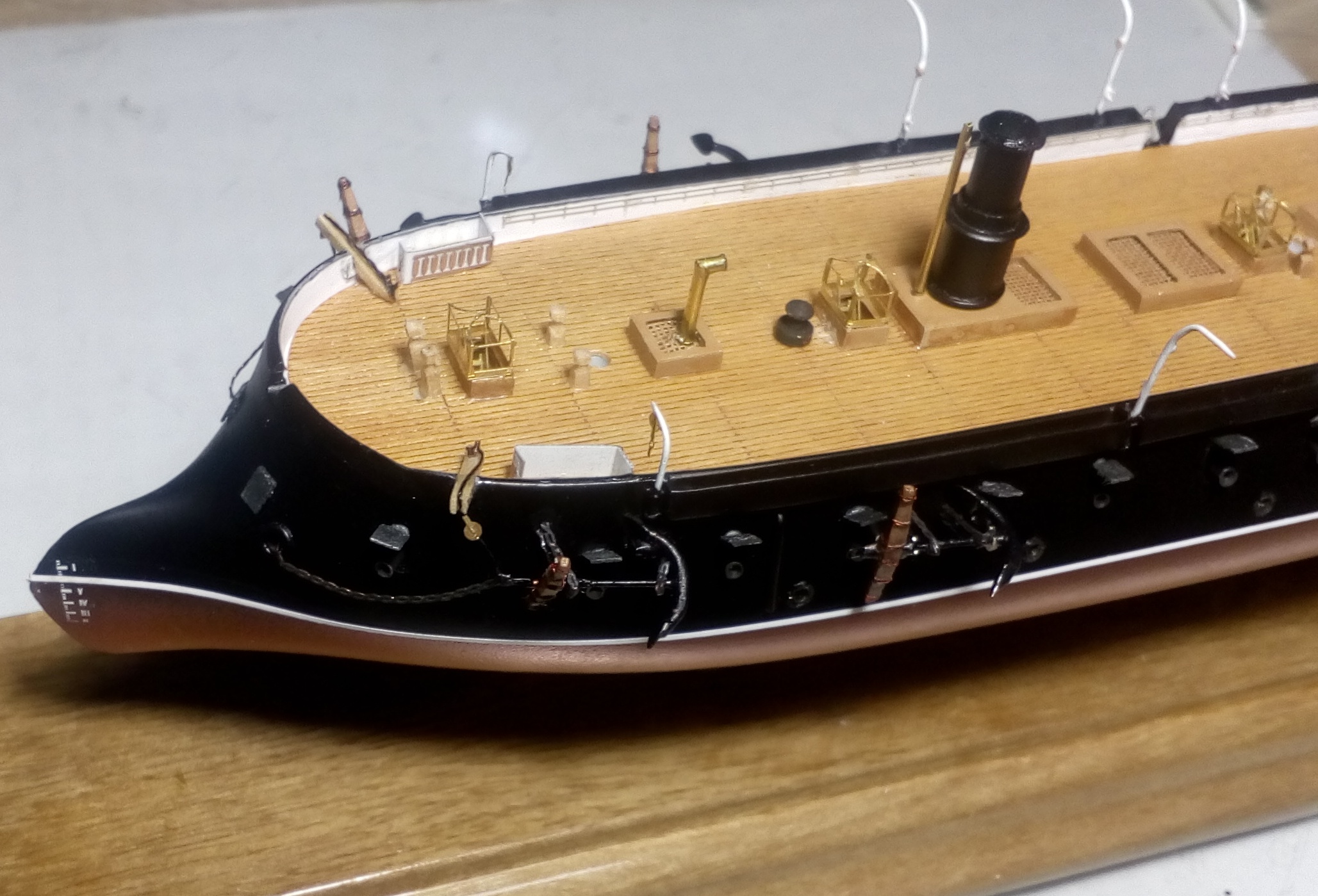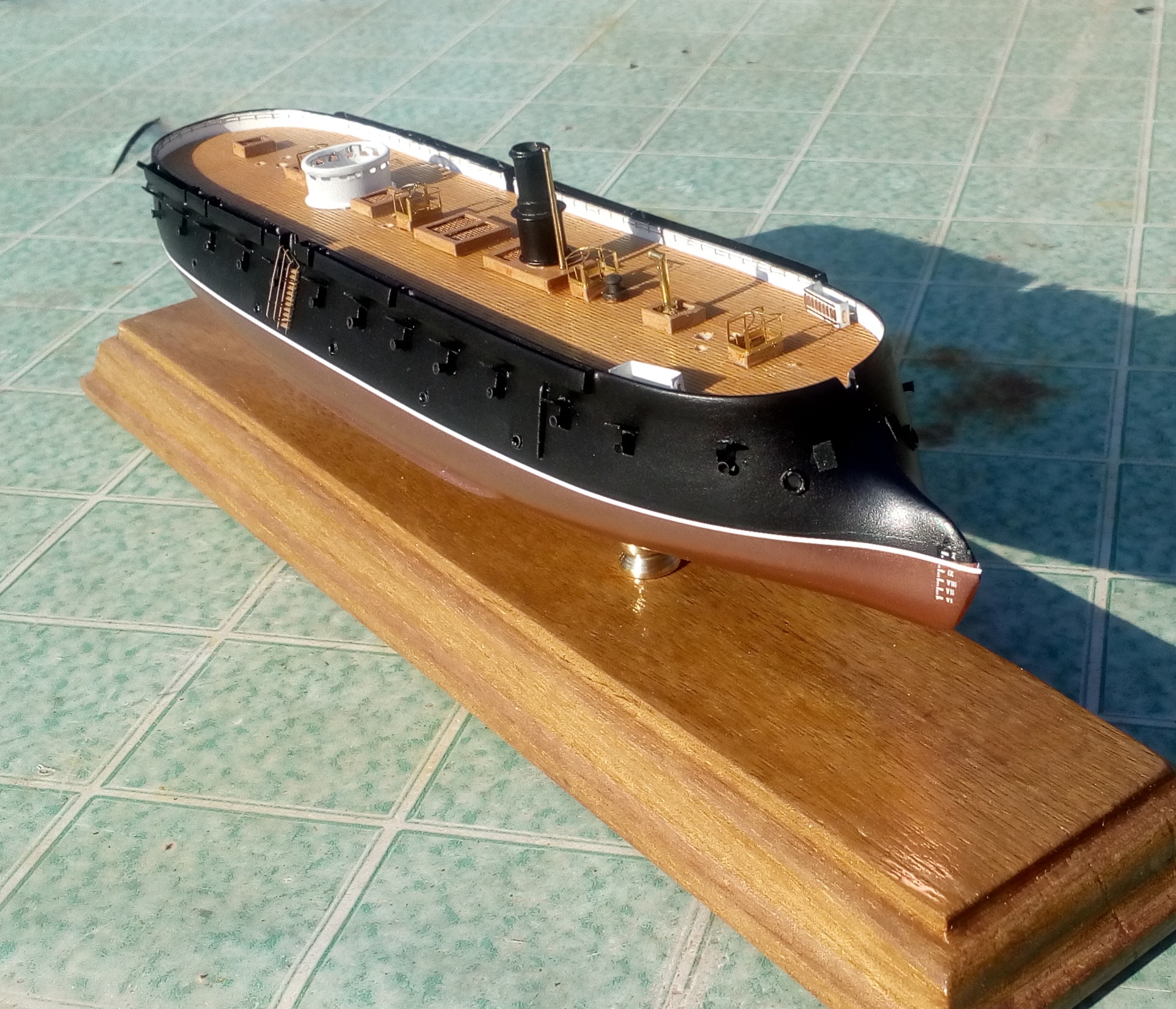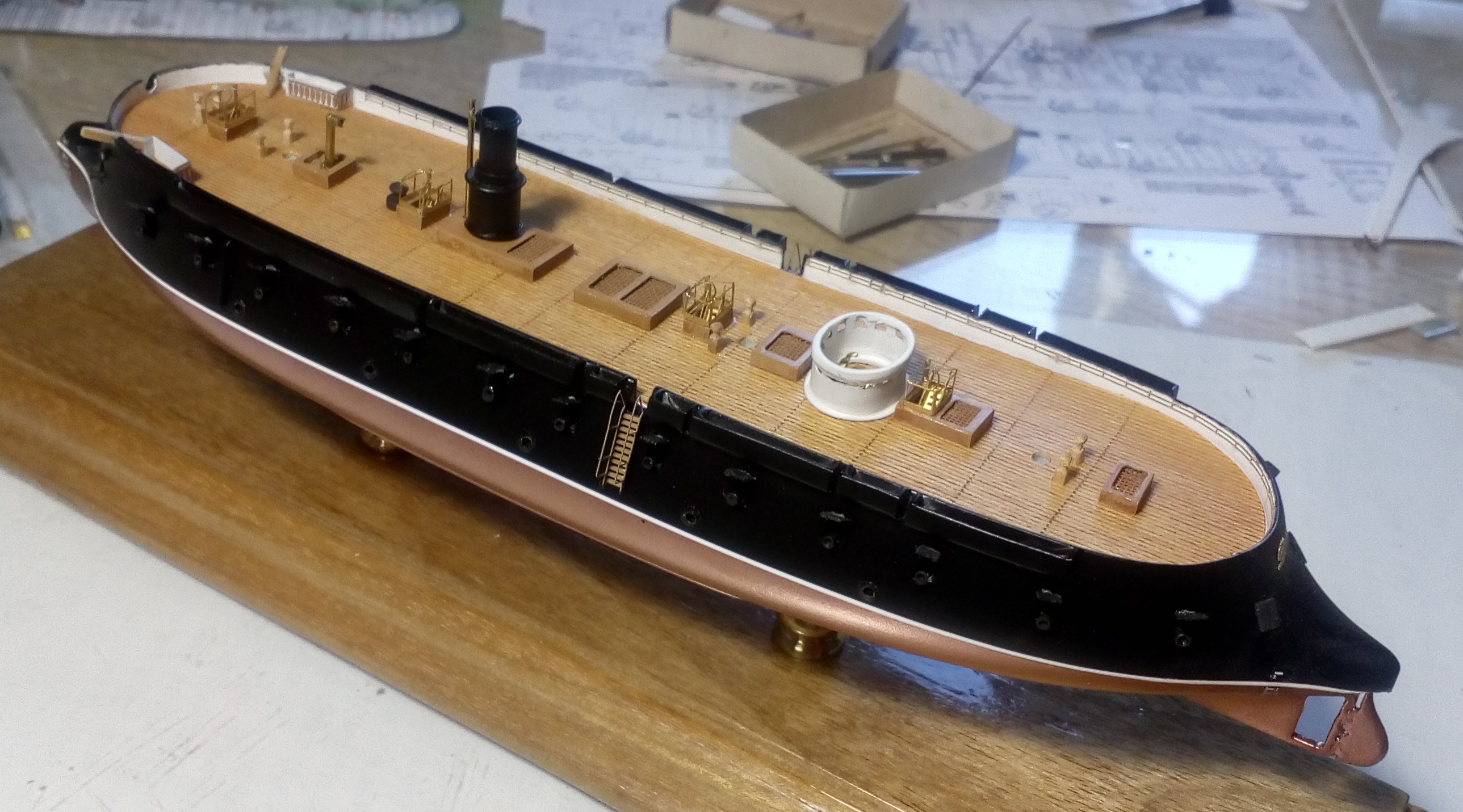 На сегодняшний день получается вот такой мухожук. Корпус полностью окрашен, приклеена палуба, сделана труба из старой антены от телевизора и командный носовой гальюн. Может кто-нибудь подскажет какими были крышки пушечных портов изнутри?