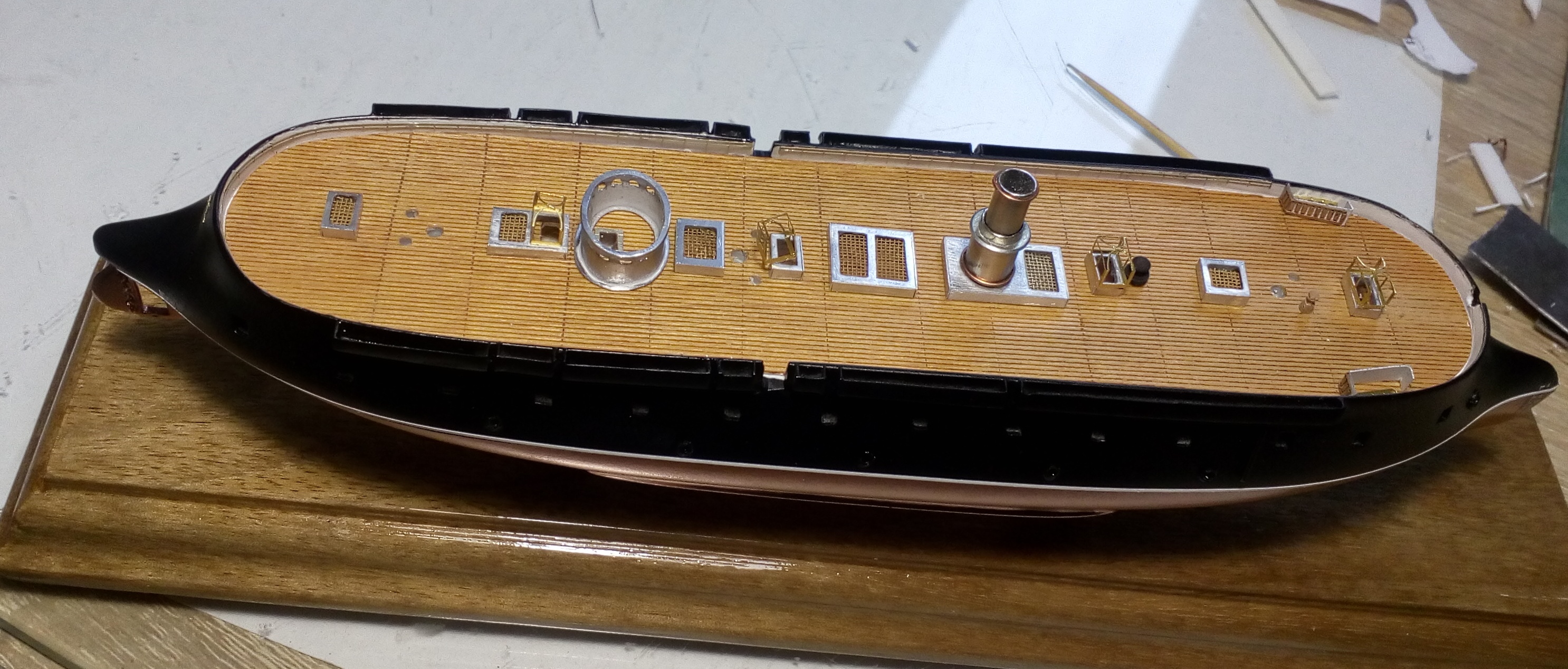 Теперь вернемся к "Первенцу". За сегодняшний день была вырезана и подогнана палуба, и начал делать световые и сходные люки.
