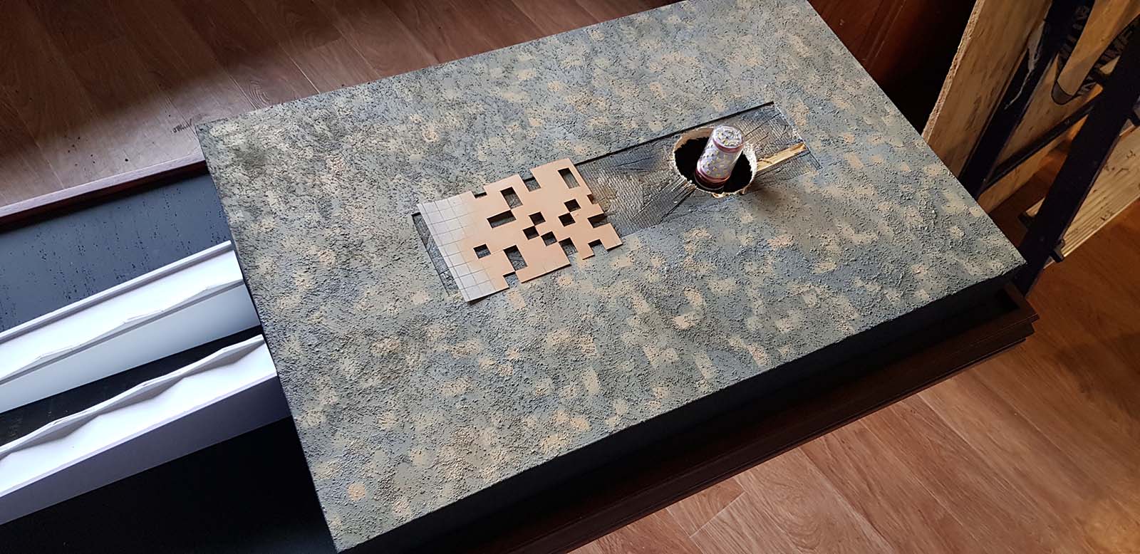 Далее, XF-15 высветляю по граням, а также делаю разлиновку имитируя плиты известняка. Для этого сделал небольшой шаблон из картона, вырезав в нем хаотично квадраты разного размера и напыляю краску уже через шаблон. Регулируя плотность нанесения можно регулировать тональность
