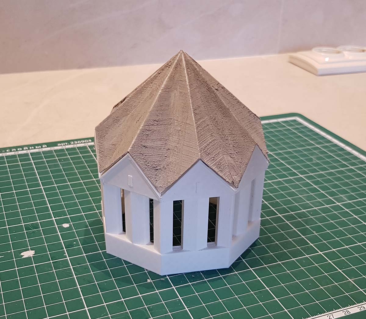 Напечатал стены центральной главы храма и шатровую кровлю. Кровлю тестово покрыл цементом. Хотел попробовать фактуру придать. Вполне жизнеспособно, но цемент держится на троечку. Надо его чем-то фиксировать. Потом подумаю чем. Цемент наносил просто пальцем и как бы штукатурил, а затем ровнял линейкой как правилом