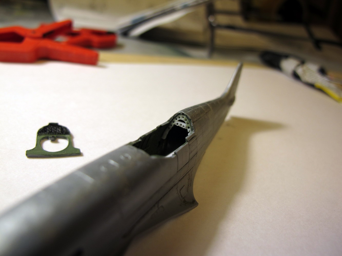 После окончательной примерки выяснилось, что после сборки фюзеляжа и установки фонаря видны будут только задняя перегородка, кресло и прицел. В связи с этим решил не заморачиваться доработками. Позже добавлю ремни на кресло.