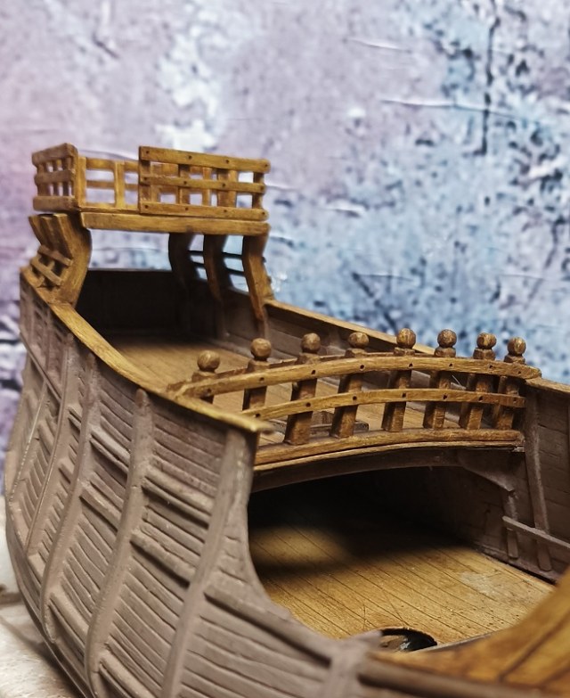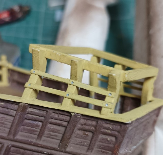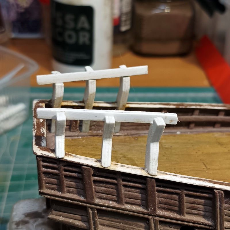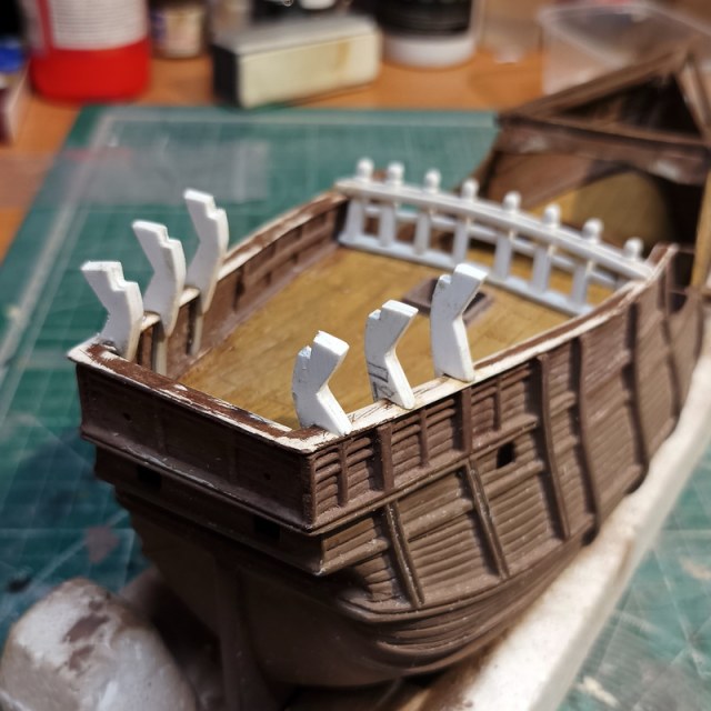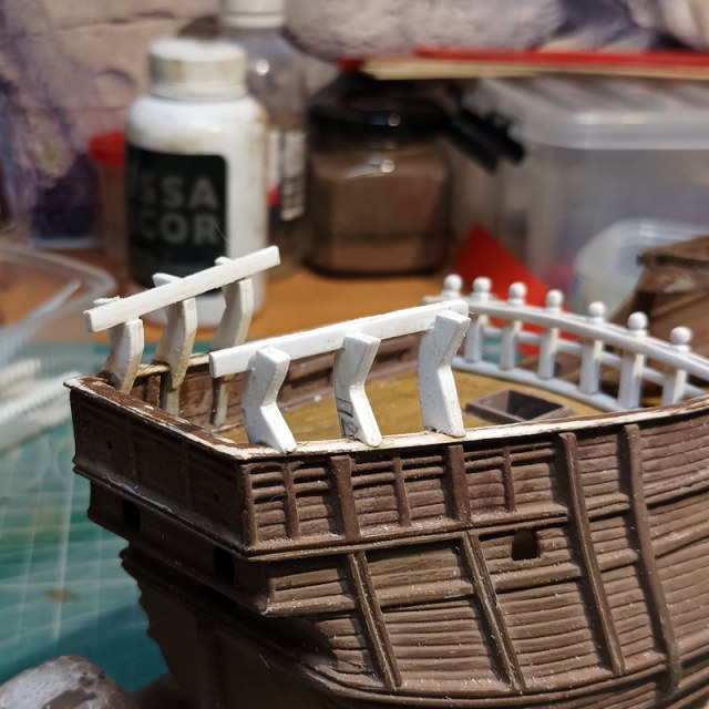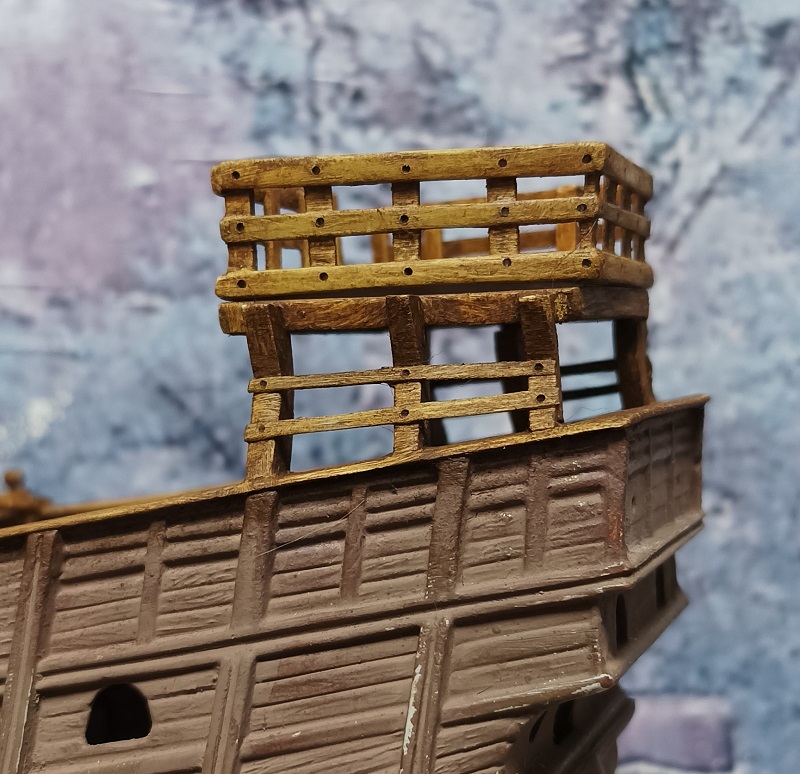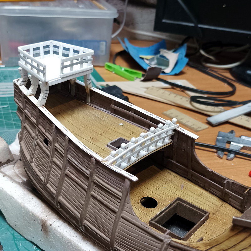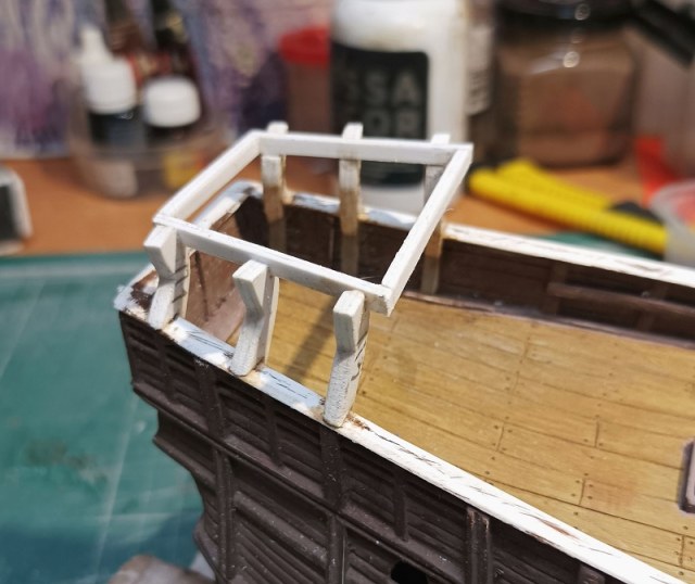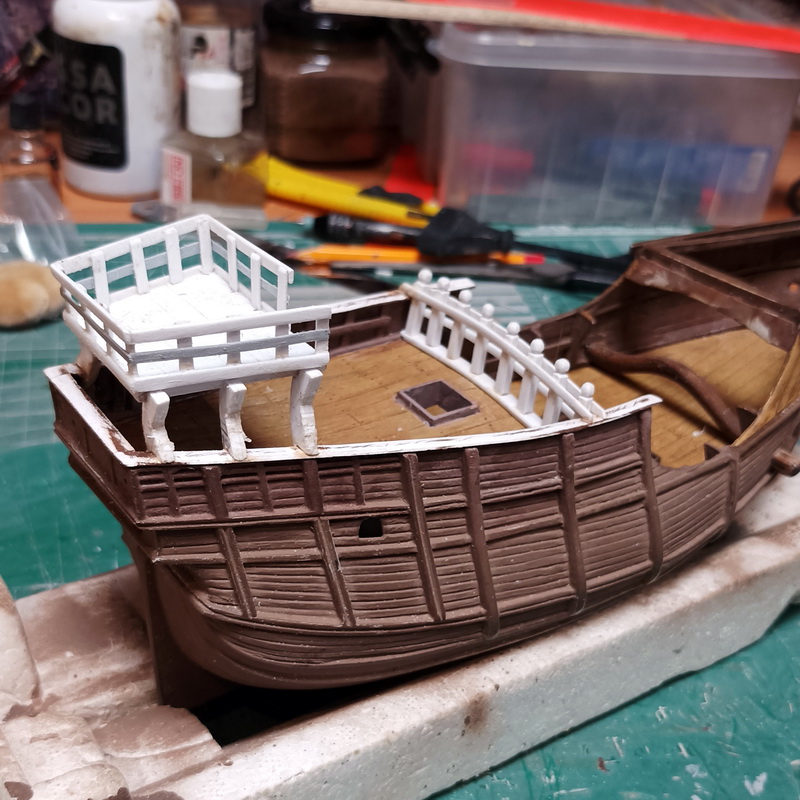 Ограждения форкастля, кватердека и архекастля покрыл светлой акриловой базой.