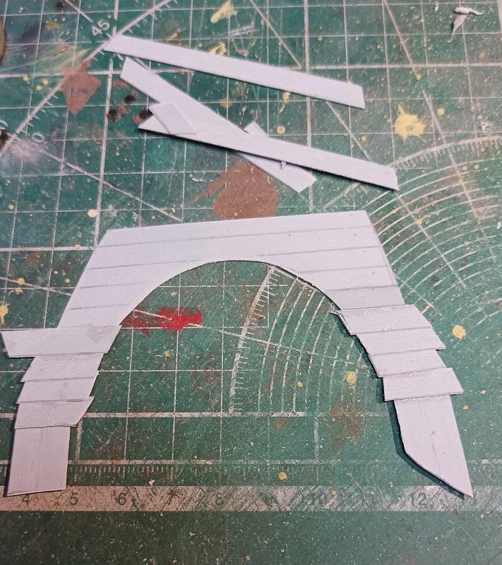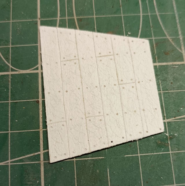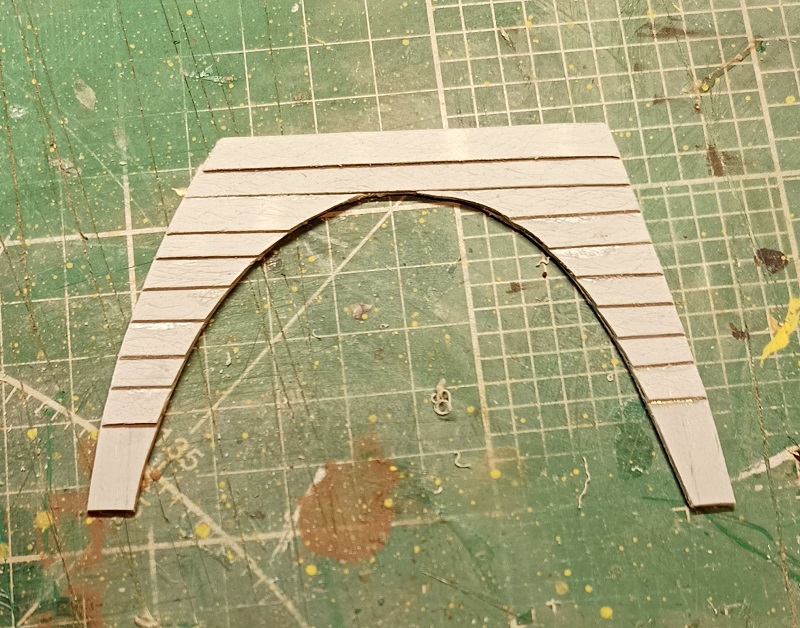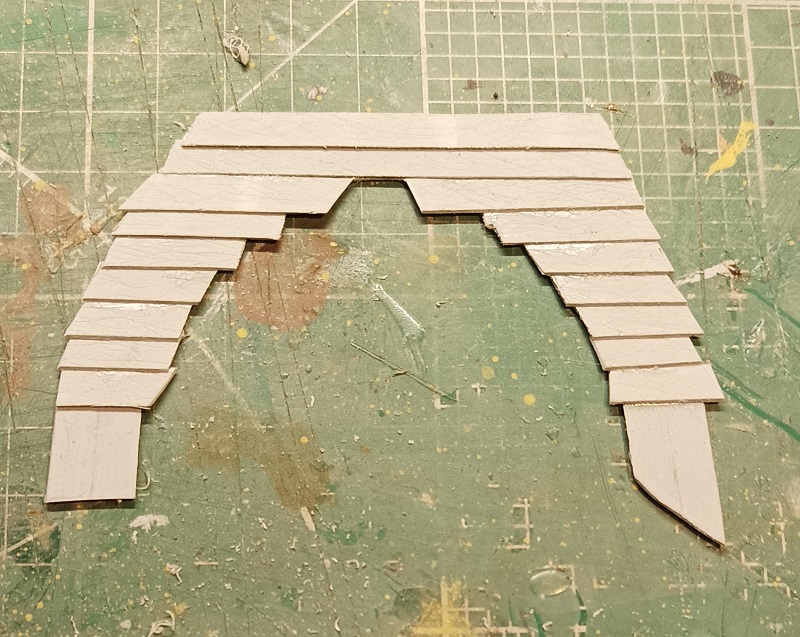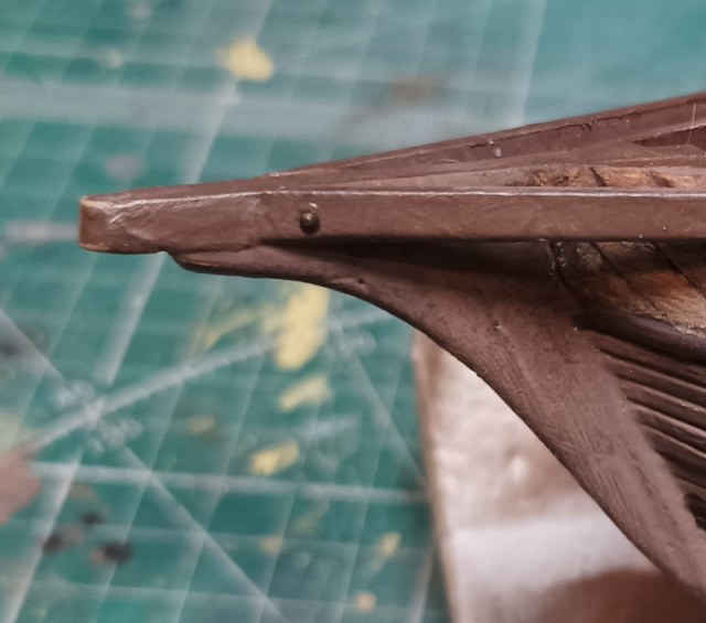 Потом по шаблону вырезал черновую основу, нарезал "досок", нанес на них структуру дерева уже отработанным методом: крупная шкурка-модельный нож-мелкая шкурка и наклеил доски на основу имитируя клинкерную обшивку.