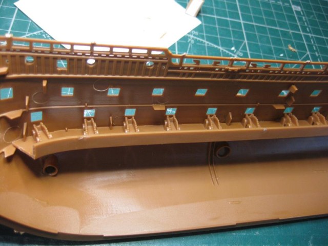 по поводу непотопляемости. может пока не склеены половинки сделать лекало "палубы" под орудийными блоками, а потом вырезать из пластика и вклеить под пушками нижнего ряда. Тогда даже ( или когда) если вода через орудийные порты попадет внутрь, далеко не утечет и затопления не будет.