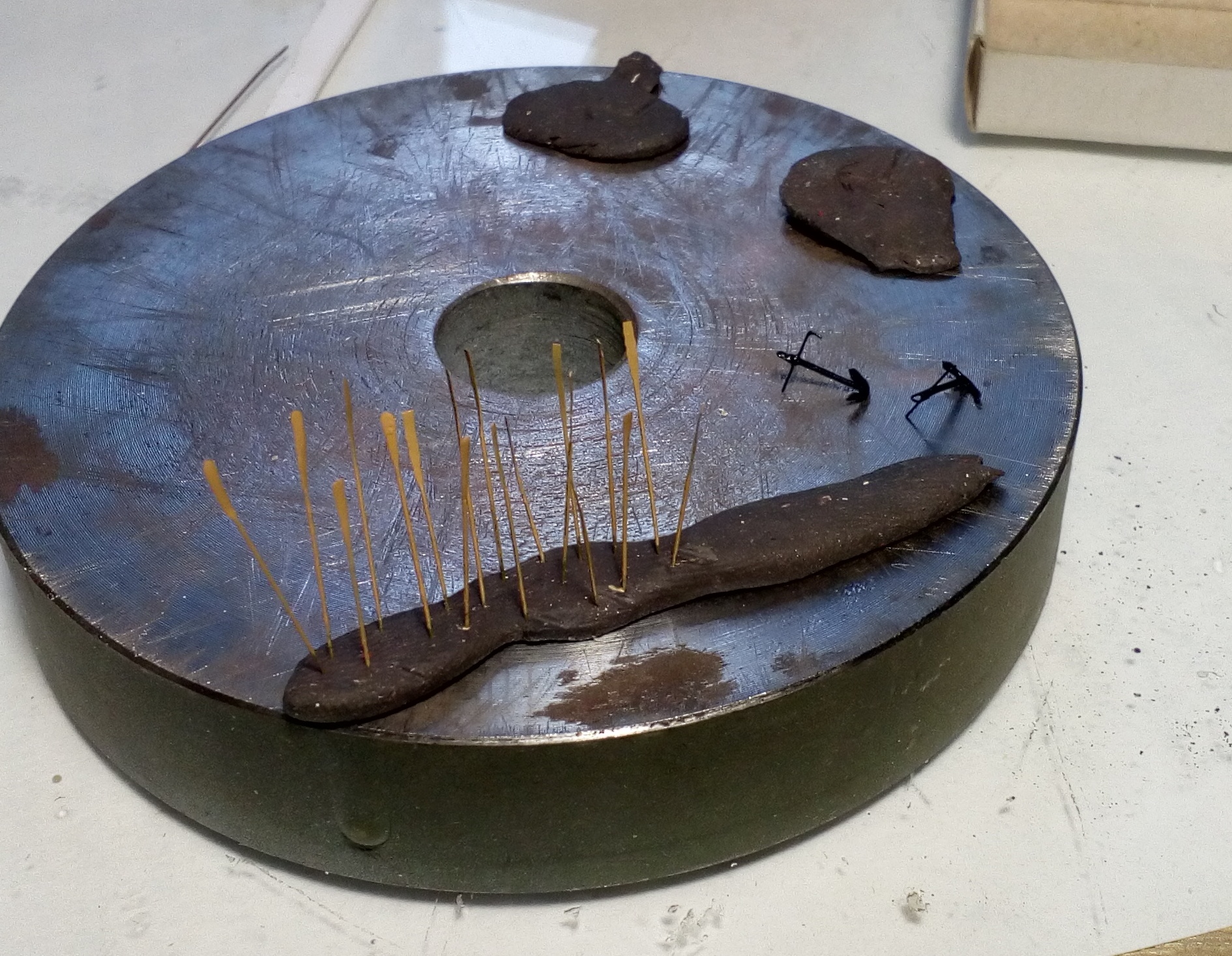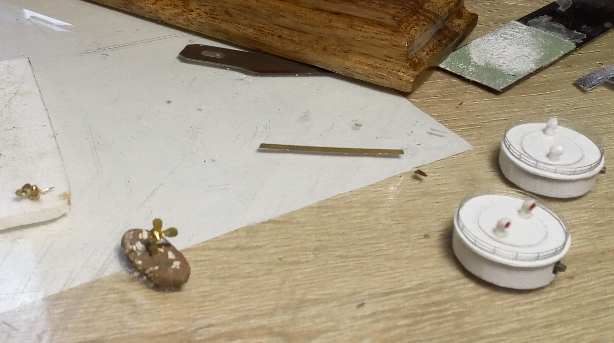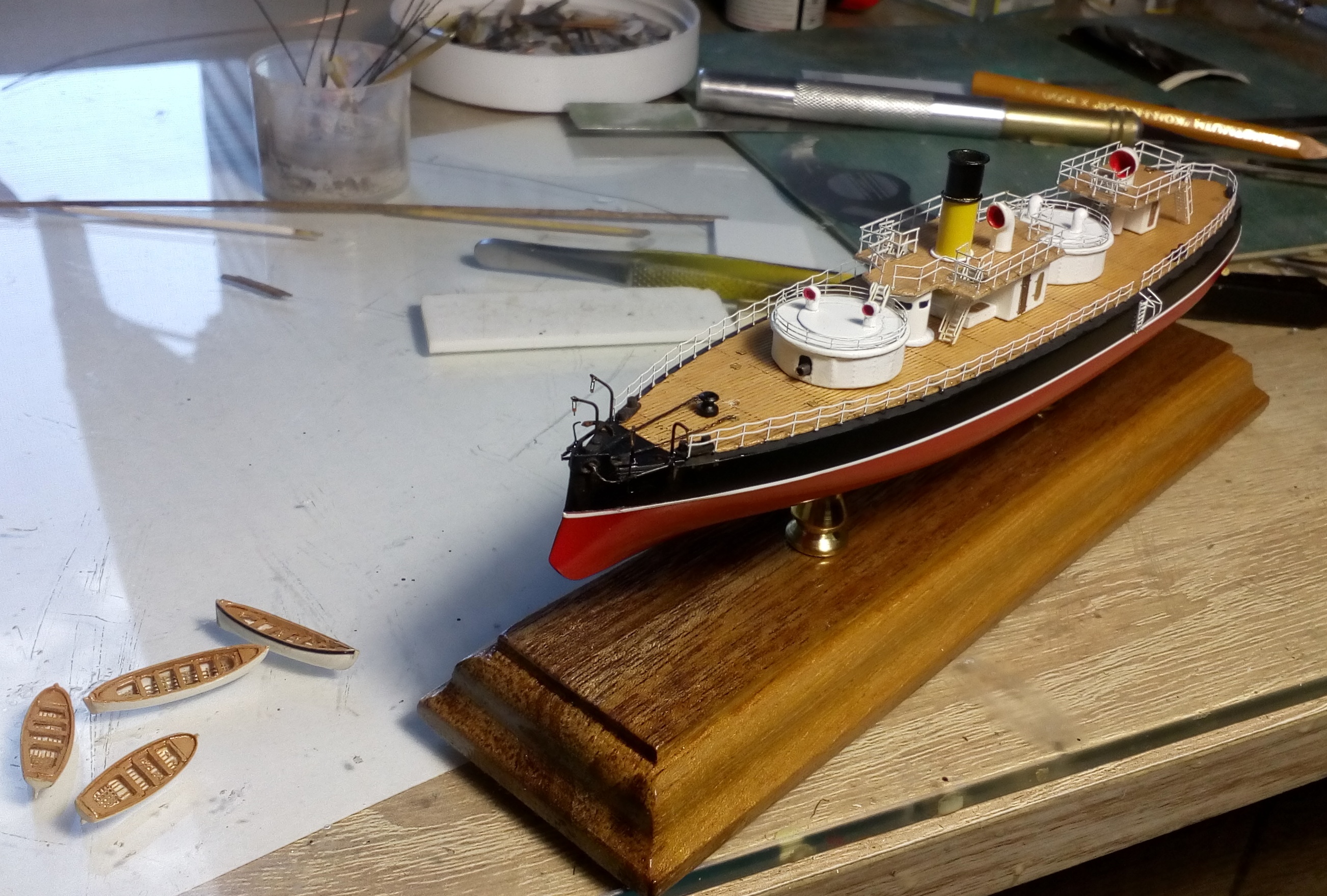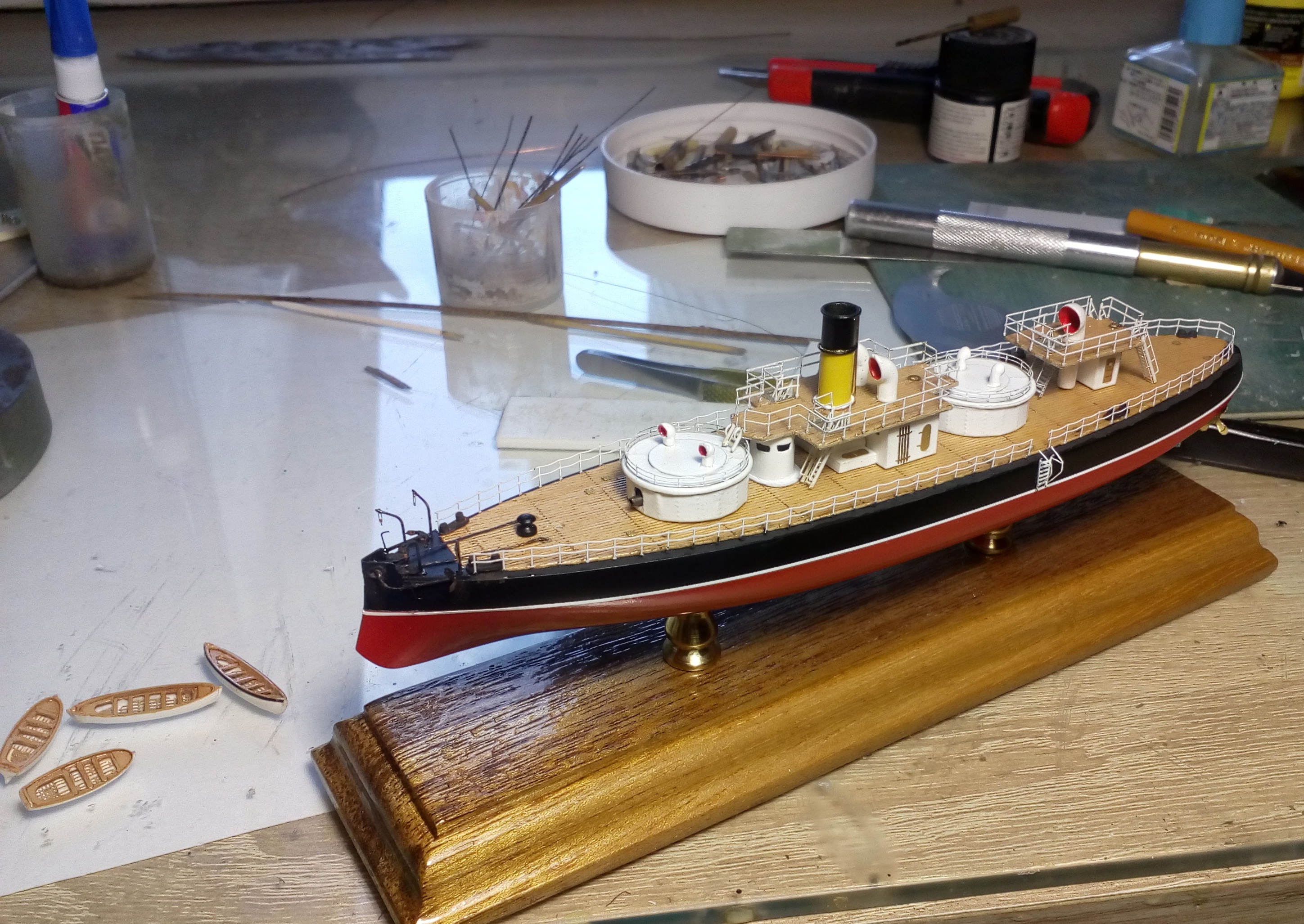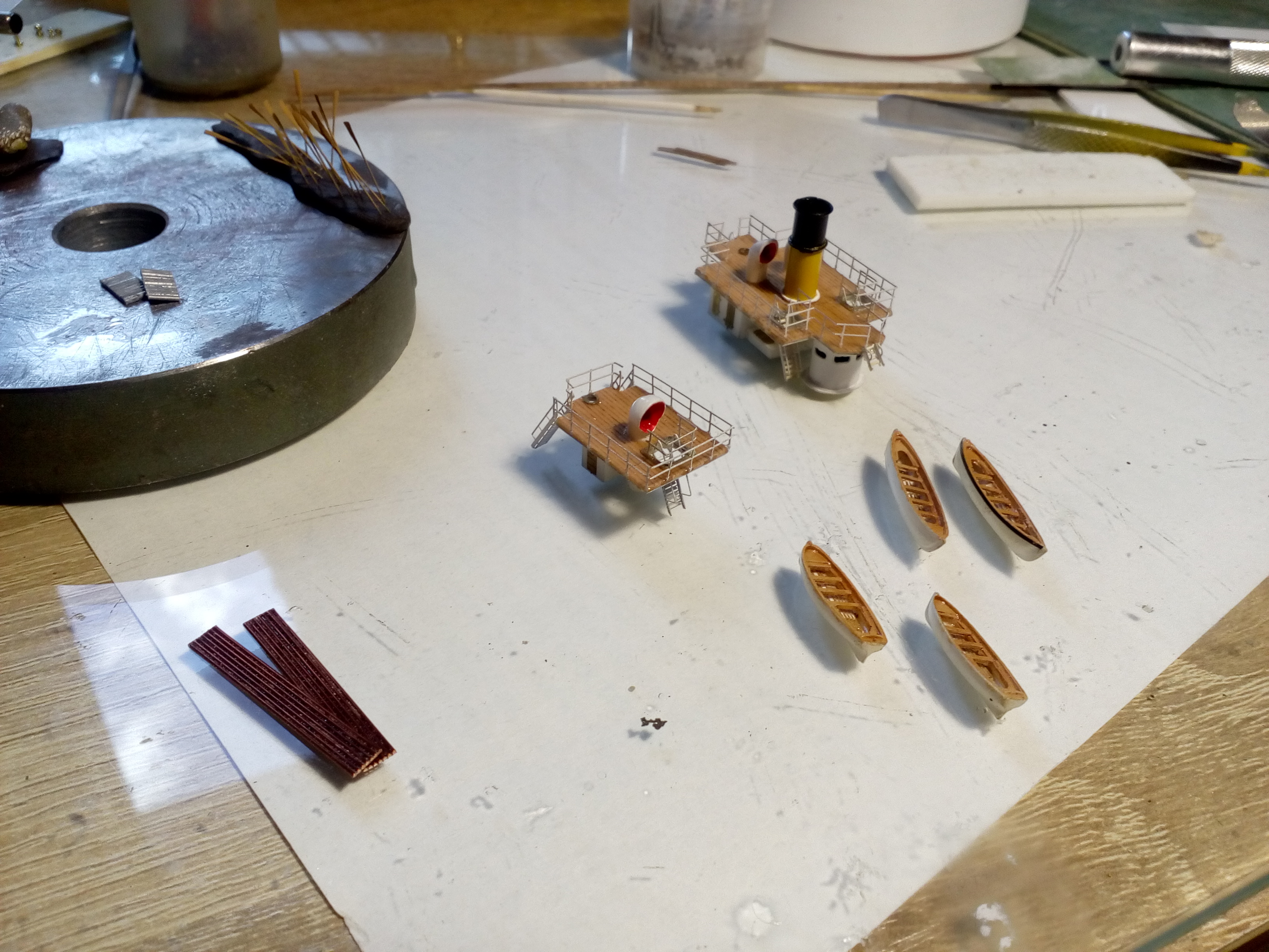 Очередное обновление по стройке. За три дня сделал надстройки, якоря со шпилем и шлюпки. И примерял на палубу, в связи с окончанием запасов фототравления якоря из медной проволоки, а весла из латунной 0,2мм диаметром. Пол дня промучился как всегда с койками, так ничего нормального и не получилось.