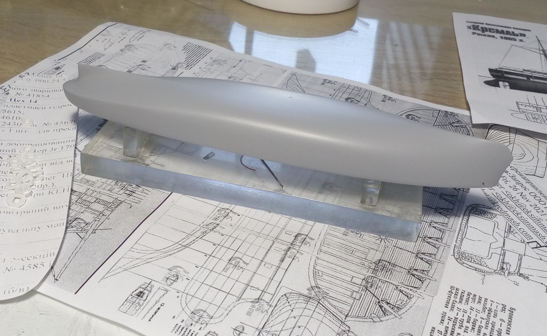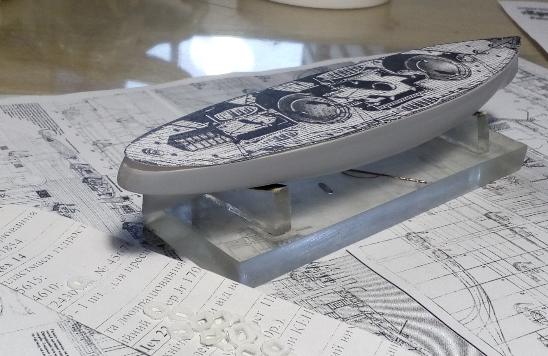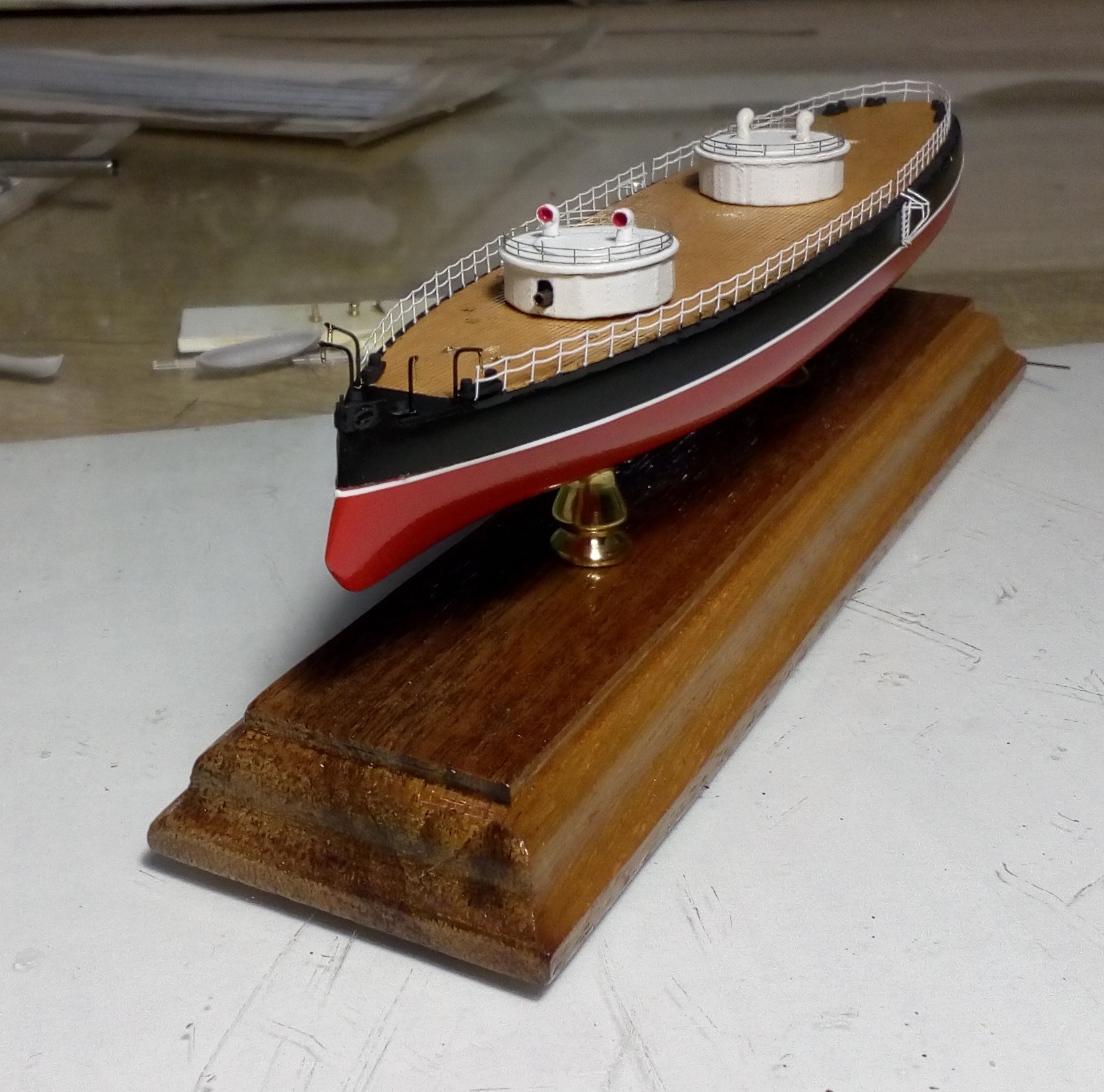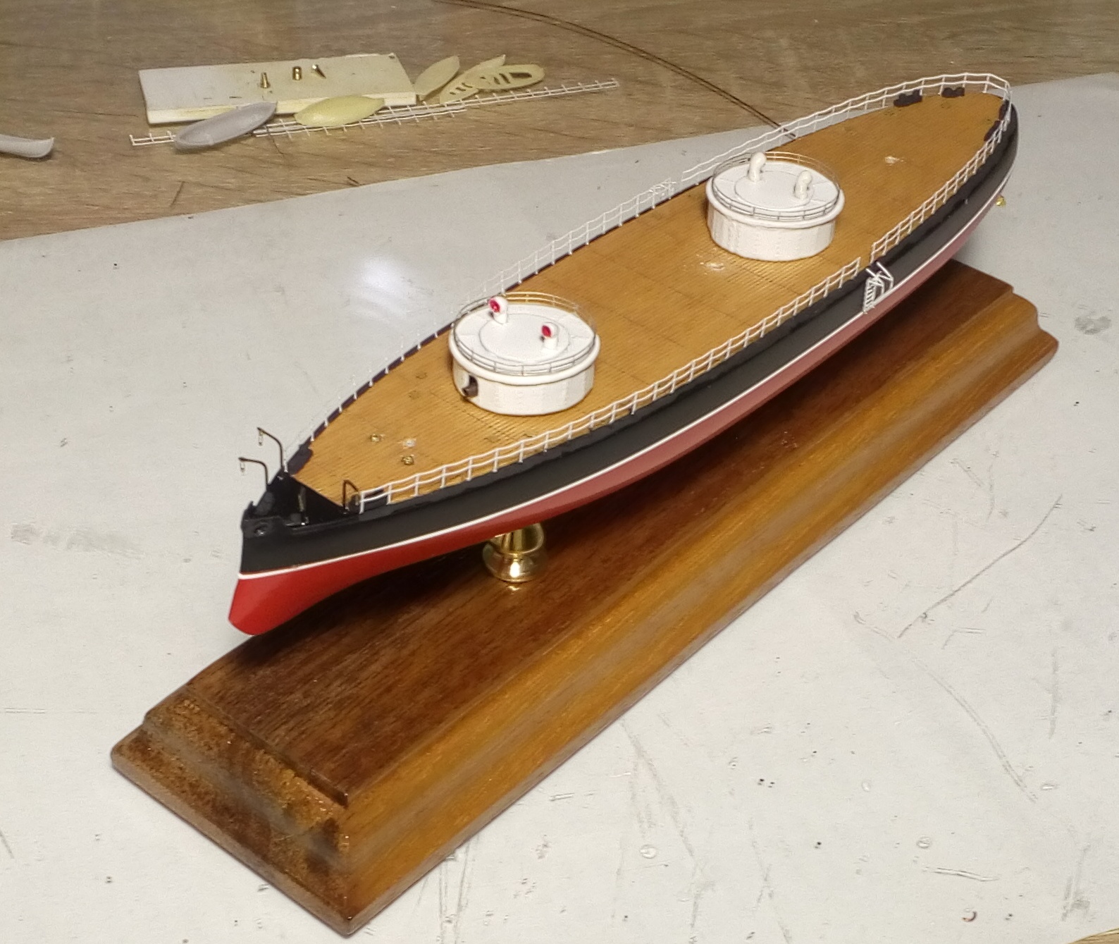 Очередное продвижение вперед. Установлены гребные винты, якорные шлюпбалки, леерное ограждение и кнехты с киповыми планками.